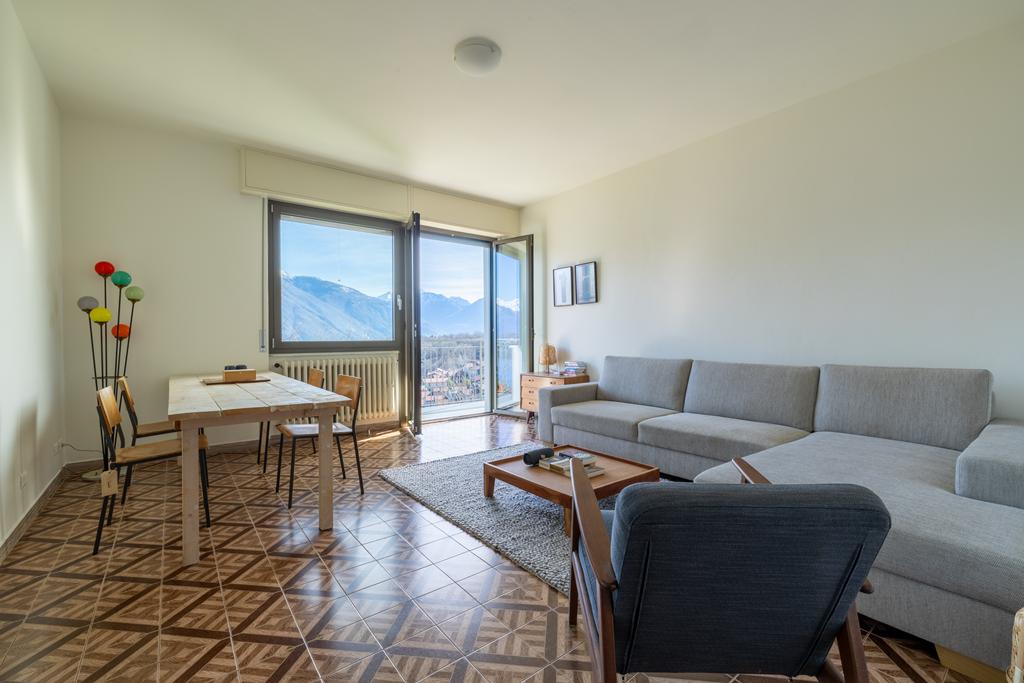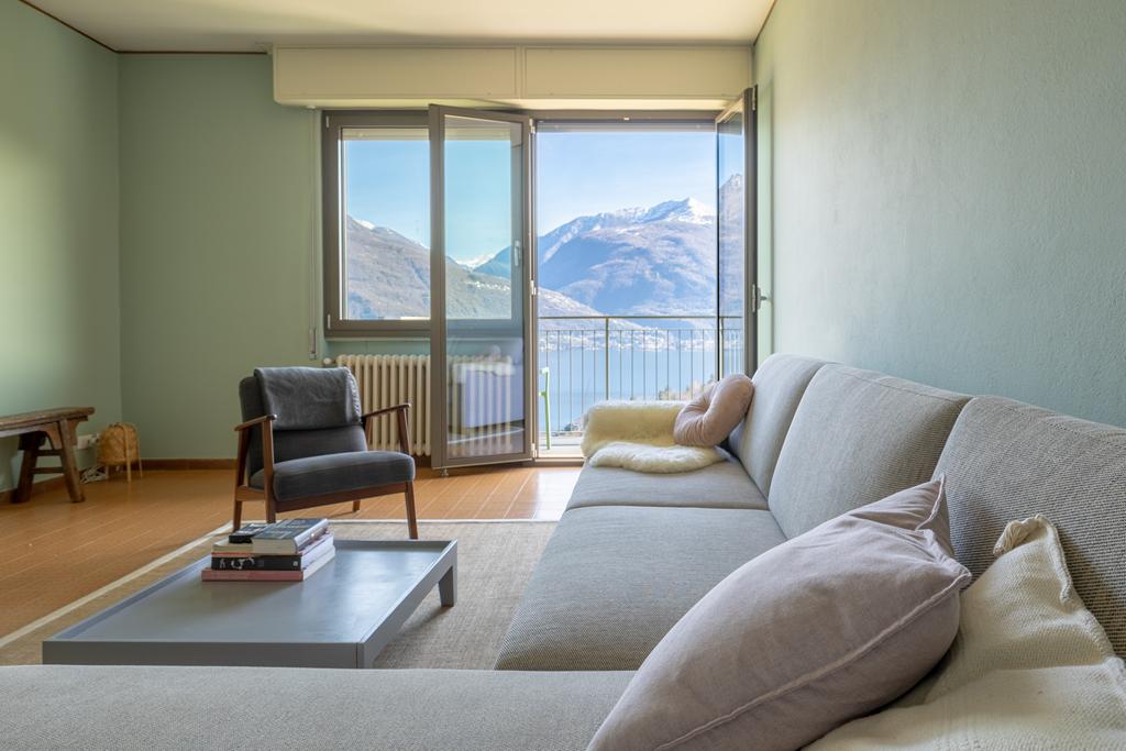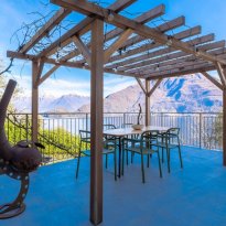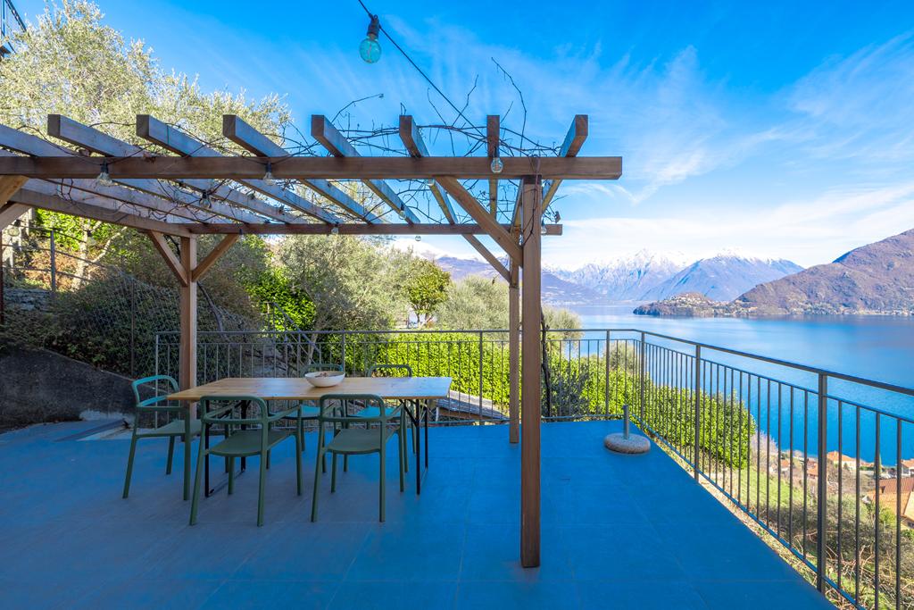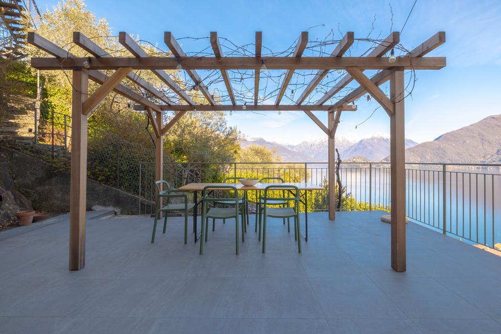 entrance, a kitchen, a spacious bright living room with access to the large balcony overlooking the lake, 2 bedrooms, 2 bathrooms and storage rooms. Next to the apartment is a beautiful large terrace with pergola, a lovely quiet place with privacy, to enjoy balmy summer evenings at a long table with family and friends and the unimaginably beautiful views of the lake and mountain peaks.