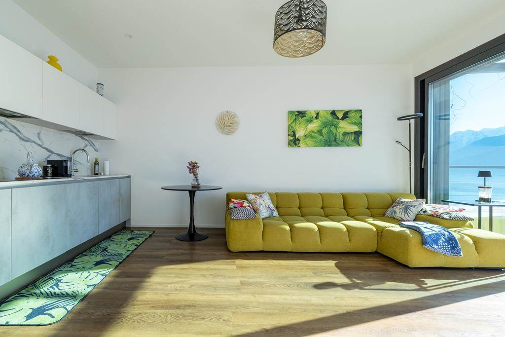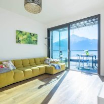 The property consists of a living room with open kitchen, large panoramic windows with stunning views of the lake and mountains, two bedrooms and two bathrooms.