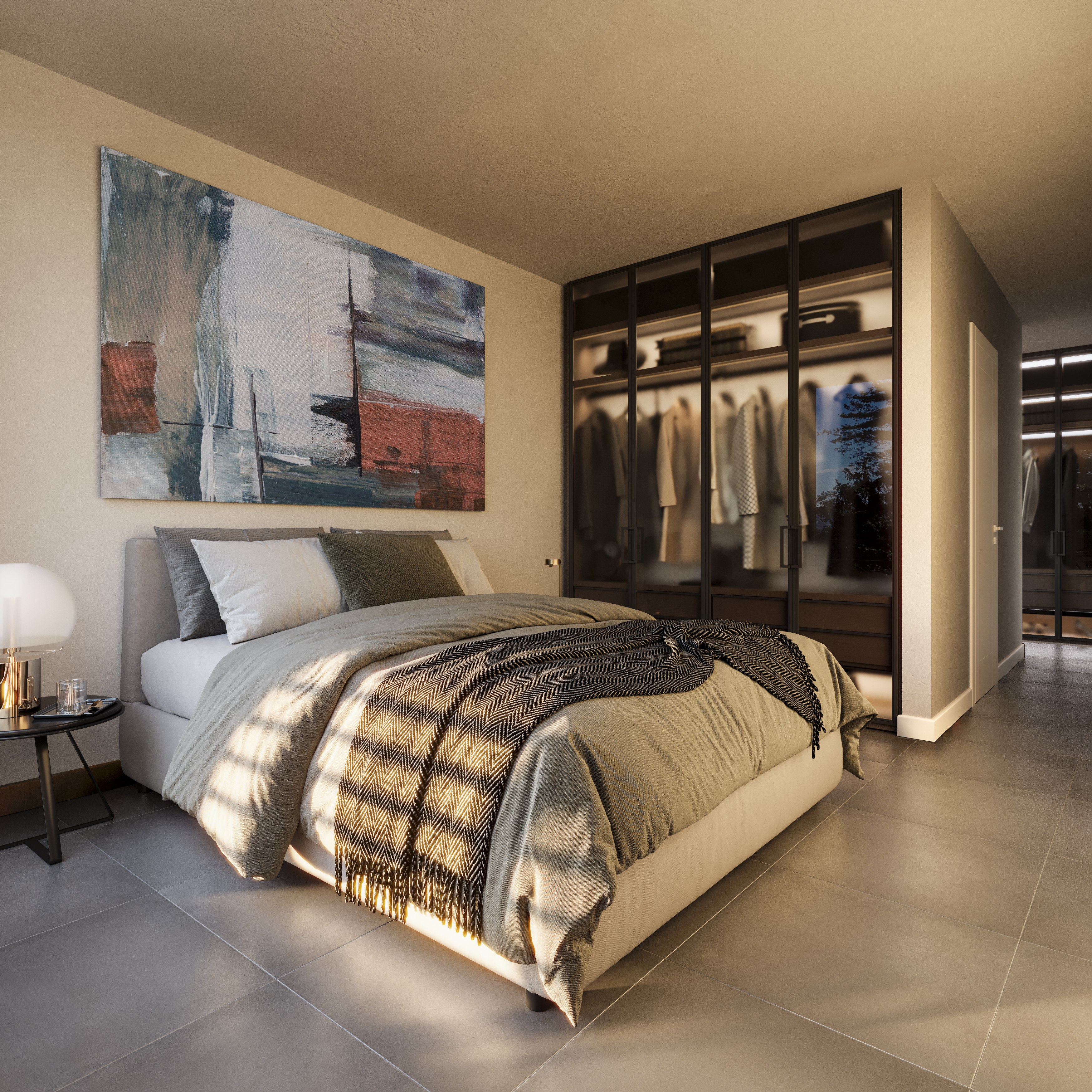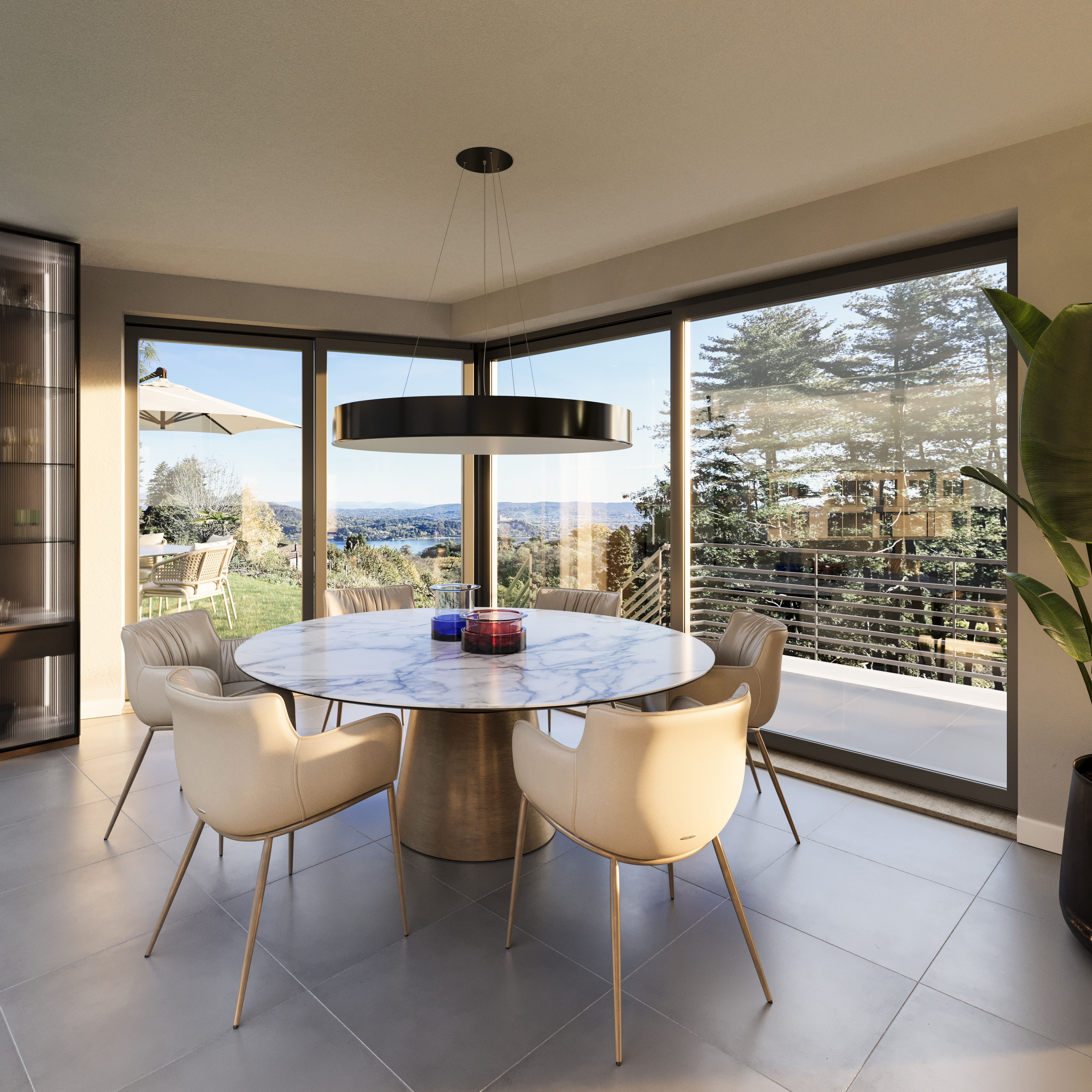 The first floor is entirely dedicated to the living space, conceived as a large open space with living room, dining room and kitchen, all equipped with large sliding doors overlooking the lake. These provide exceptional light and a natural connection to the outdoor spaces. Furthermore, this floor includes a guest toilet, the master bedroom with en-suite bathroom and walk-in wardrobe, as well as two additional bedrooms.