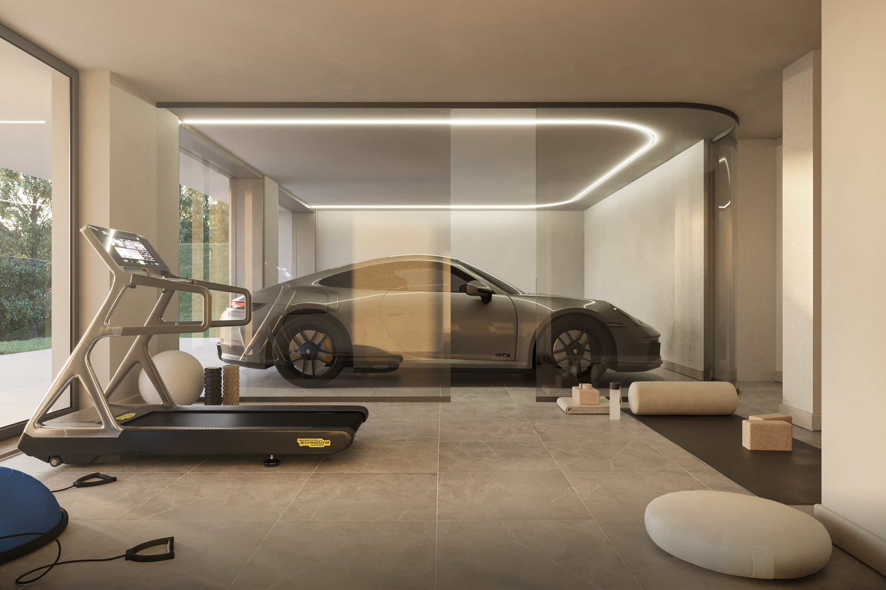 On the ground floor, the current project provides a spacious tavern, a bedroom with walk-in wardrobe and en suite bathroom, a storage room, an additional guest toilet, a sauna and a gym. The same level also houses a practical double garage side by side.