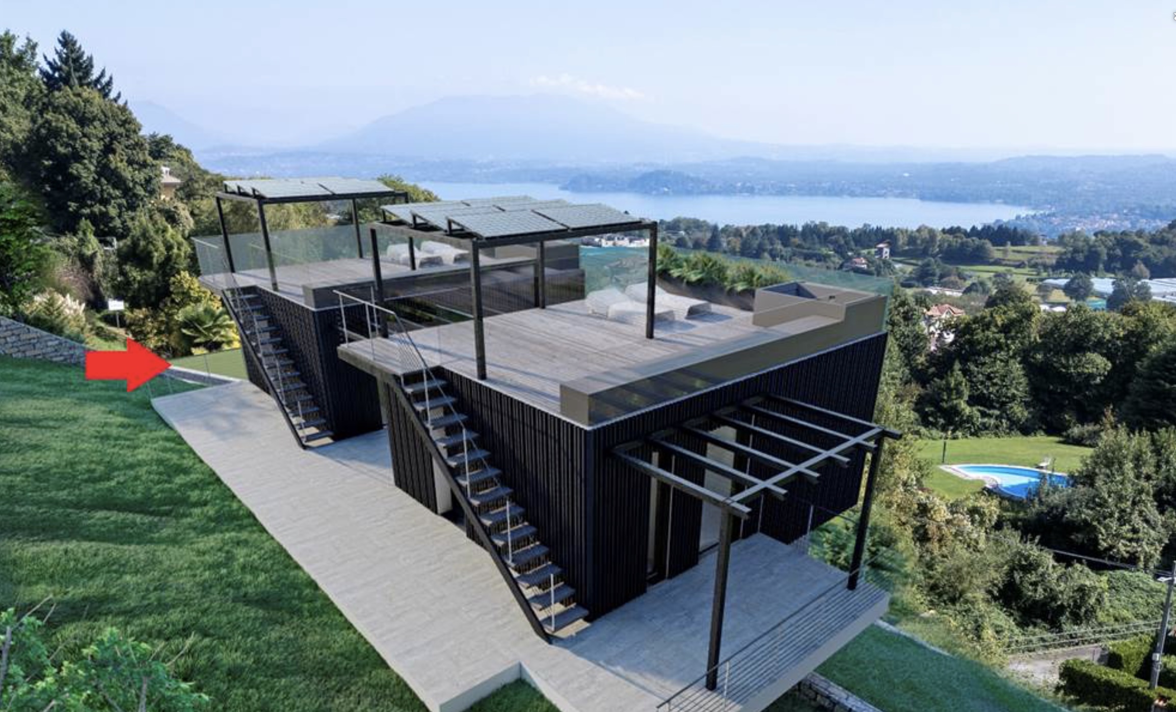 The house is characterised by clean lines and large panoramic windows with breathtaking 180° views over the lake. The generous glass areas, floating geometric volumes and use of natural materials create a perfect balance between aesthetics and functionality, fully integrated into the hilly landscape.