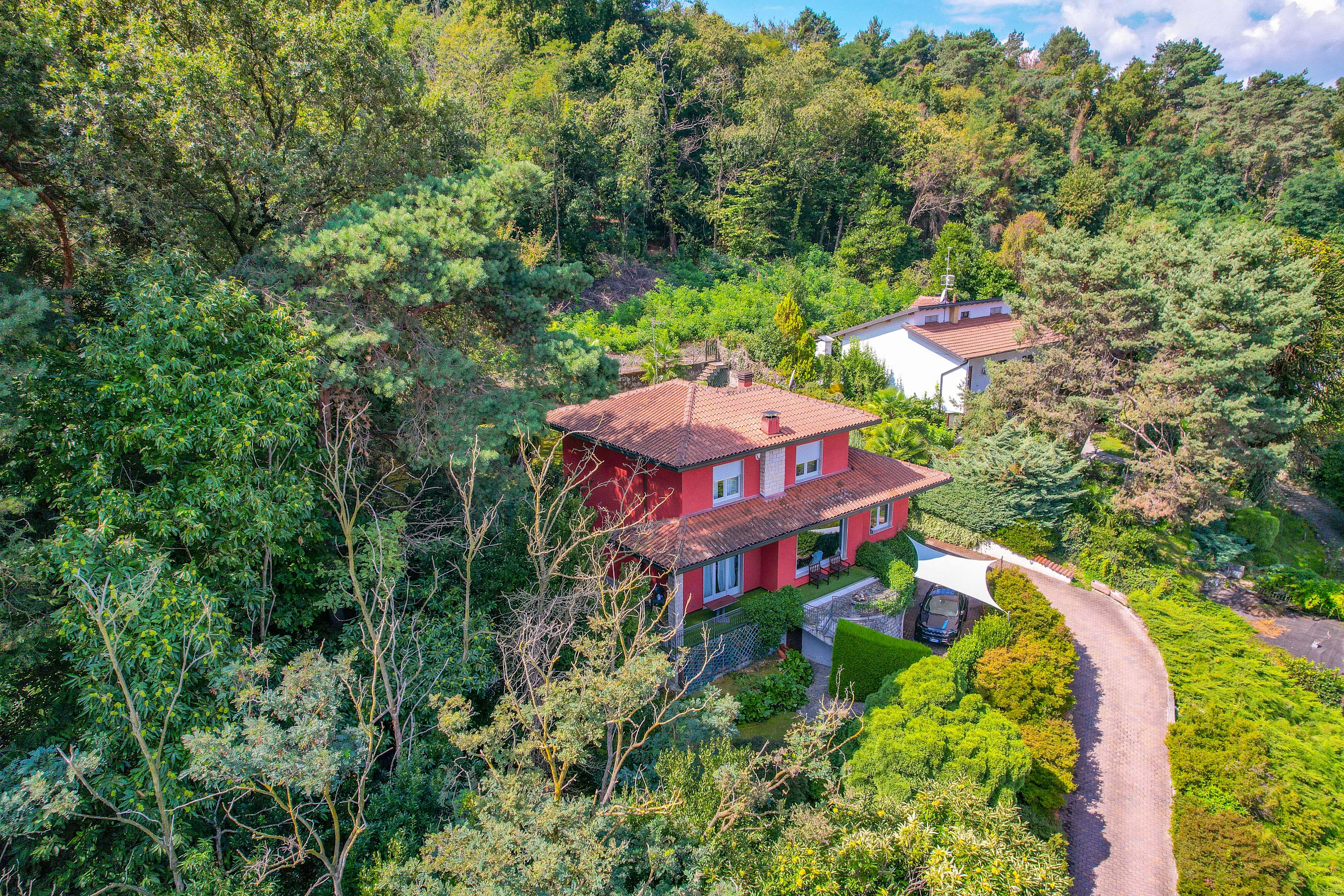 The villa, with an area of about 210 m², extends over three floors and features spacious indoor and outdoor areas. From the main entrance, an elegant driveway leads to the double garage and outdoor parking spaces.