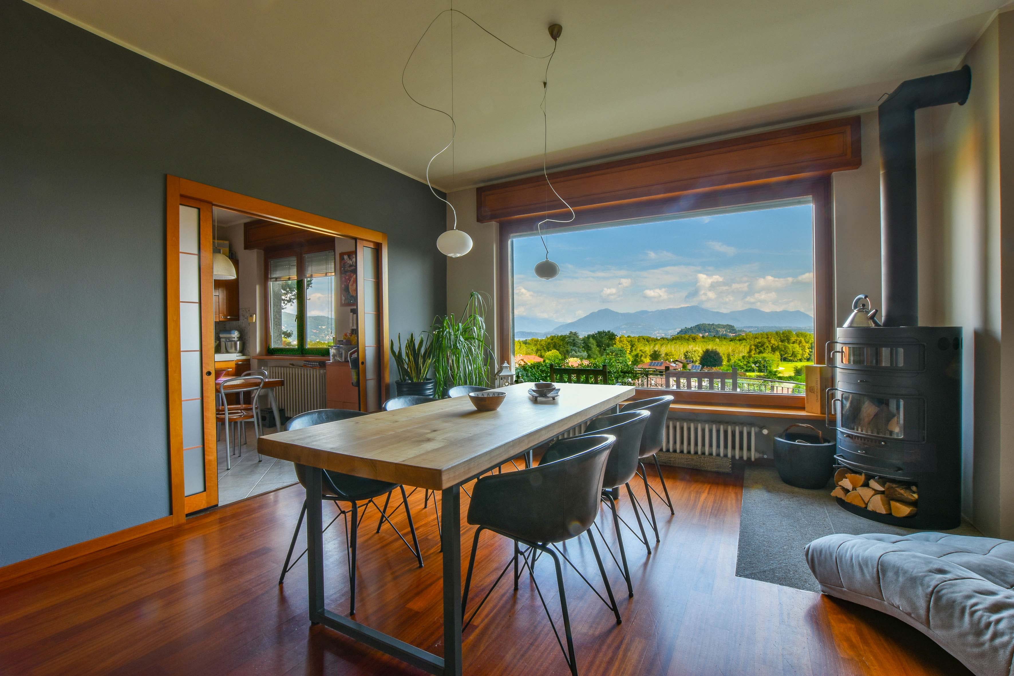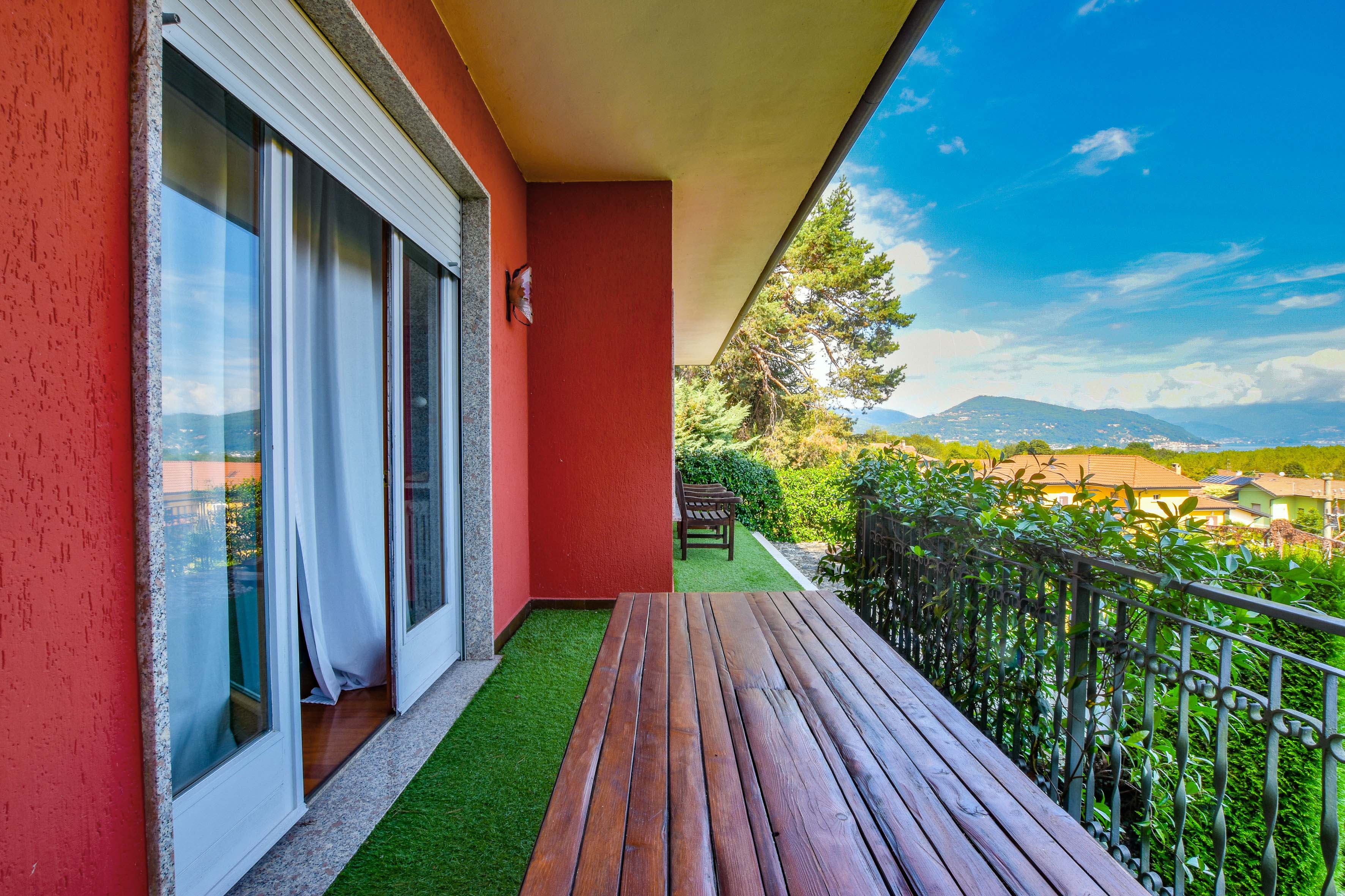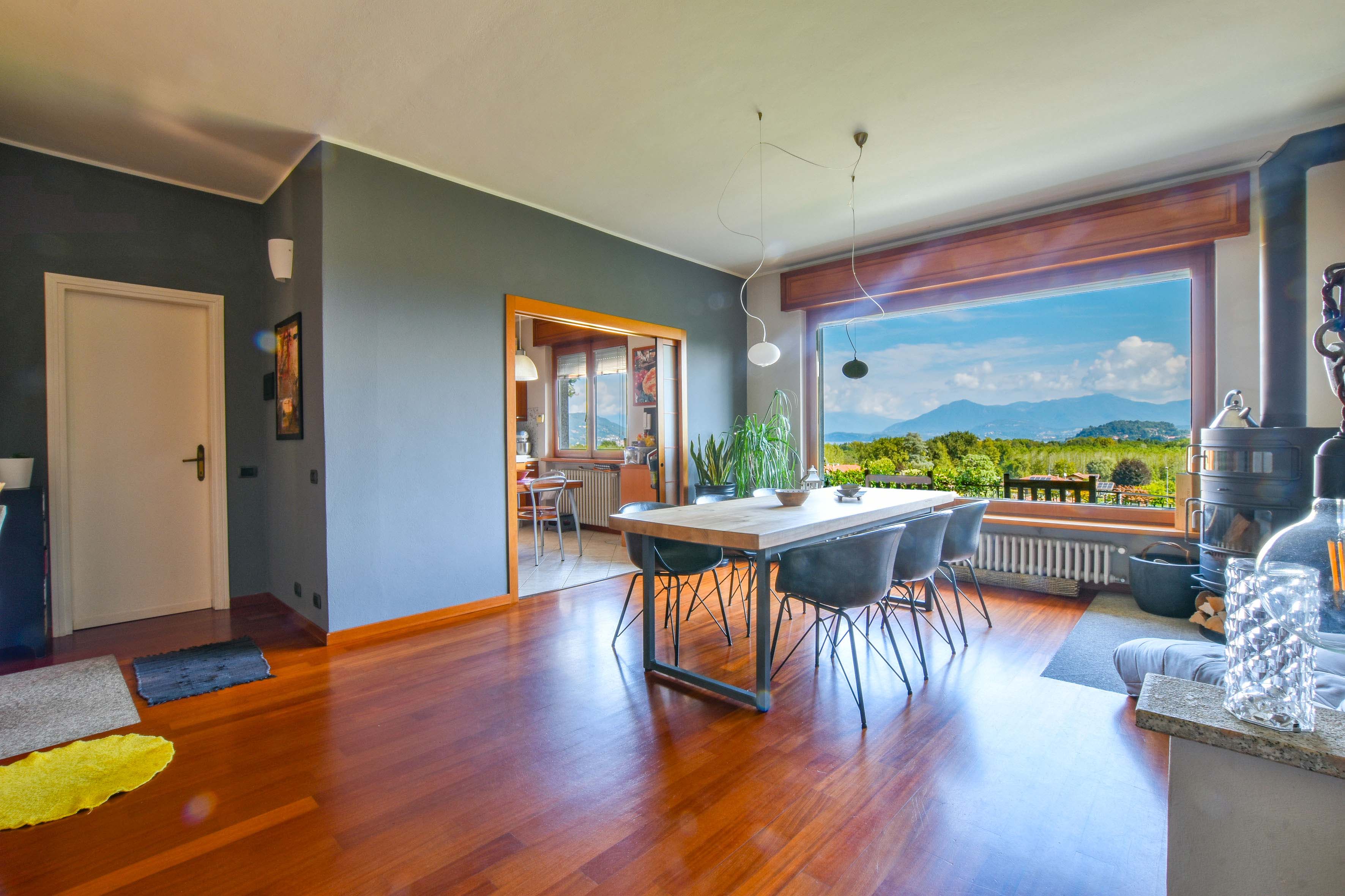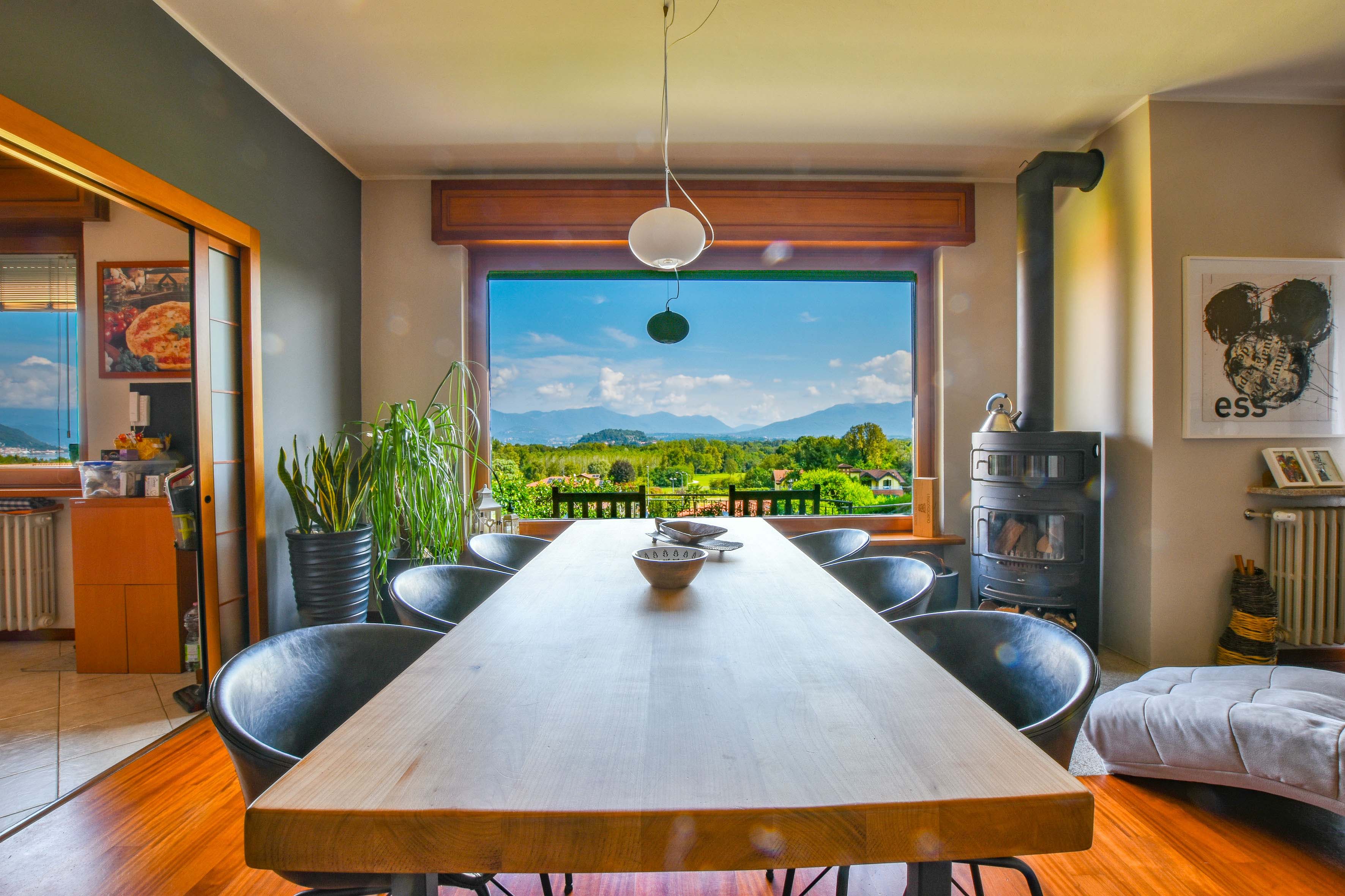 On the ground floor is a separate kitchen diner, separated by elegant sliding doors. There is also a spacious living room with dining and sitting area, enriched by a wood-burning stove - an ideal place for gathering and relaxation, illuminated by natural daylight streaming in through the large windows. From here one has access to the balcony, which offers spectacular views over Lake Maggiore and the surrounding countryside. The floor is completed by a double bedroom overlooking the rear garden and a bathroom.