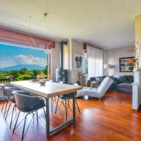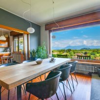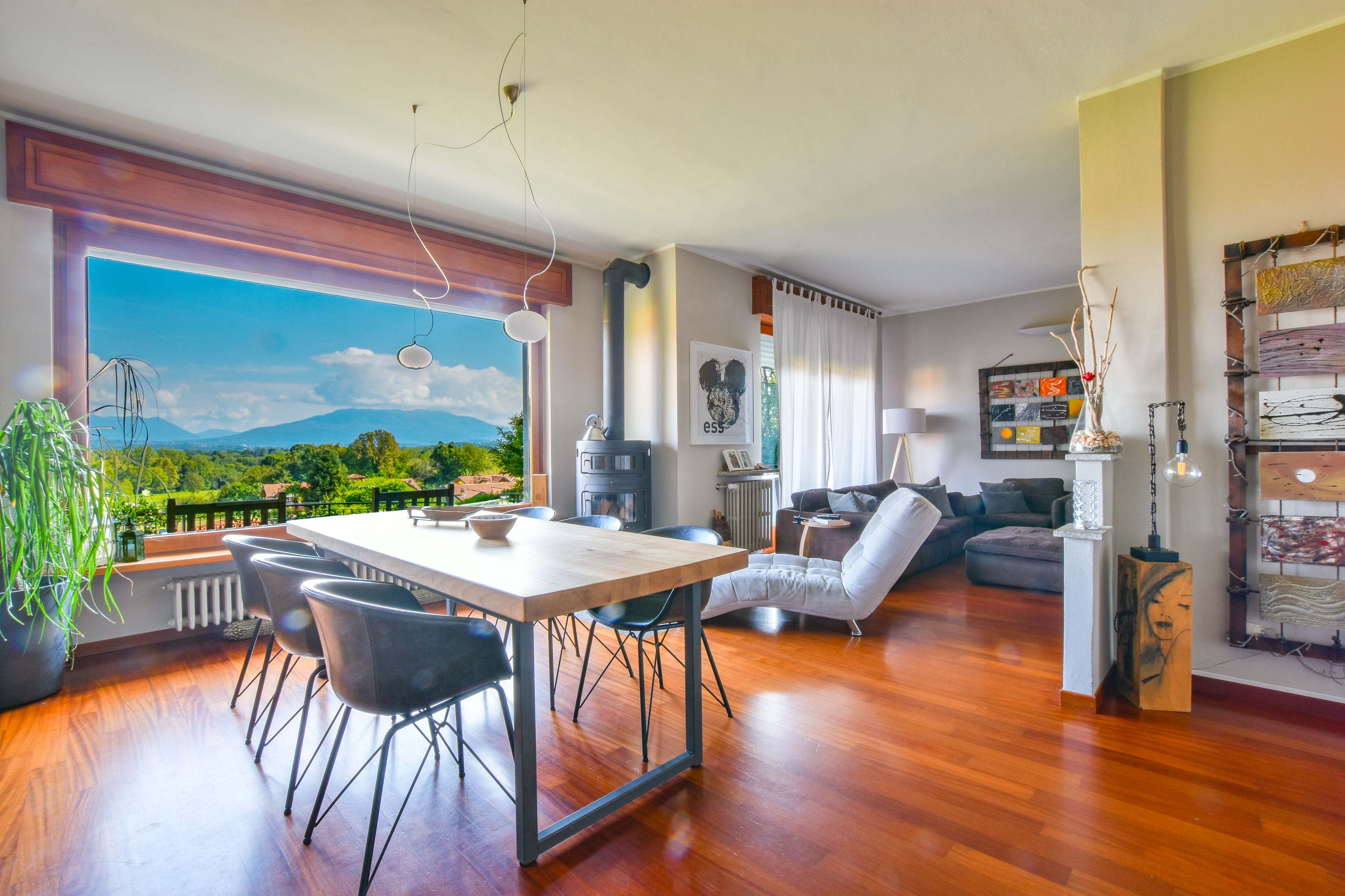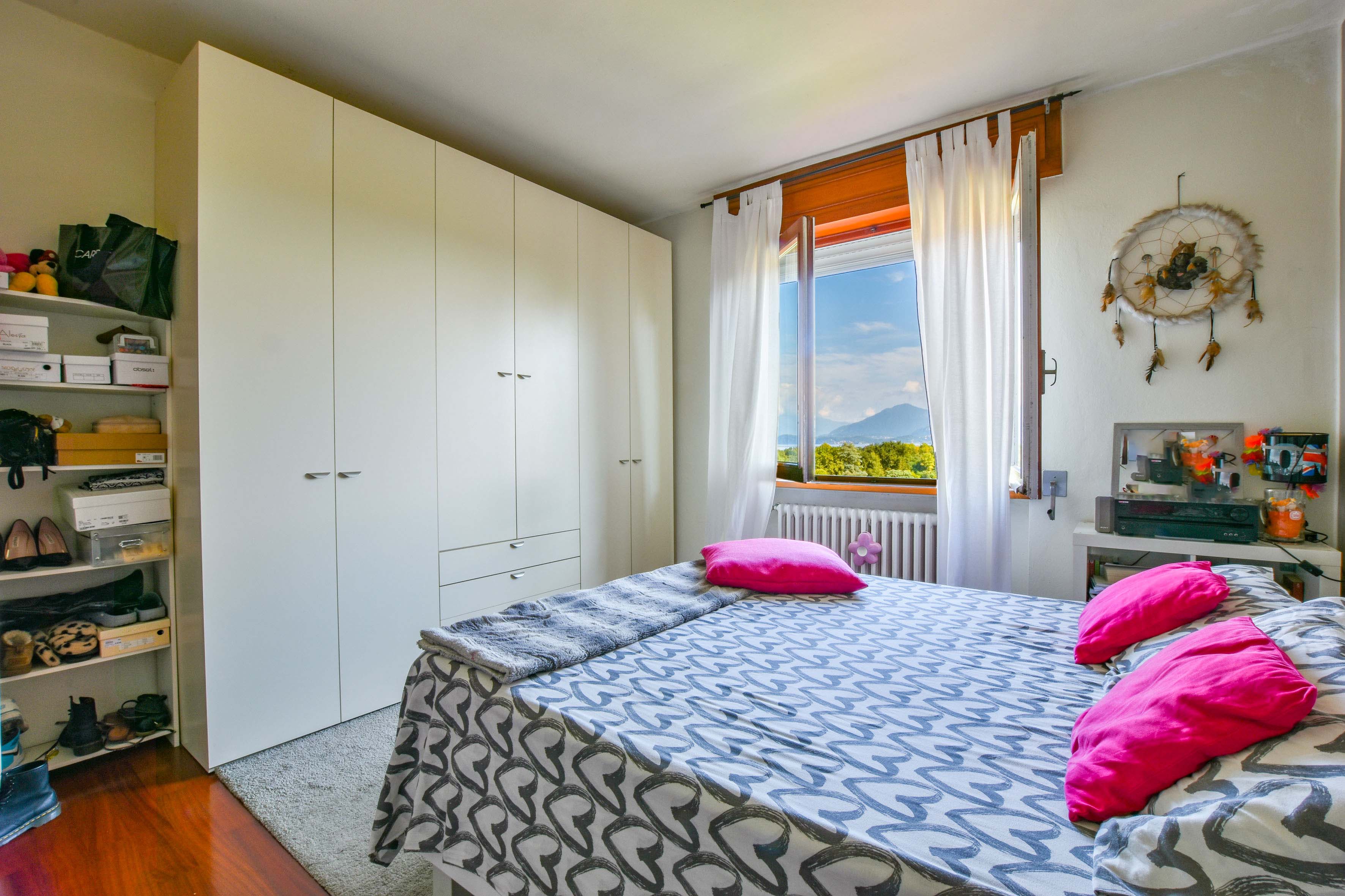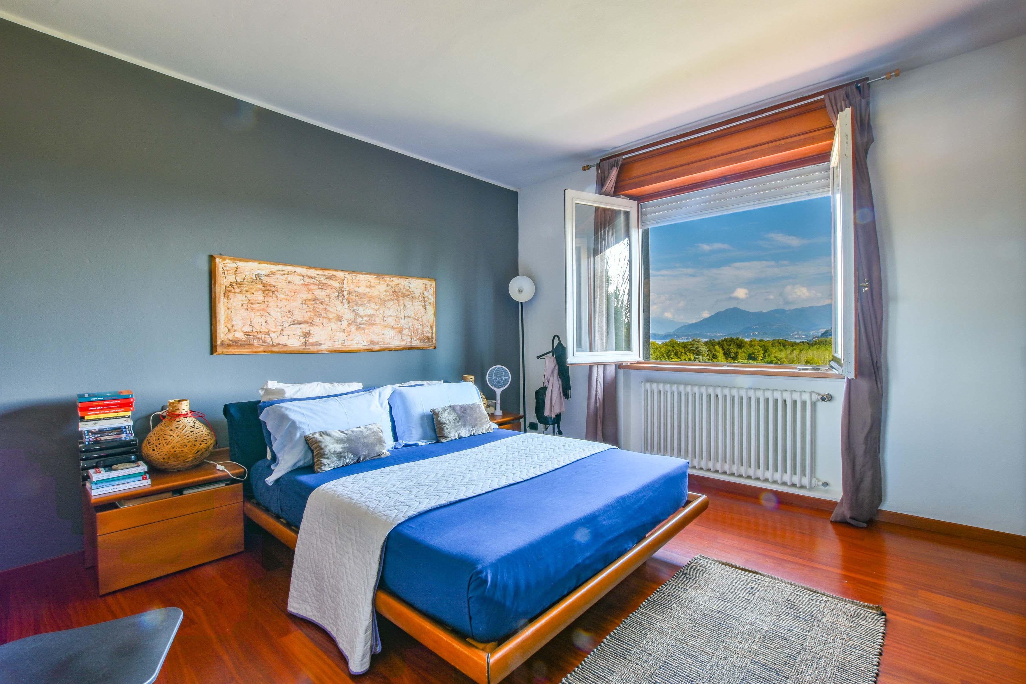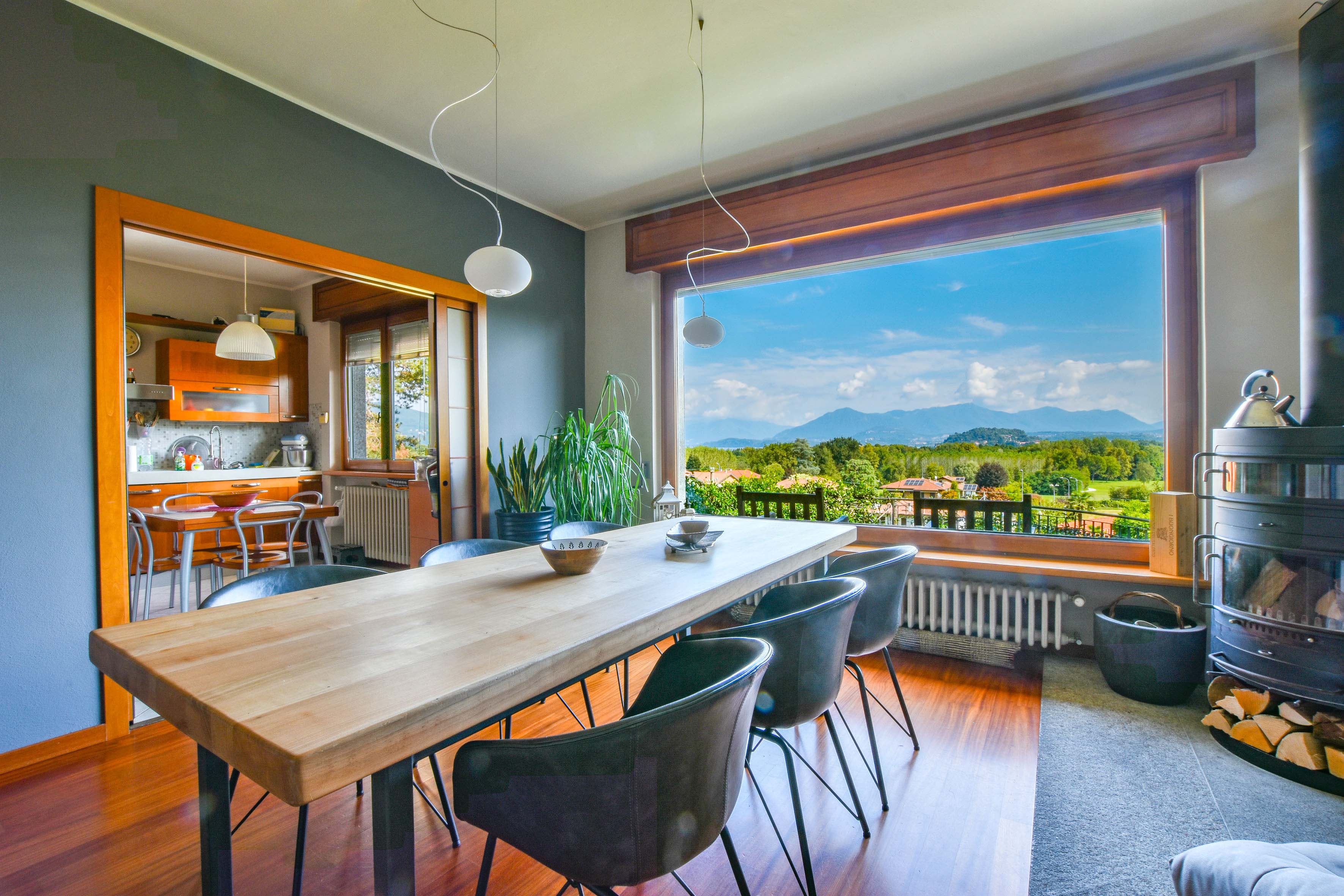 On the ground floor is a separate kitchen diner, separated by elegant sliding doors. There is also a spacious living room with dining and sitting area, enriched by a wood-burning stove - an ideal place for gathering and relaxation, illuminated by natural daylight streaming in through the large windows. From here one has access to the balcony, which offers spectacular views over Lake Maggiore and the surrounding countryside. The floor is completed by a double bedroom overlooking the rear garden and a bathroom.