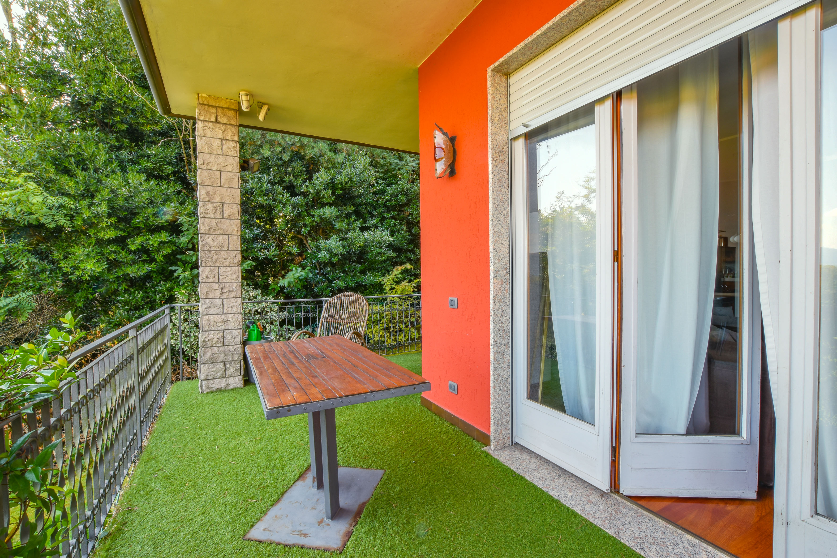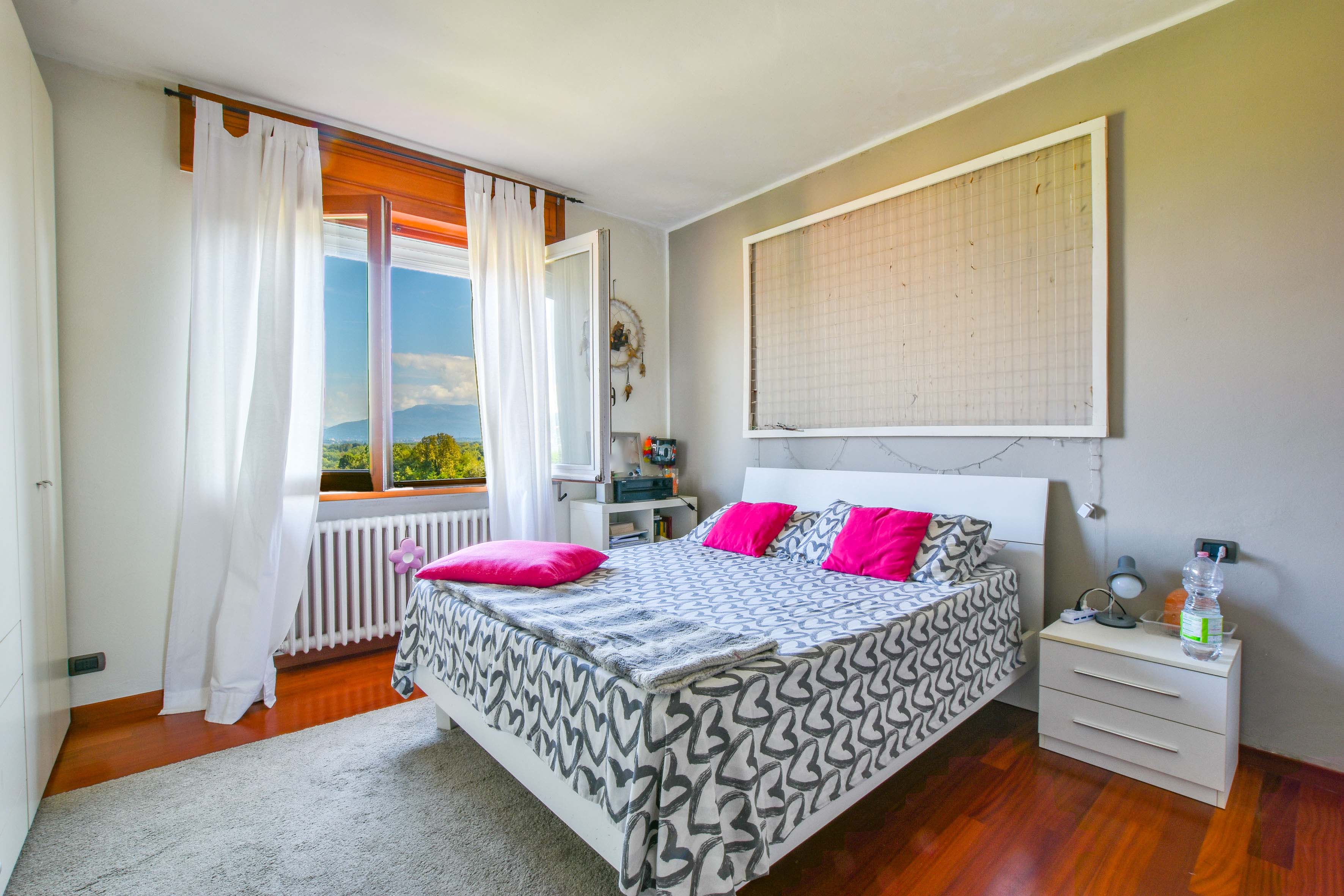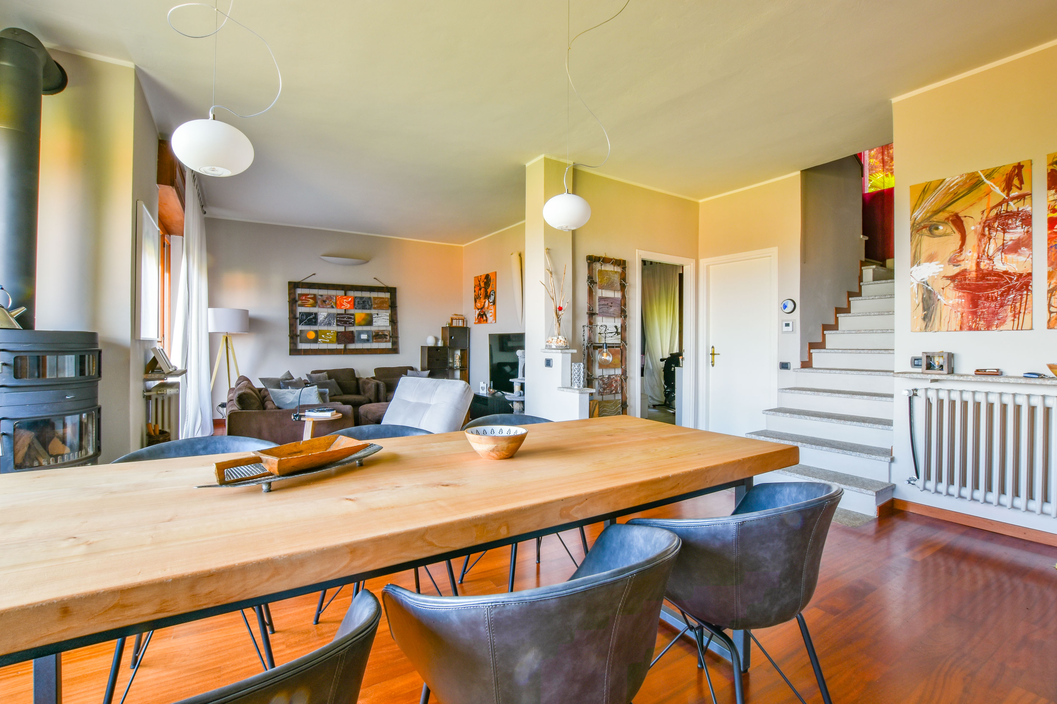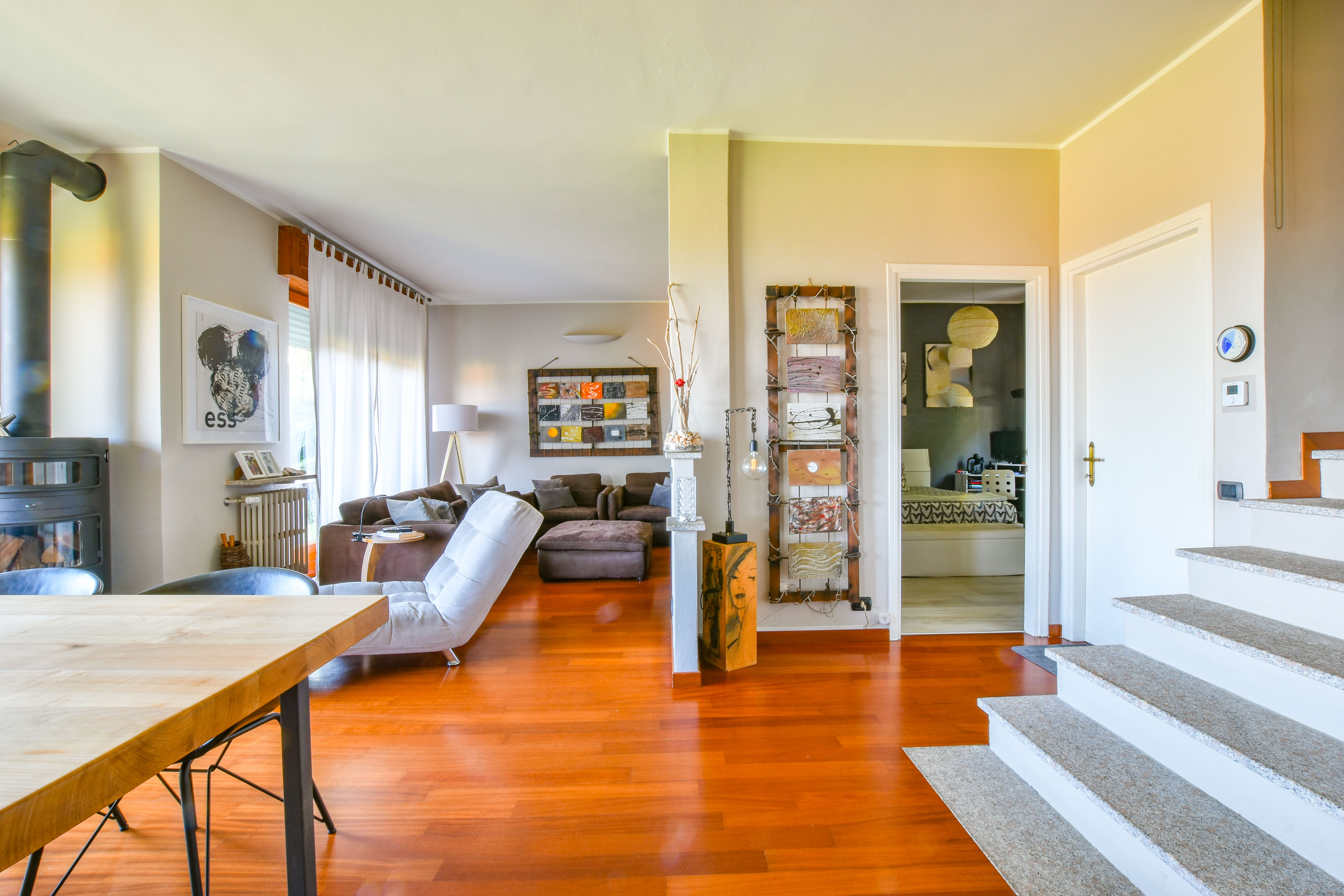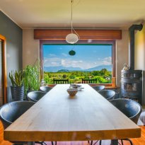 On the ground floor is a separate kitchen diner, separated by elegant sliding doors. There is also a spacious living room with dining and sitting area, enriched by a wood-burning stove - an ideal place for gathering and relaxation, illuminated by natural daylight streaming in through the large windows. From here one has access to the balcony, which offers spectacular views over Lake Maggiore and the surrounding countryside. The floor is completed by a double bedroom overlooking the rear garden and a bathroom.