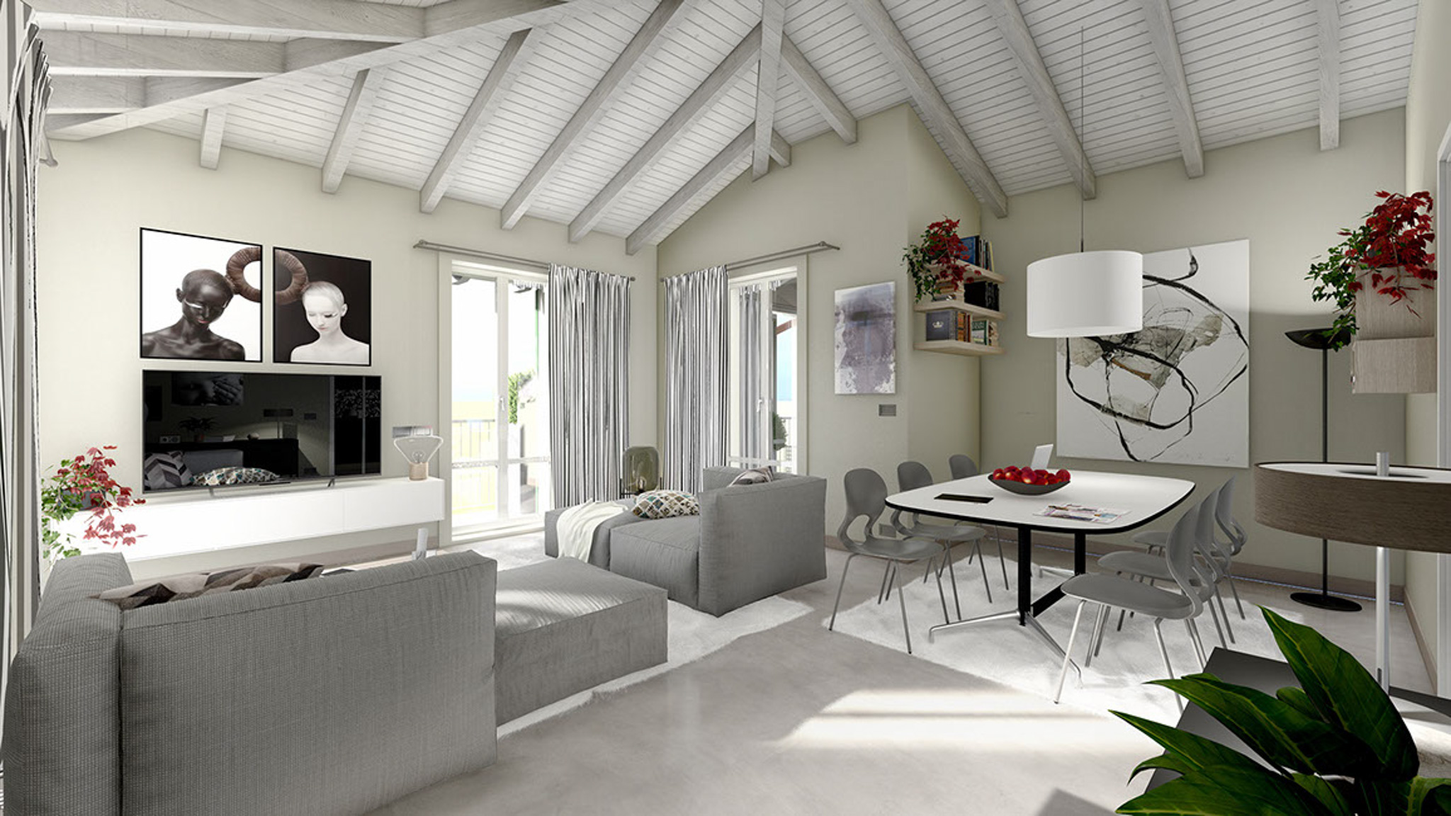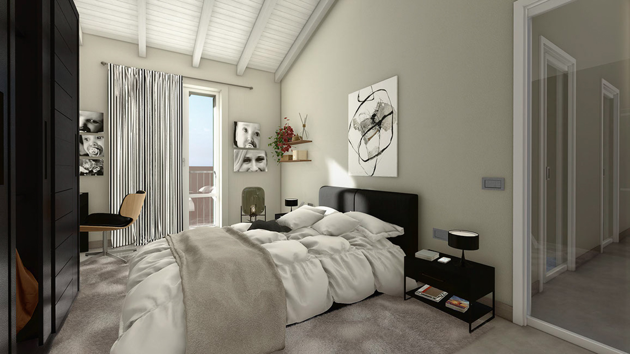 The penthouse stands out for its light and large terrace overlooking the lake, ideal for relaxing moments or alfresco dinners during the summer months. The spacious and inviting living space is directly connected to the outdoors and connects to a separate kitchen, designed for those who love well-organised and functional spaces.