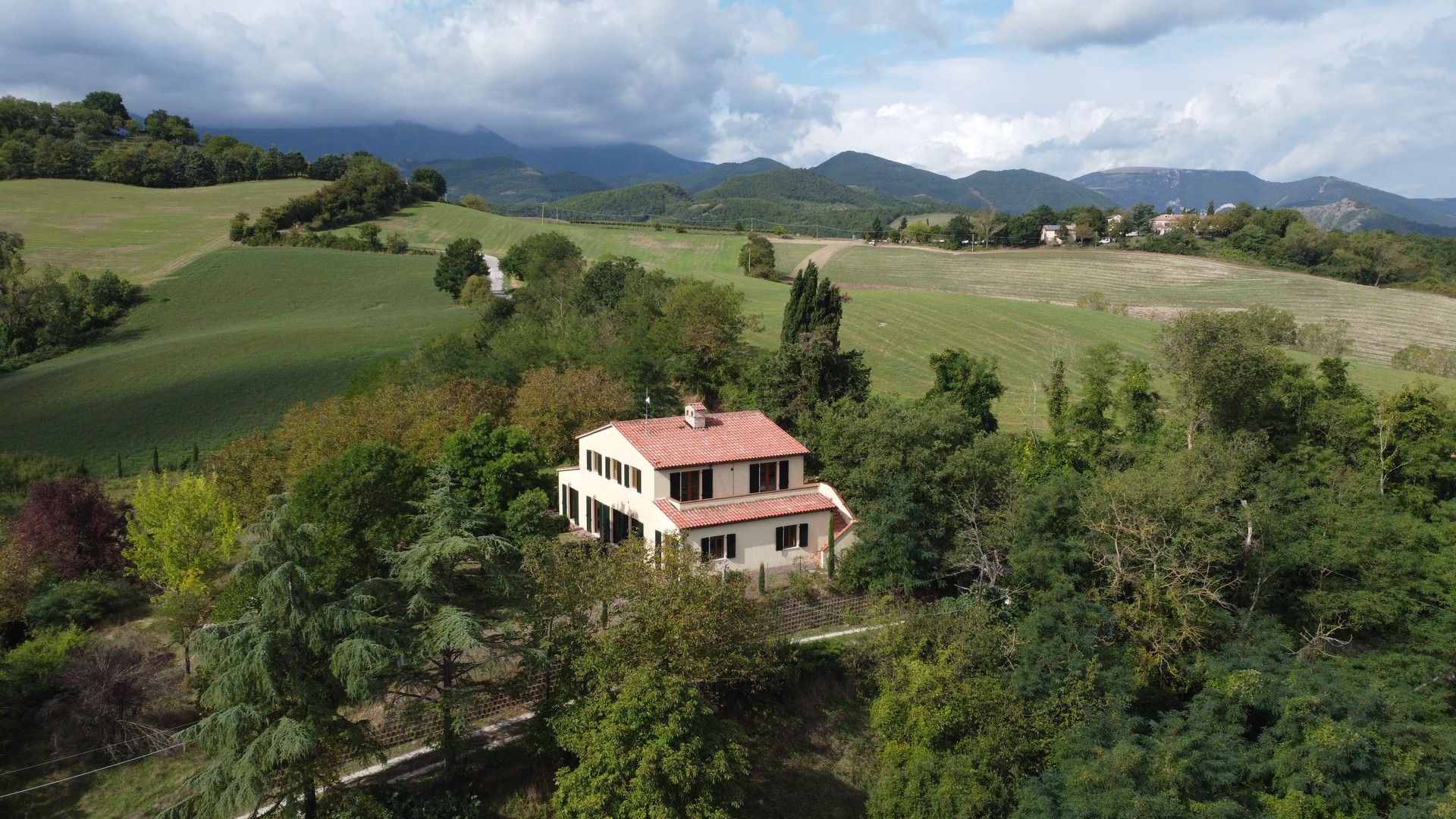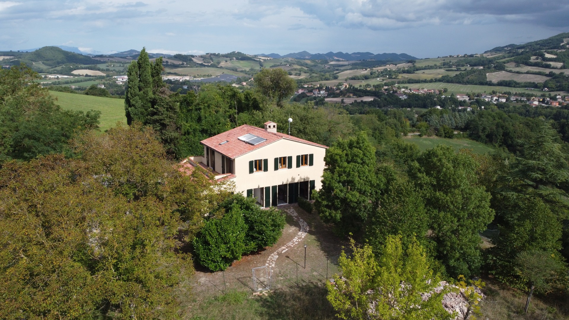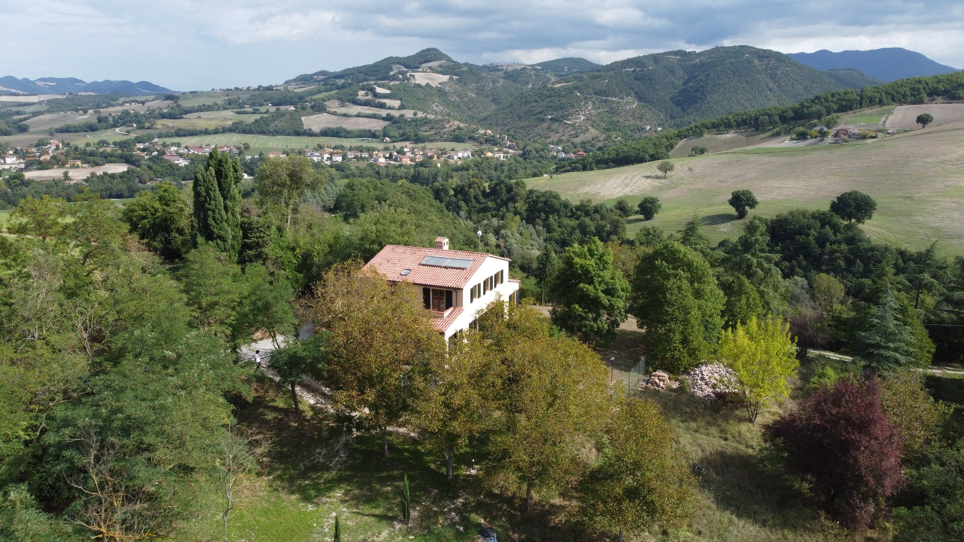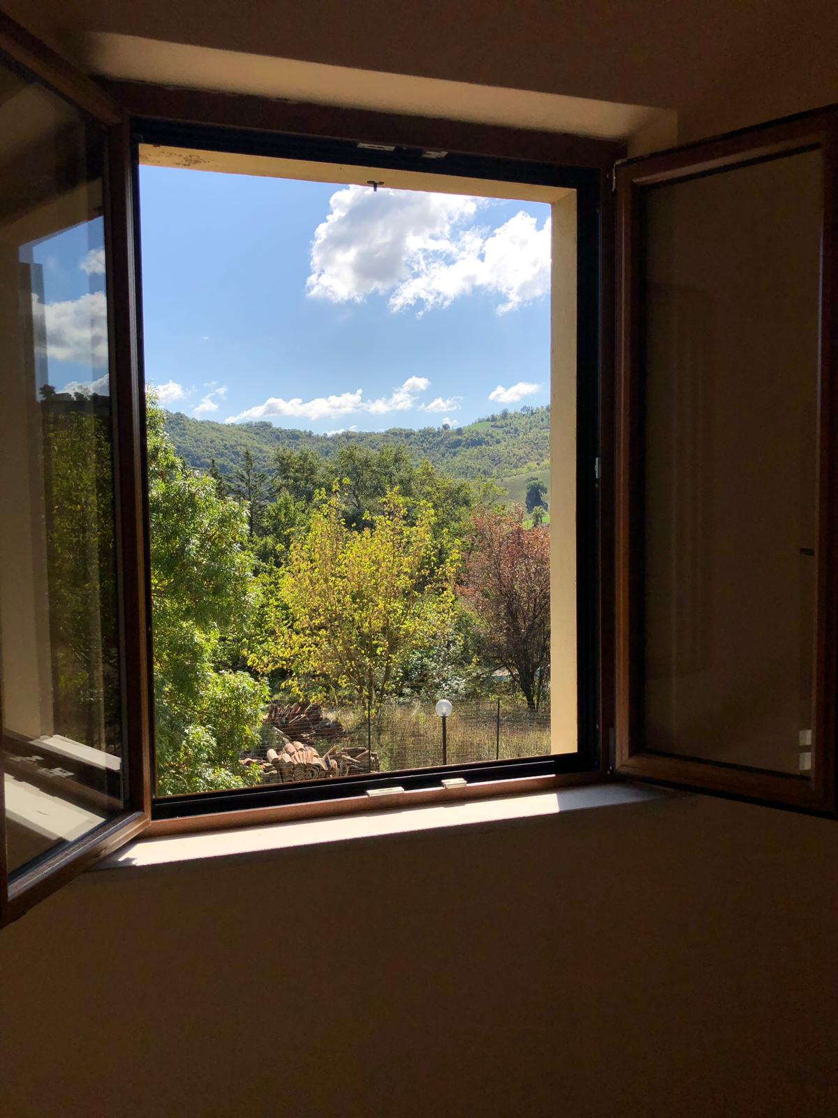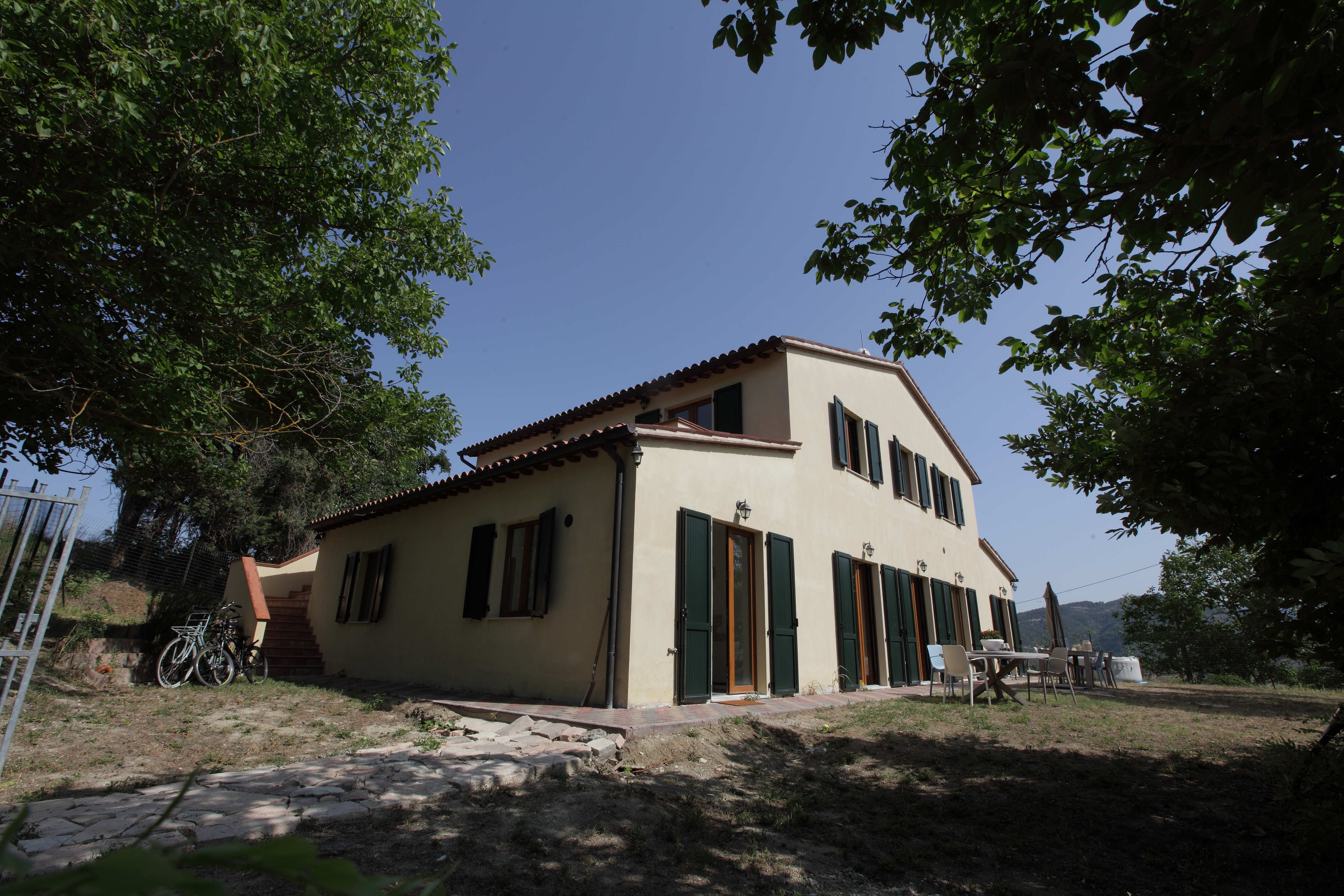 The house was completely renovated in 2004 with high-quality materials, including new PVC double-glazed windows, terracotta floors and an underfloor central heating system. The country house is surrounded by nature, with views of fields, hills and vineyards from the fully fenced garden. The location is easily accessible, the Adriatic Sea can be reached in just 45 minutes, and nearby are the beautiful historic Roman towns of Urbino, Cagli, Fossombrone and Acqualagna - the latter known for its truffles .