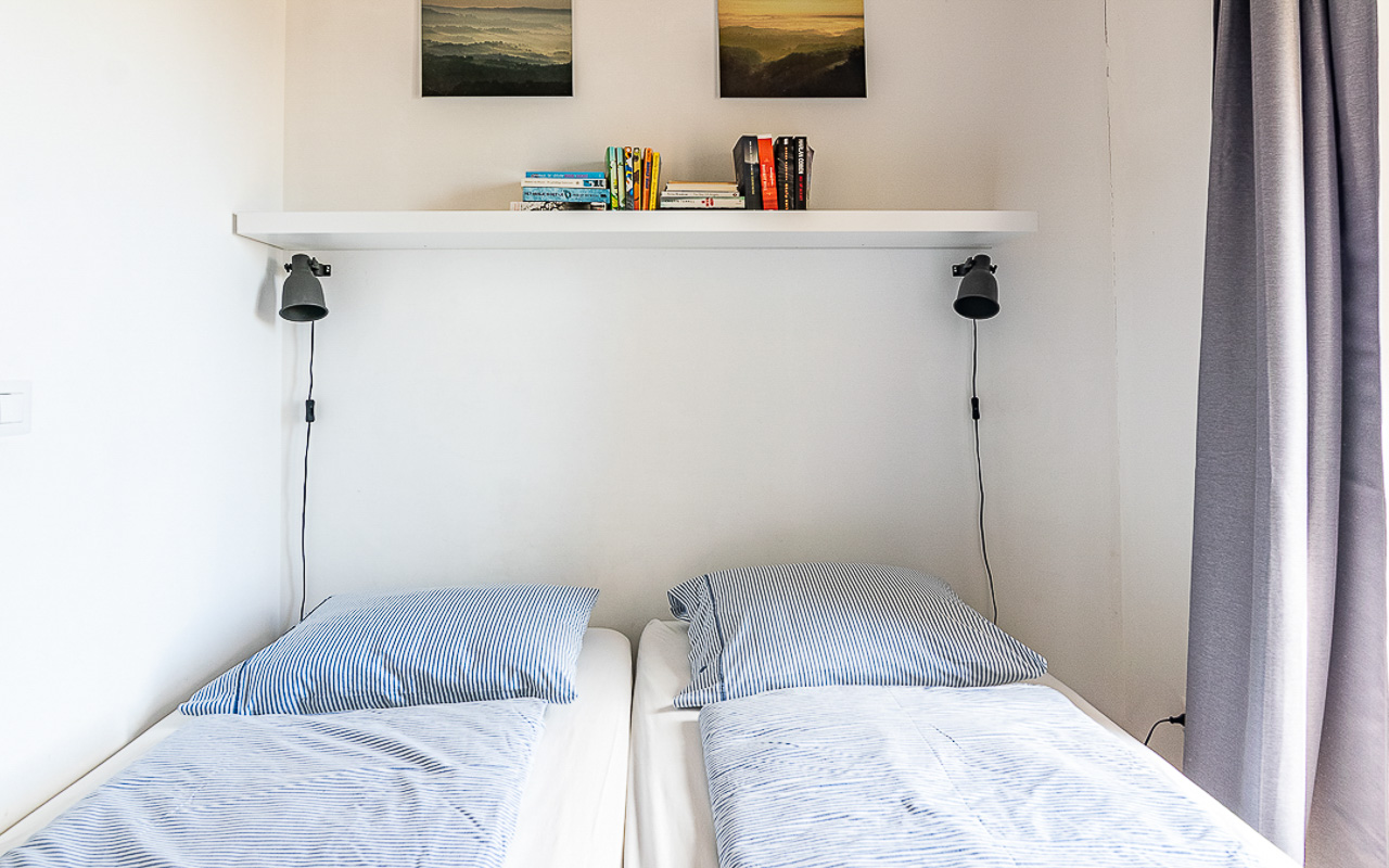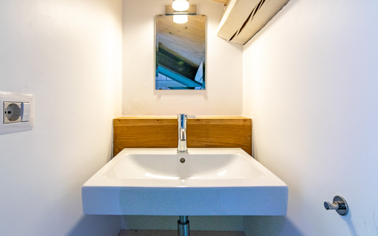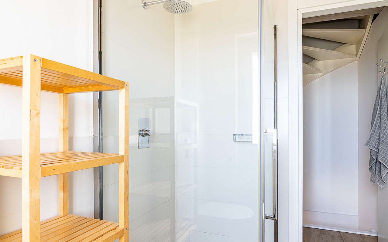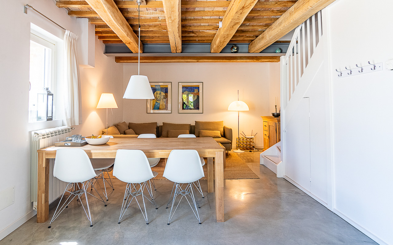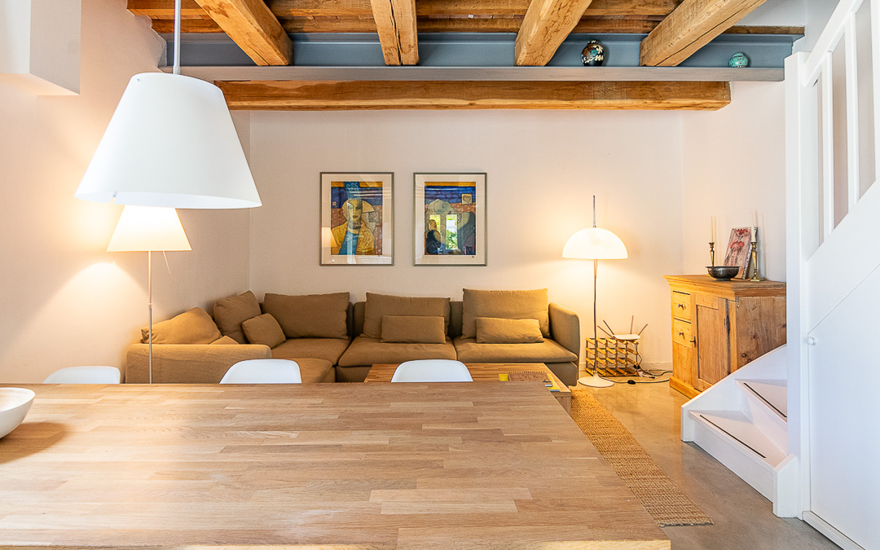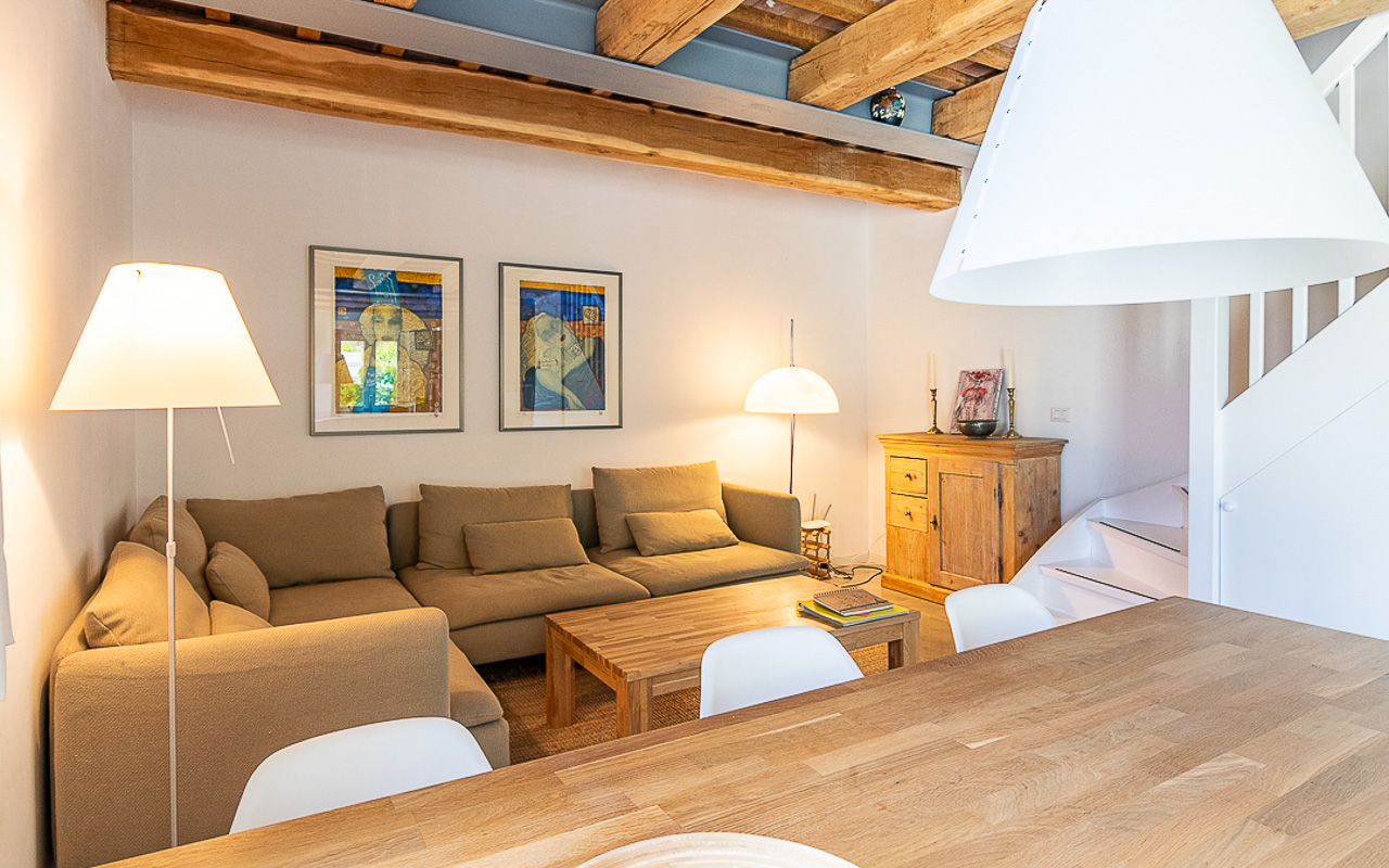 Inside, the apartment offers bright, welcoming living spaces. The ground level features a spacious living room with an open-plan kitchen. On the first floor there are two comfortable bedrooms, together with a modern bathroom featuring a rain shower and toilet. The top floor hosts a generous loft which can be used as a studio or extra bedroom as it has a washbasin.