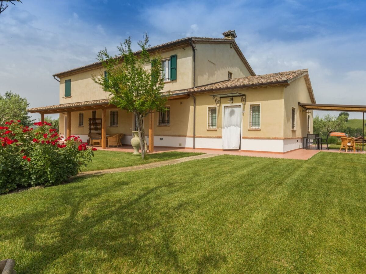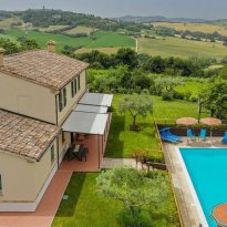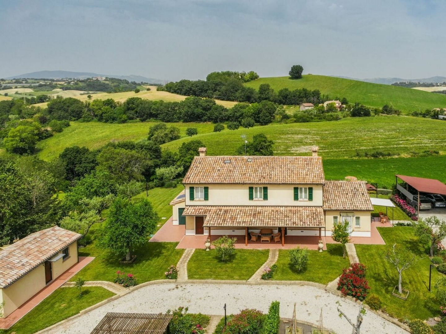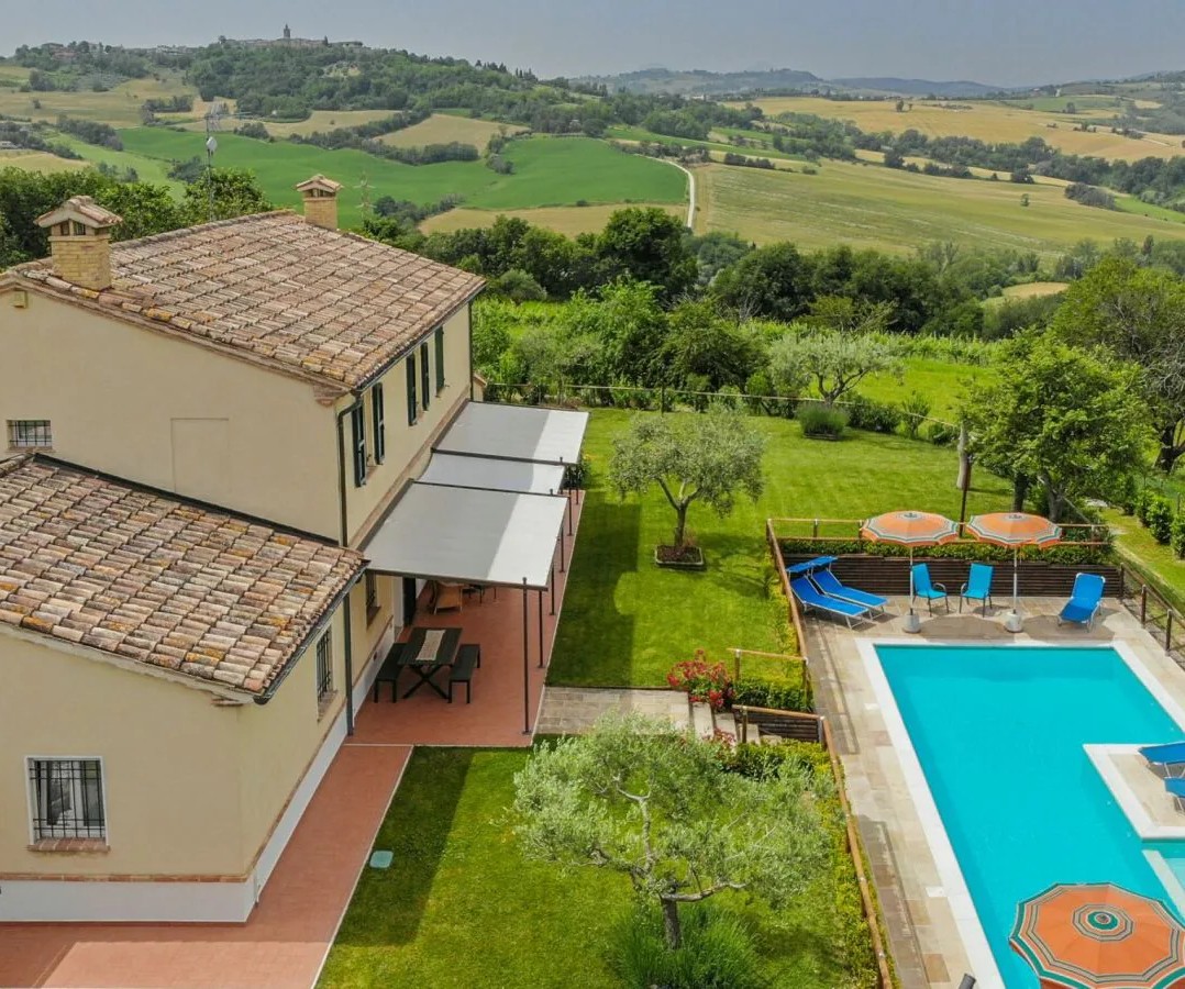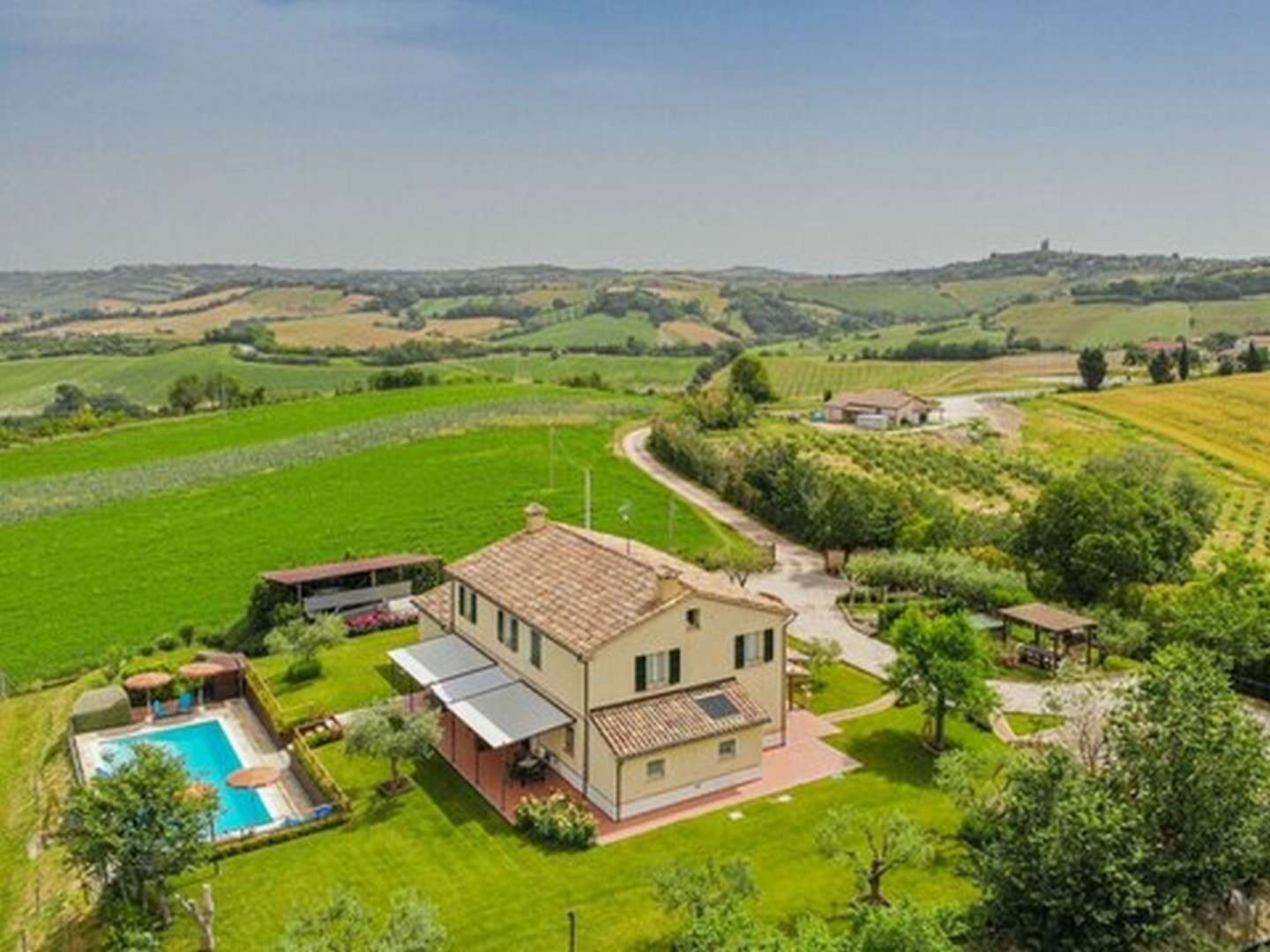 This beautiful country house is located in beautiful Barchi, in the heart of Le Marche, with views as far as the sunset and the Apennines. The surrounding rolling hills, covered with fields of wheat and sunflowers, offer unique and unforgettable moments. From the house you can quickly reach the Adriatic coast with its many beaches and historic villages such as Mondavio, as well as important cities such as Urbino and Pesaro. The house has a beautiful 12 x 6 m swimming pool with umbrellas and sun loungers, a barbecue area, a covered parking space and an outbuilding, currently used as a fourth flat, but officially this space is registered as a barn/store.