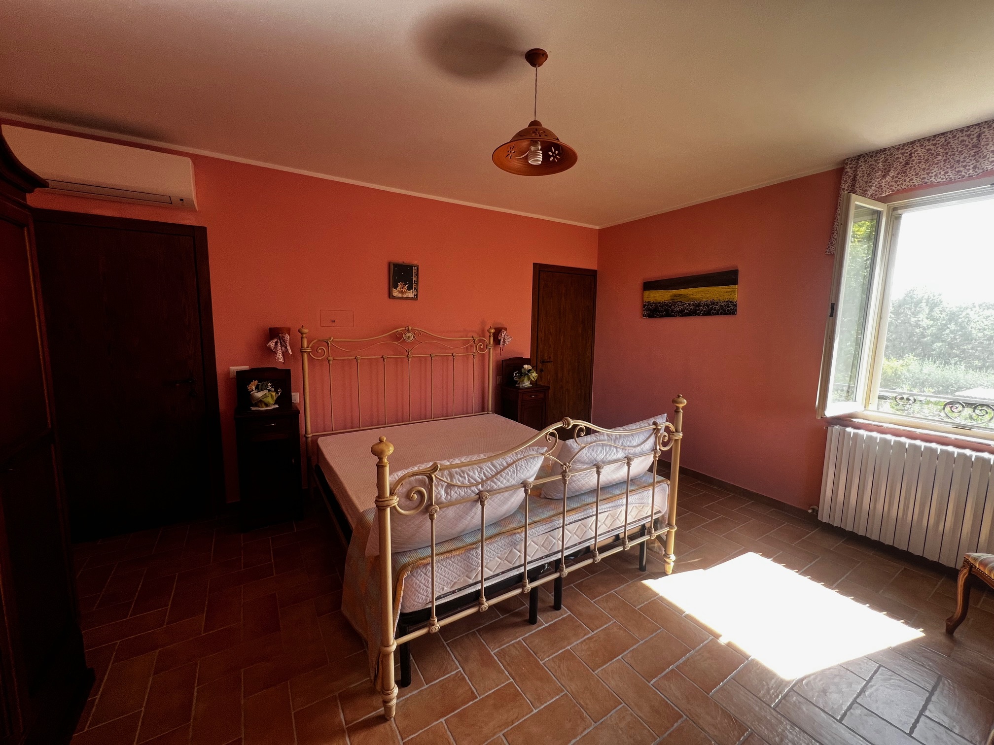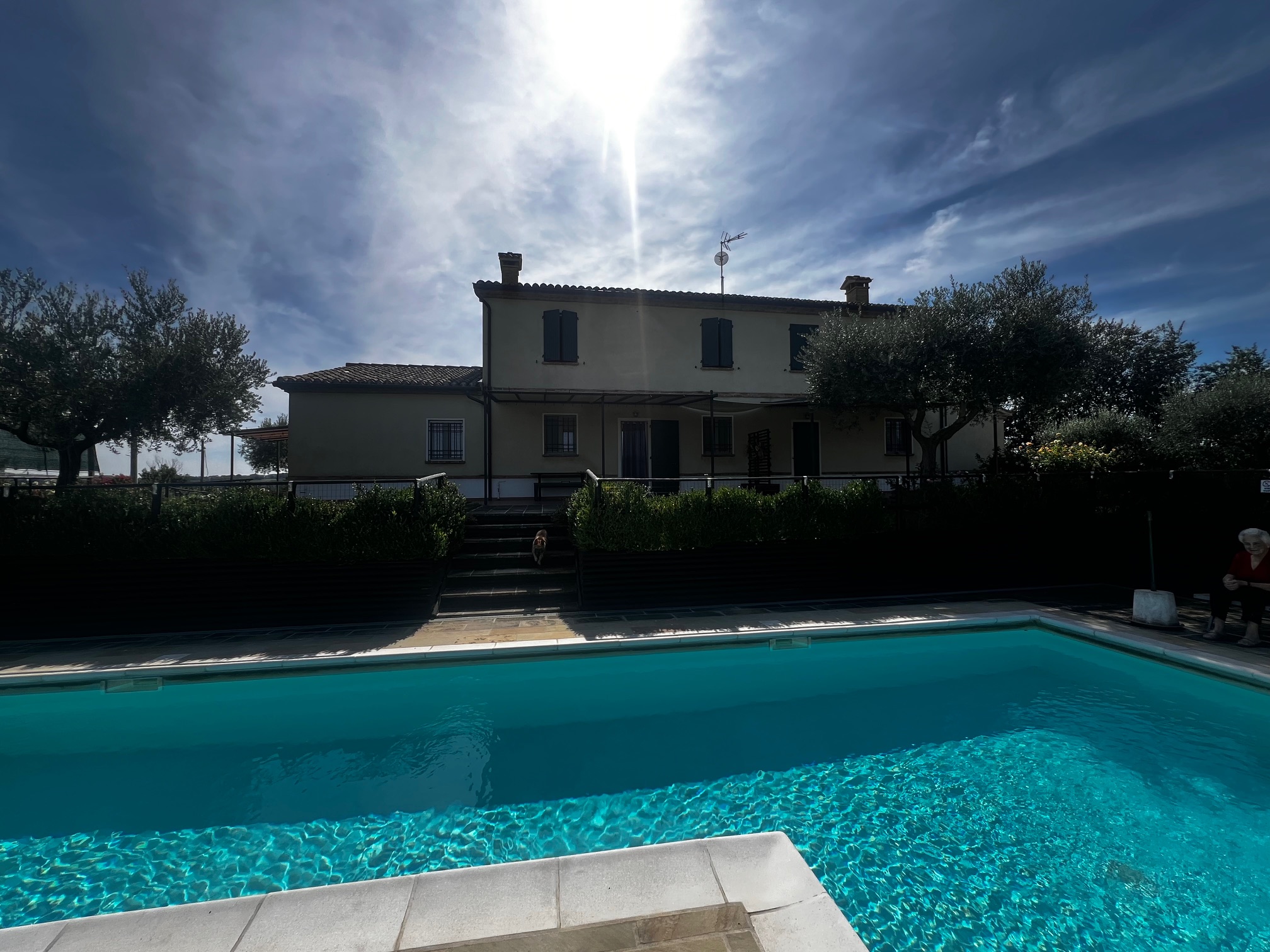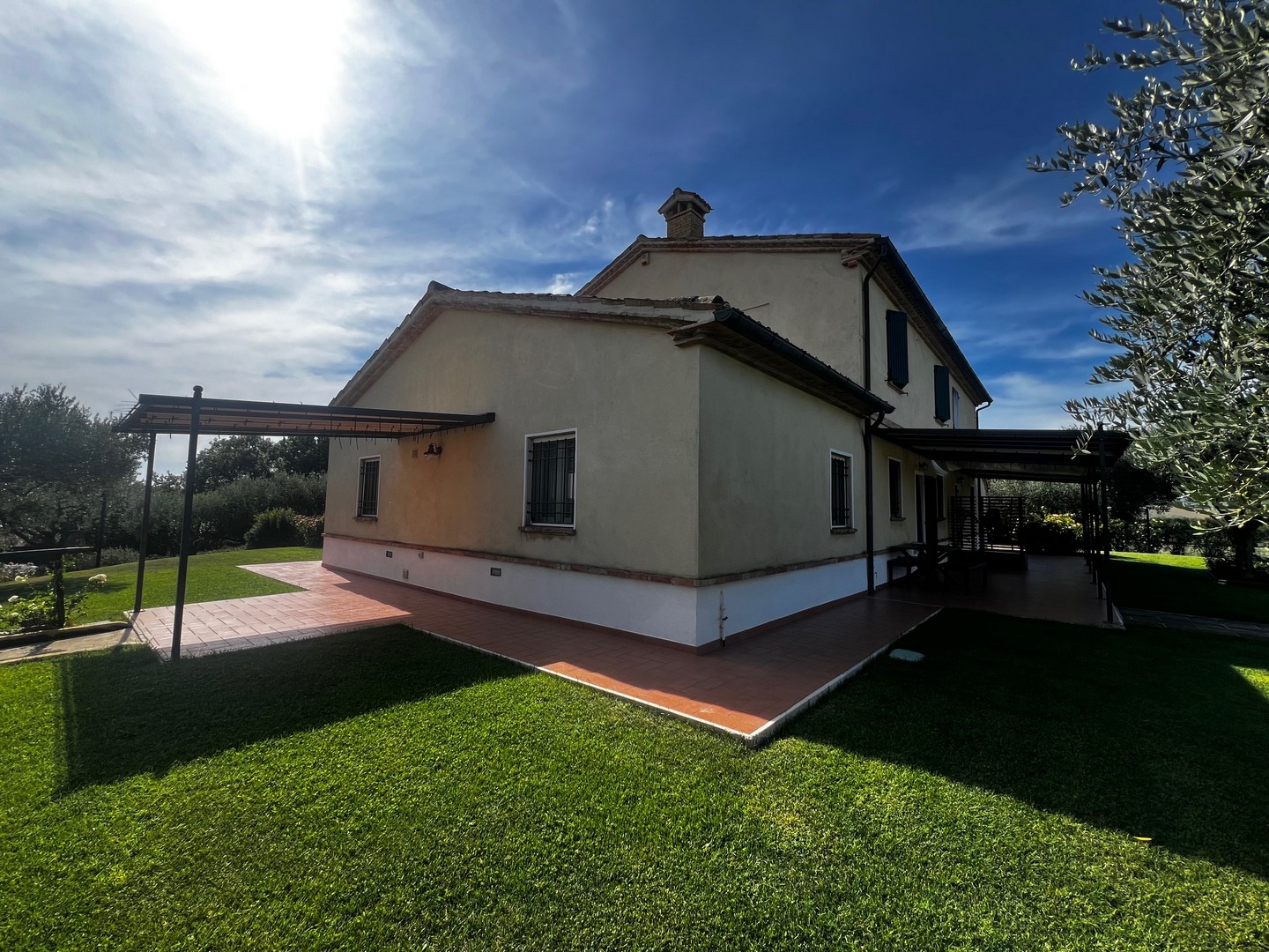 This beautiful country house is located in beautiful Barchi, in the heart of Le Marche, with views as far as the sunset and the Apennines. The surrounding rolling hills, covered with fields of wheat and sunflowers, offer unique and unforgettable moments. From the house you can quickly reach the Adriatic coast with its many beaches and historic villages such as Mondavio, as well as important cities such as Urbino and Pesaro. The house has a beautiful 12 x 6 m swimming pool with umbrellas and sun loungers, a barbecue area, a covered parking space and an outbuilding, currently used as a fourth flat, but officially this space is registered as a barn/store.