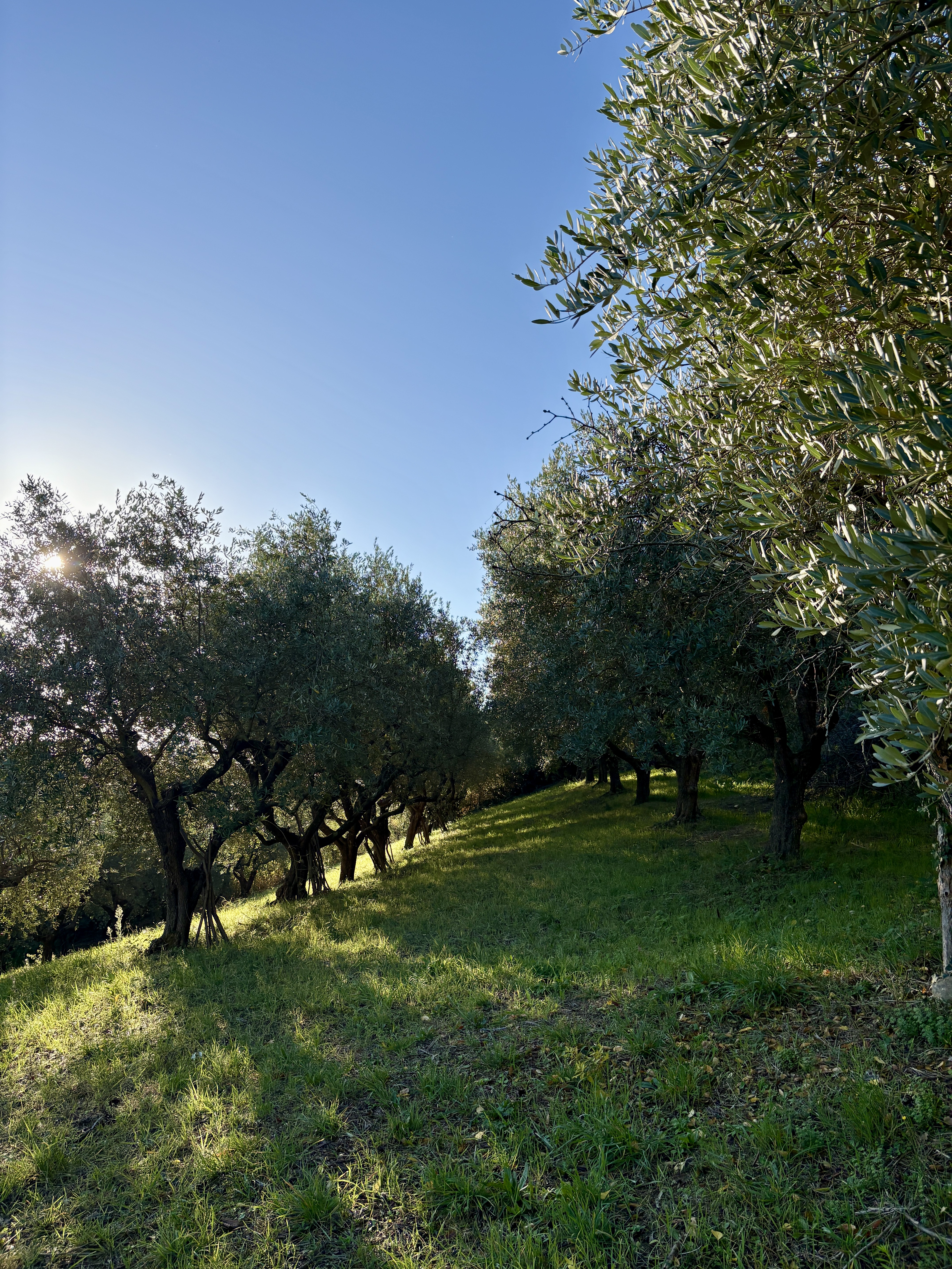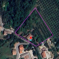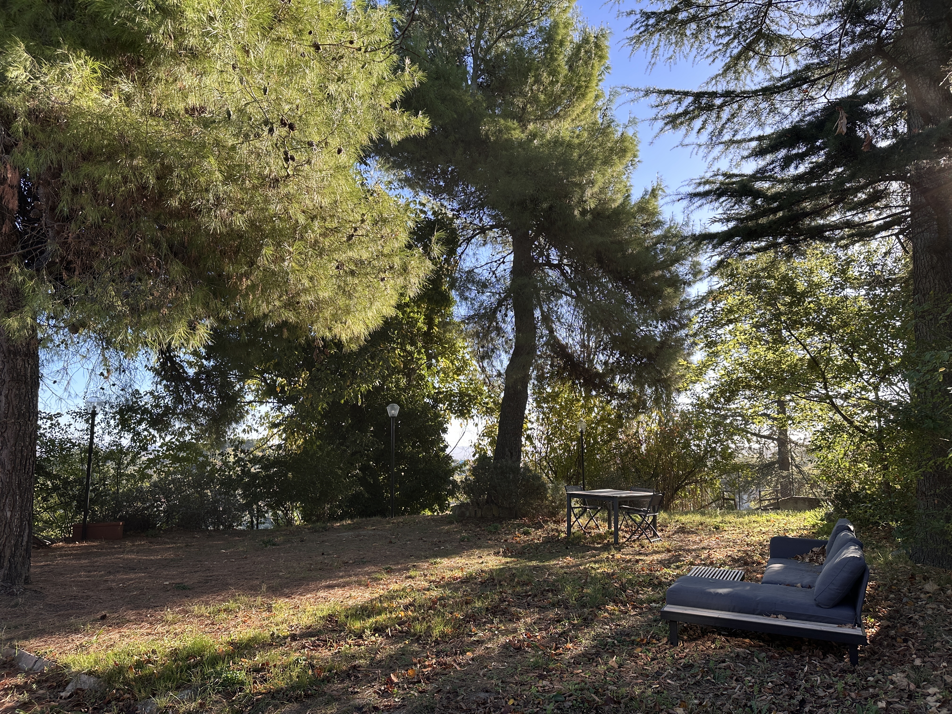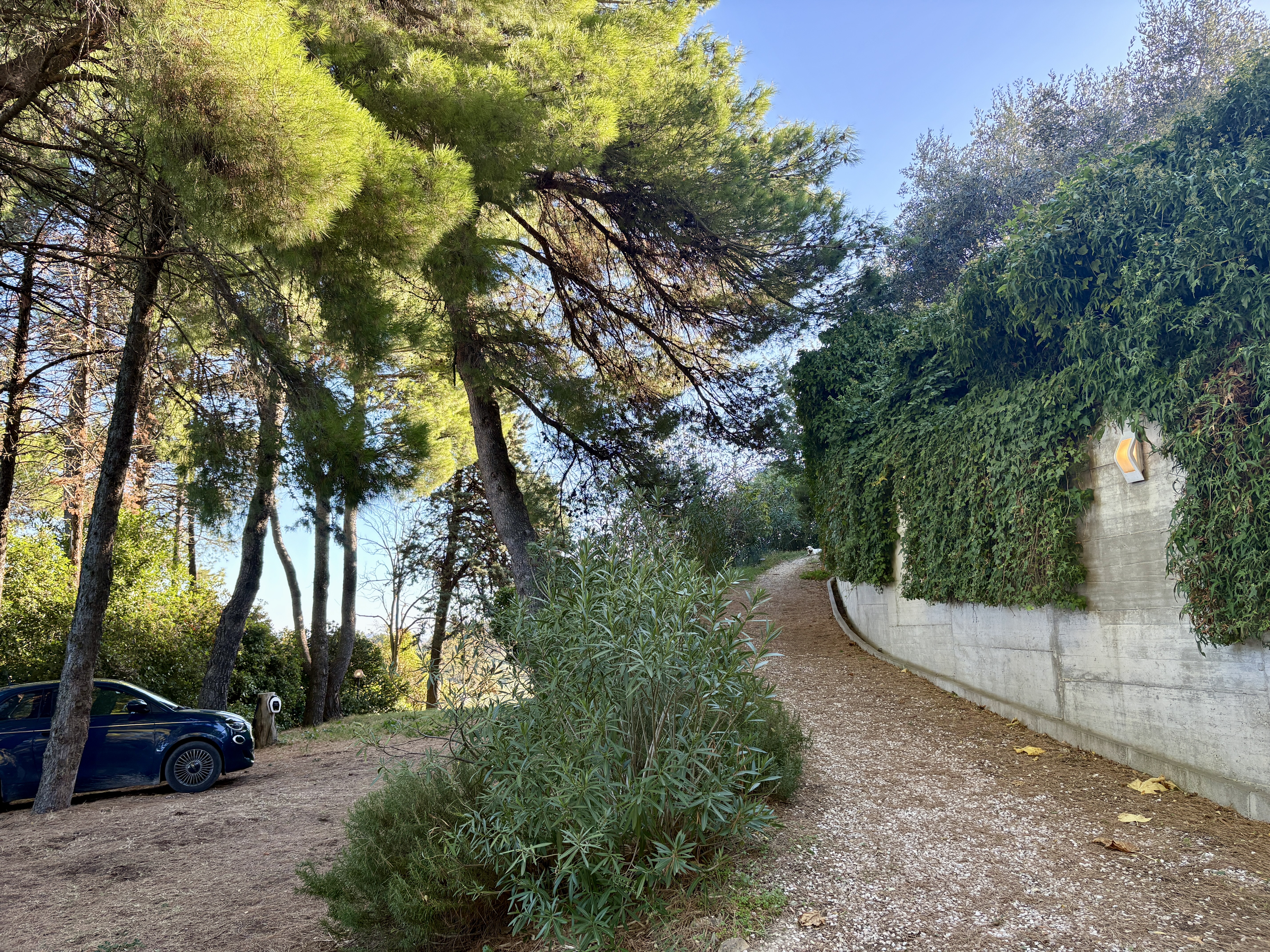 A fine and spacious terrace has recently been created on 2 sides of the house, from the fairly flat garden surrounding the house there is a view of the sea on clear days. The orchard with several fruit and pine trees and 70 mature olive trees lies a little lower. The land with an area of 5,561 m² is fully fenced, and although the house is not secluded, the plot offers maximum privacy. The property is easily accessible via a very quiet tarmac road, access to the house via 2 entrance gates.