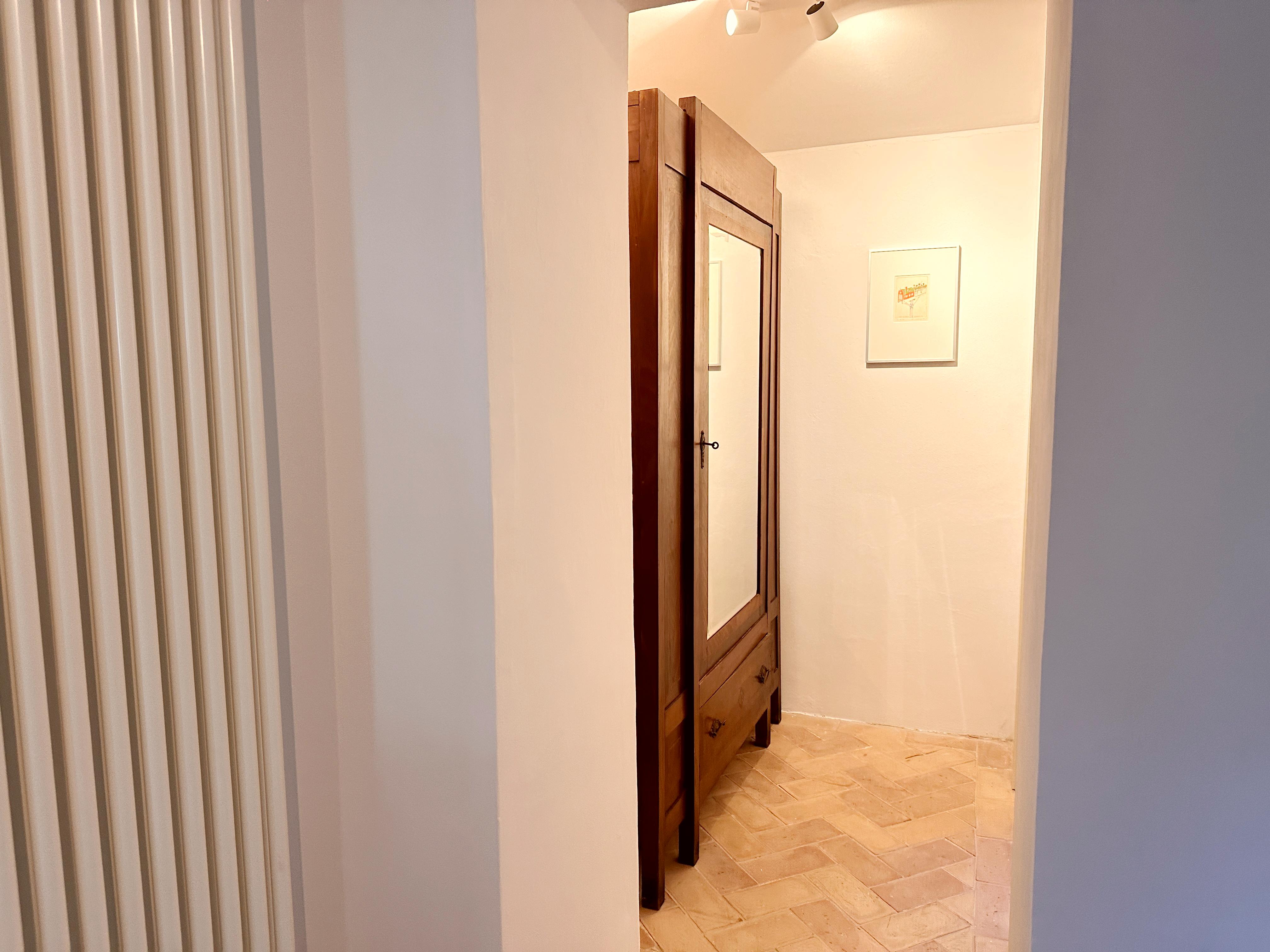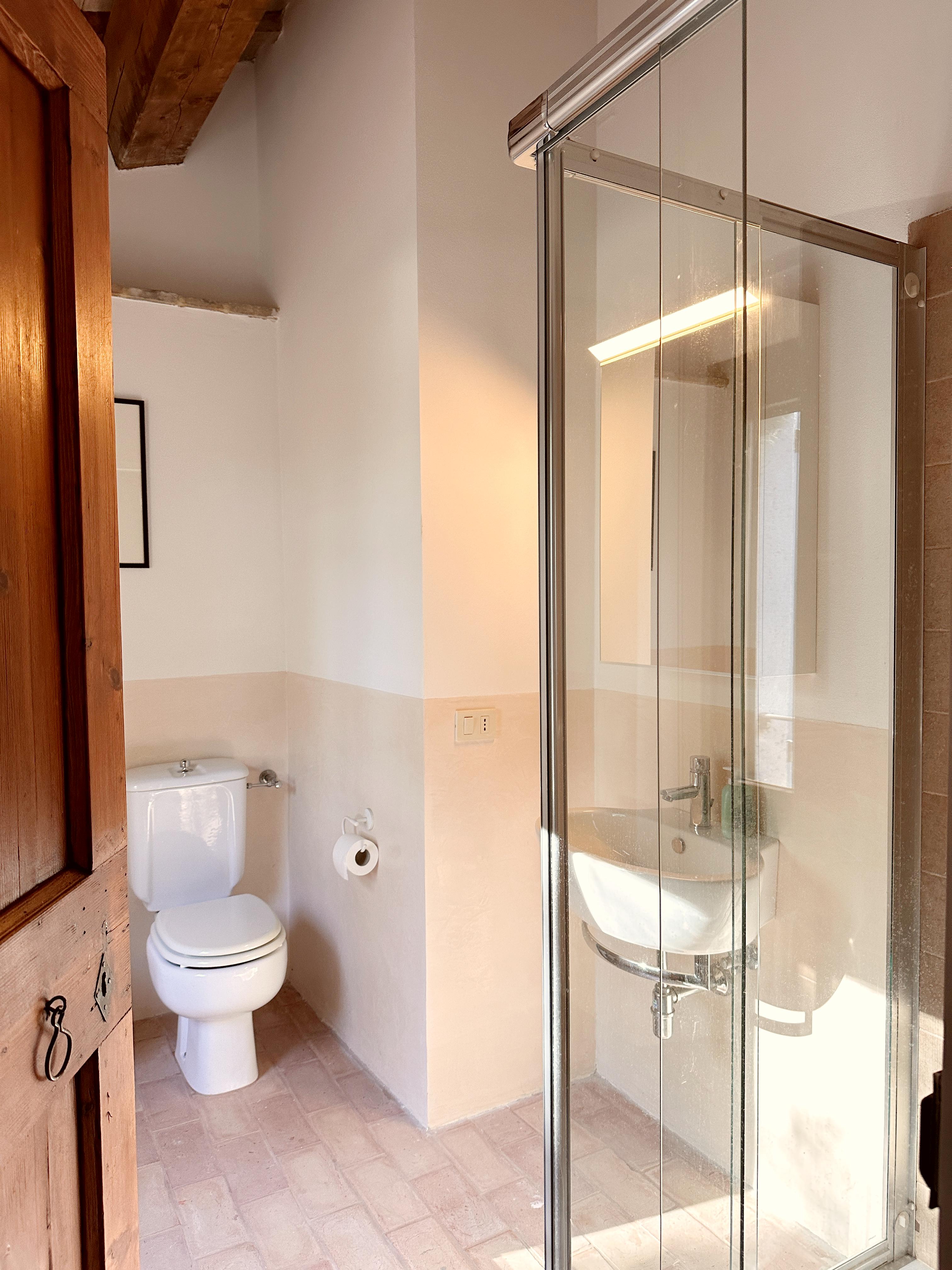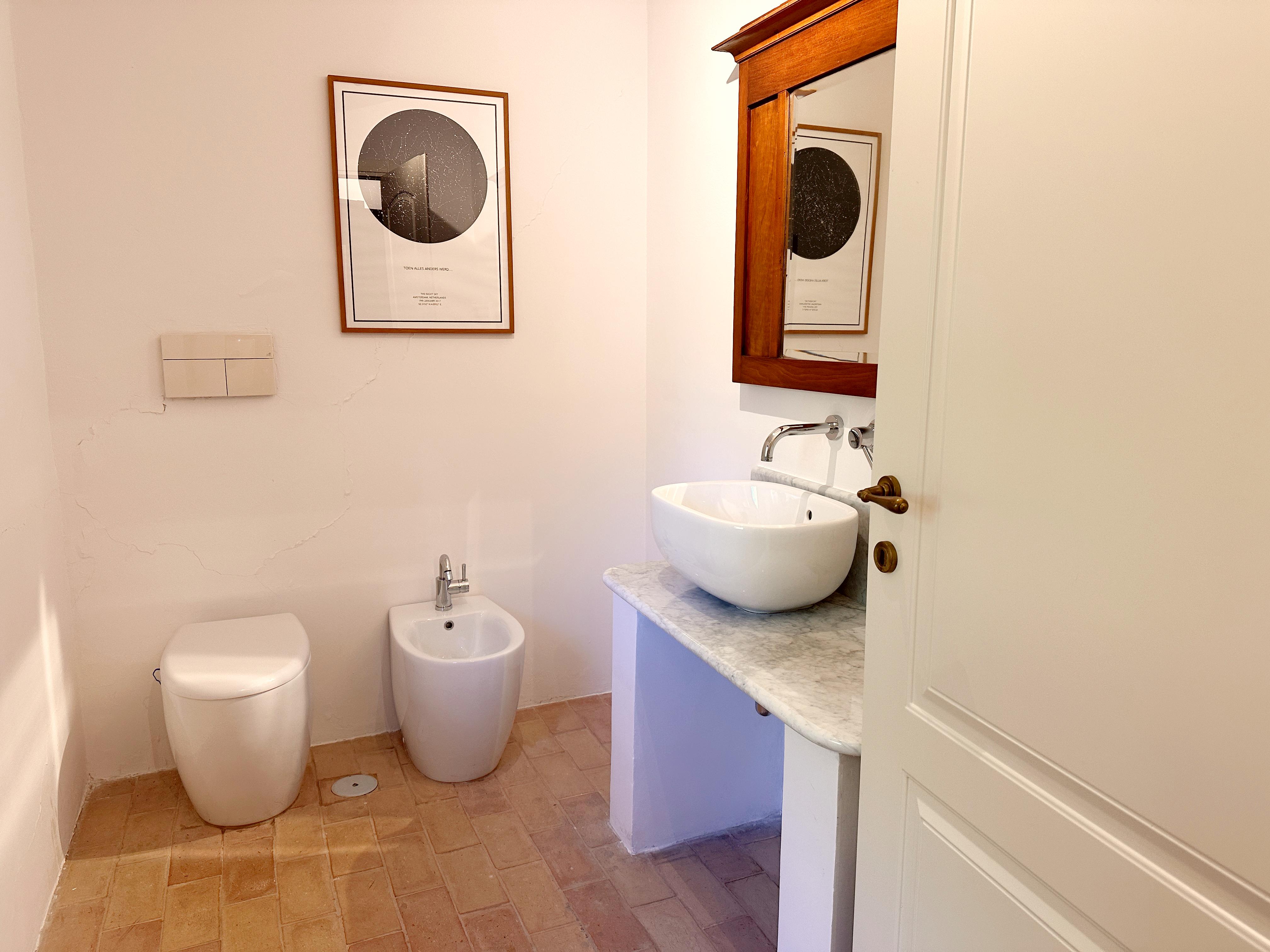 First floor:landing, 4 bedrooms (currently 2 are in use as study/workroom), each with its own bathroom. Typical of this floor are the wooden-beamed ceilings and terracotta floor tiles.