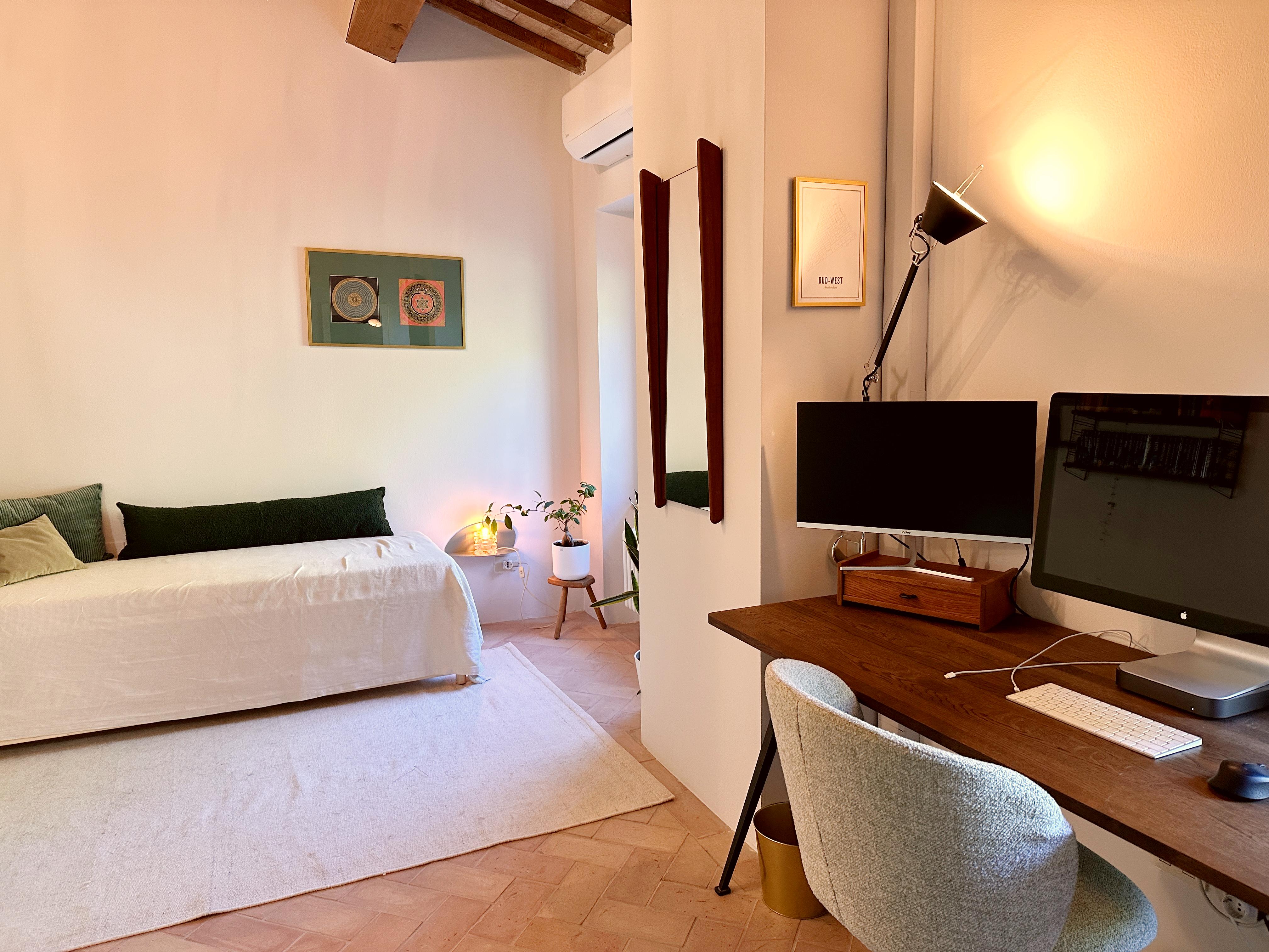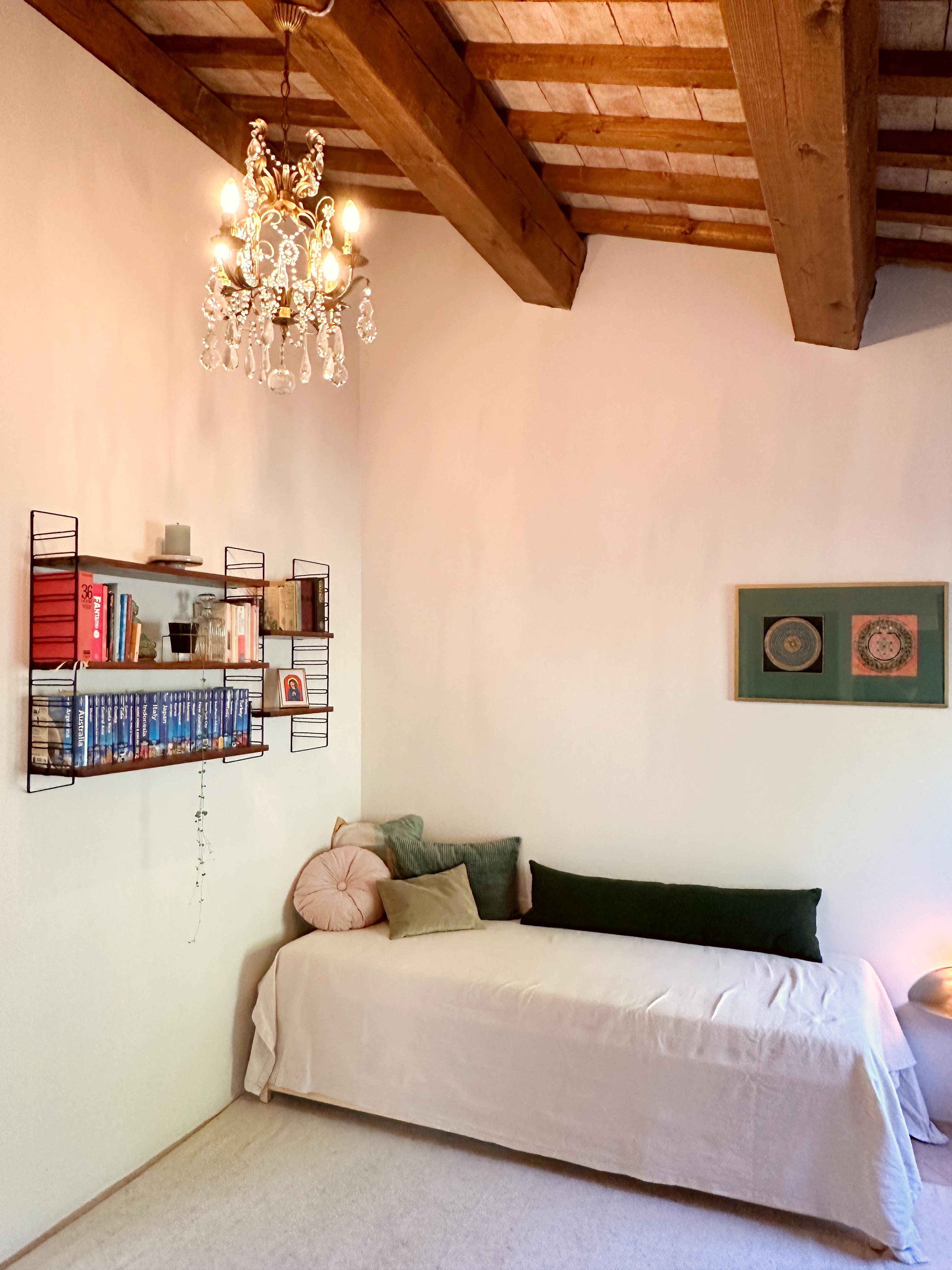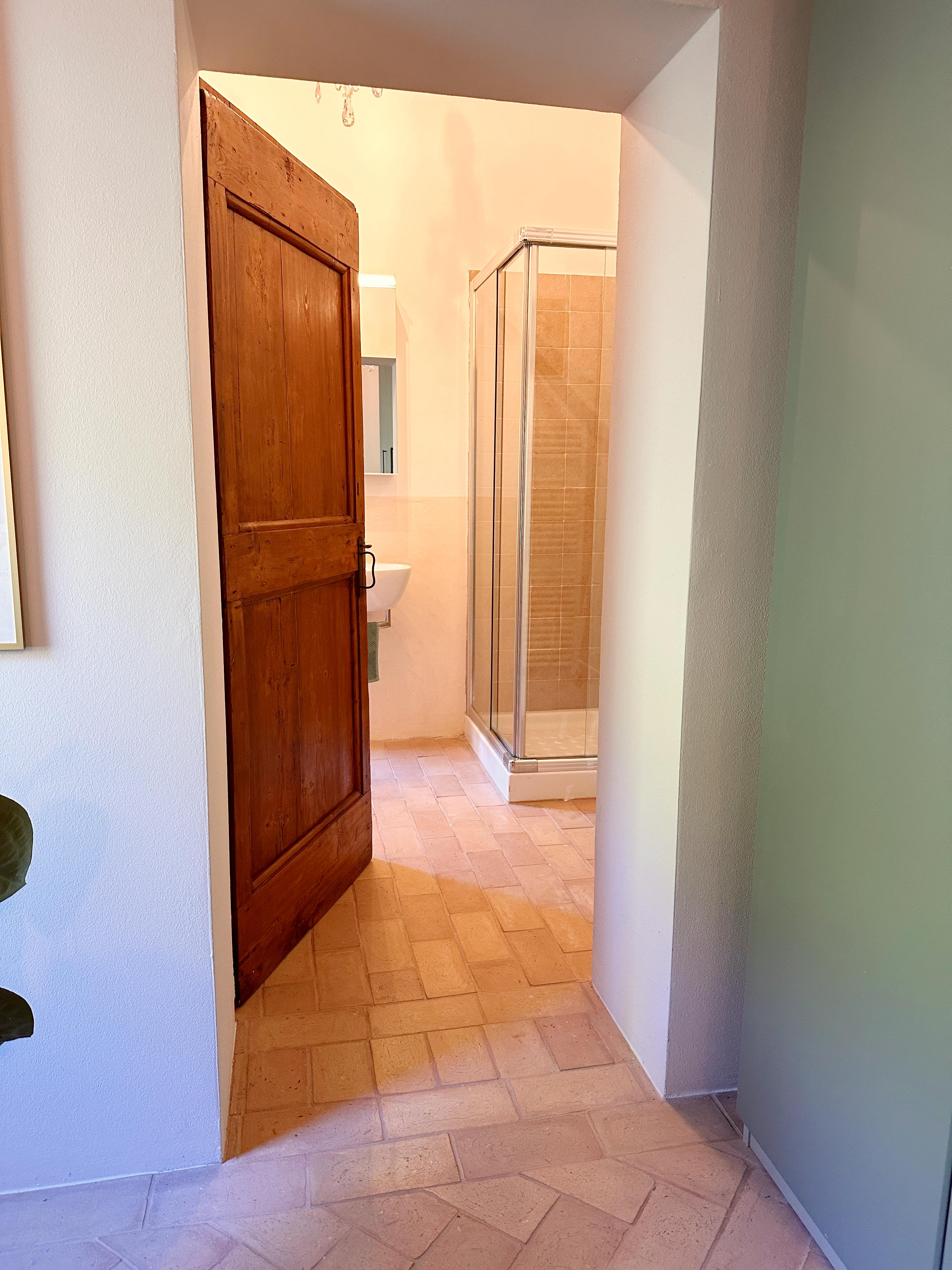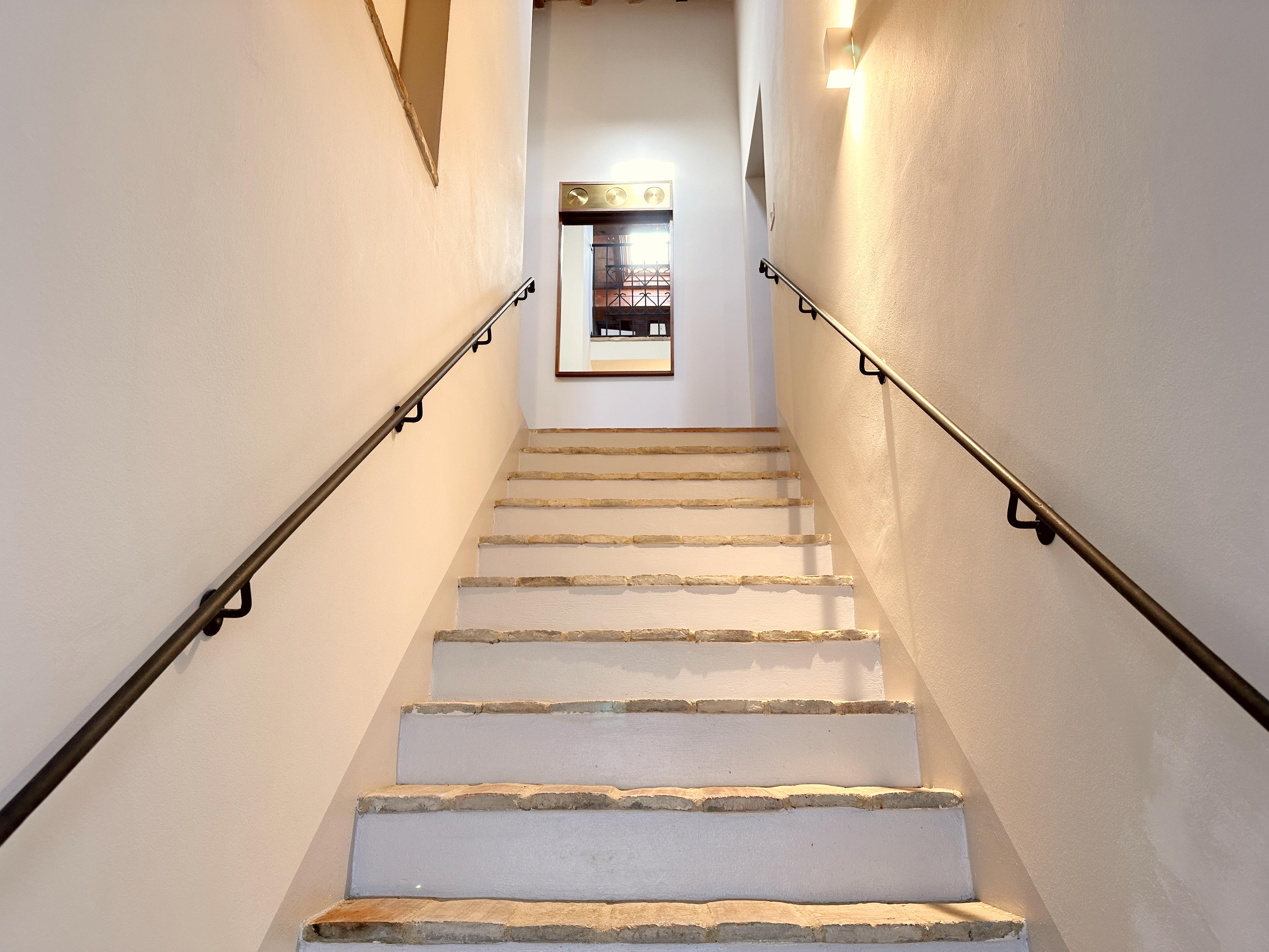 First floor:landing, 4 bedrooms (currently 2 are in use as study/workroom), each with its own bathroom. Typical of this floor are the wooden-beamed ceilings and terracotta floor tiles.