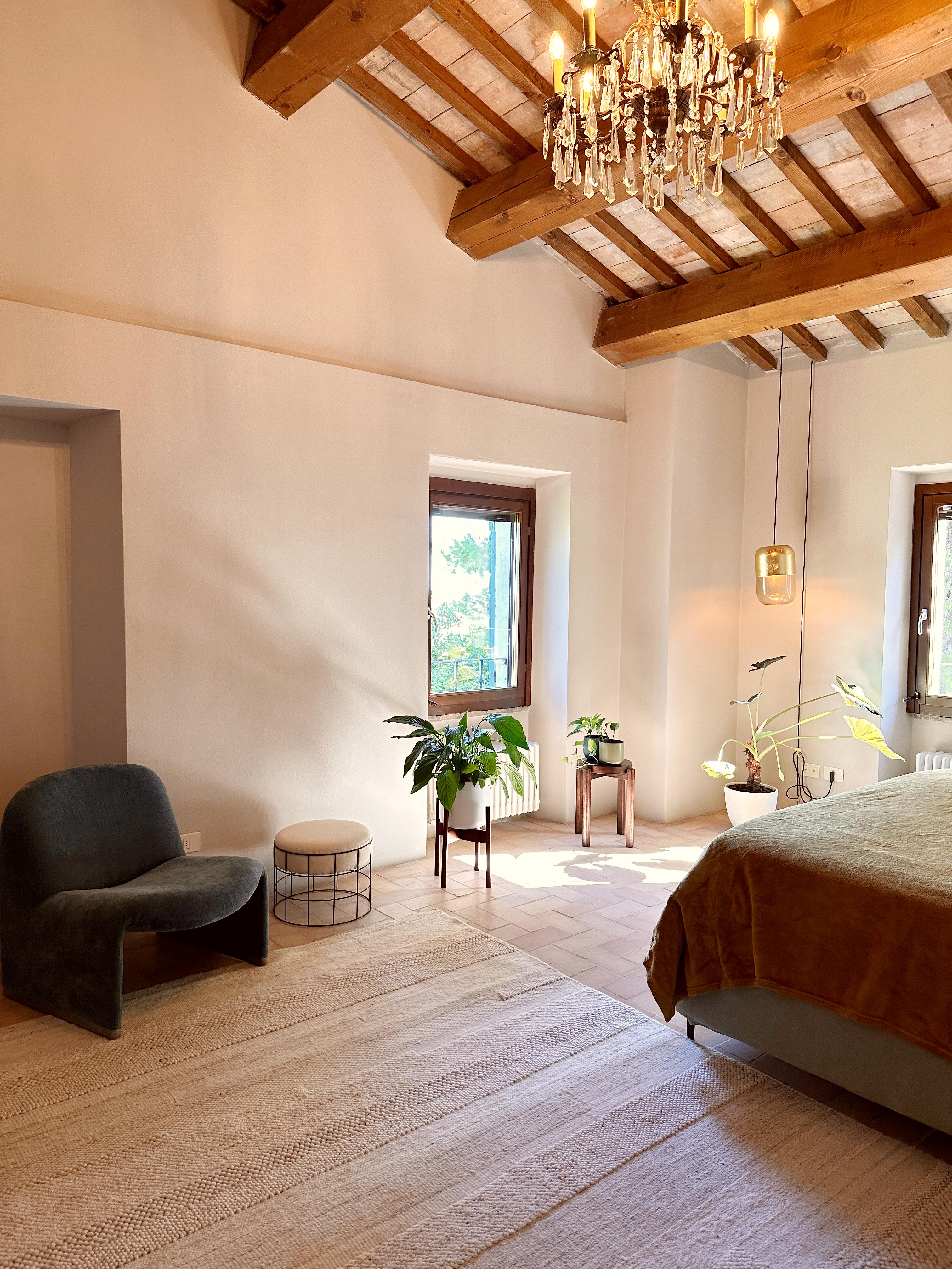 Set in a commanding position overlooking the rolling hills of the Le Marche countryside, Villa Il Poggio is a beautifully rebuilt stone farmhouse that perfectly blends rustic charm with modern elegance. With its southern exposure, the property enjoys spectacular views that stretch across the surrounding fields to the majestic Sibillini Mountains, a landscape that gifts breathtaking sunrises and sunsets every day.