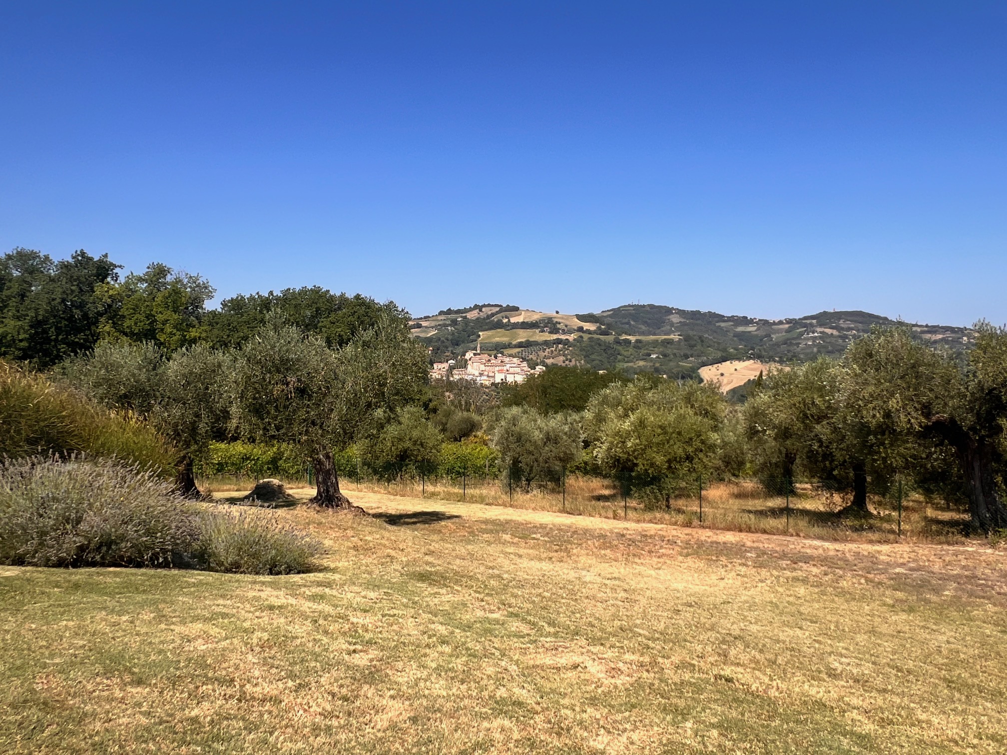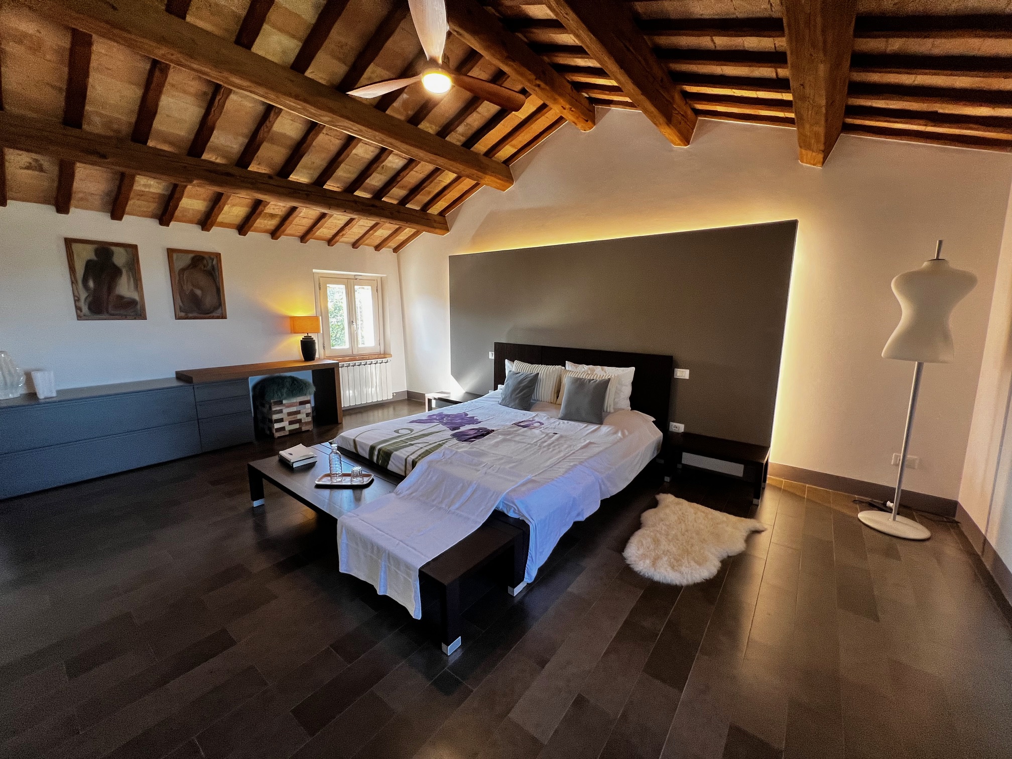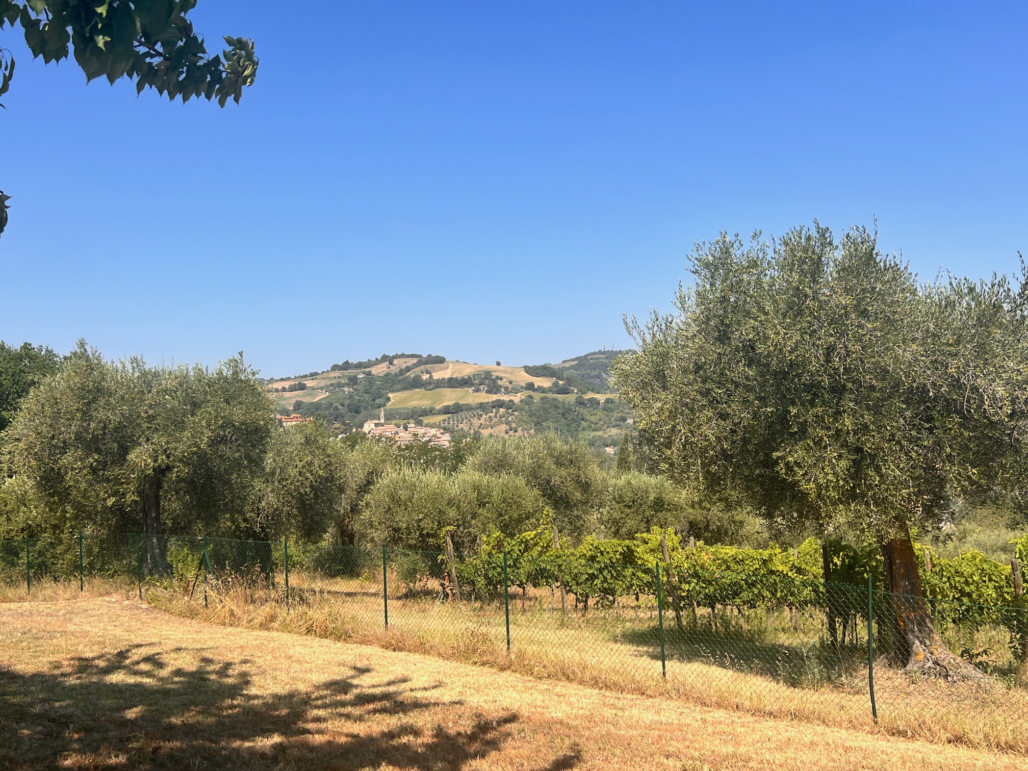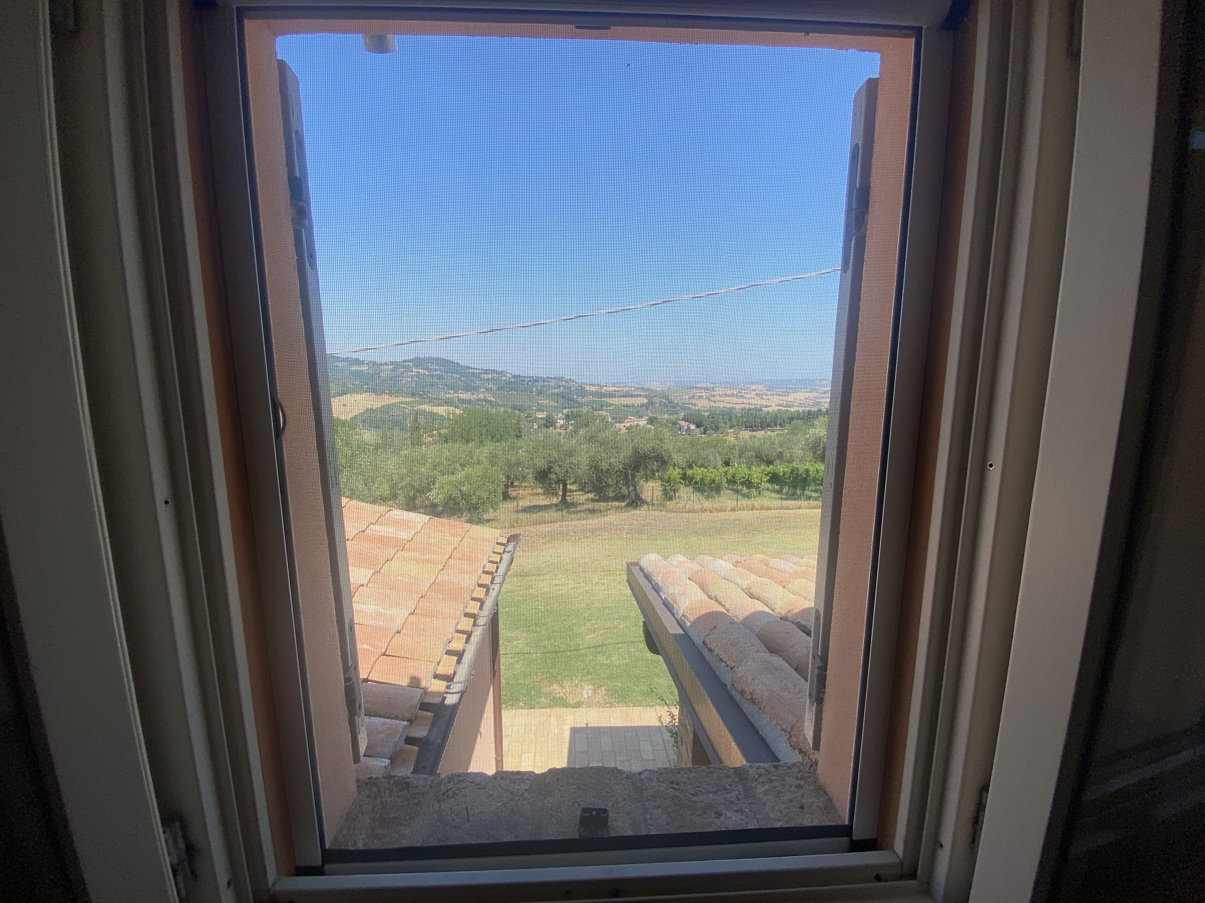 This attractive and completely renovated country house offers stunning views of Cartoceto and the surrounding valley with olive groves and vineyards. Located in a beautifully maintained, fully fenced garden (4,500 m²) with a variety of plantings and a small olive grove. From the garden and the upstairs bedrooms you can catch a glimpse of the Adriatic Sea. The property has an electronic gate from the main road, and offers plenty of privacy and tranquillity .