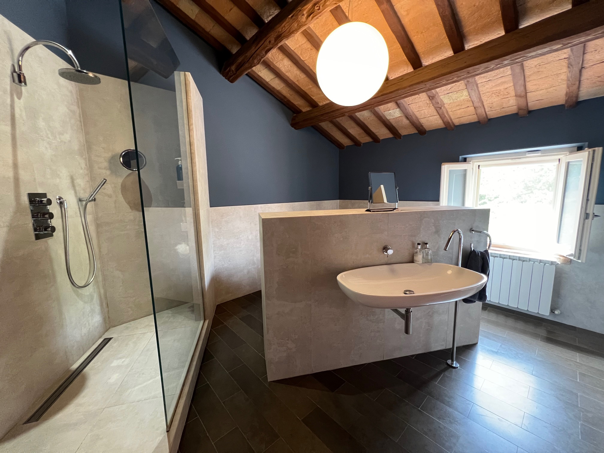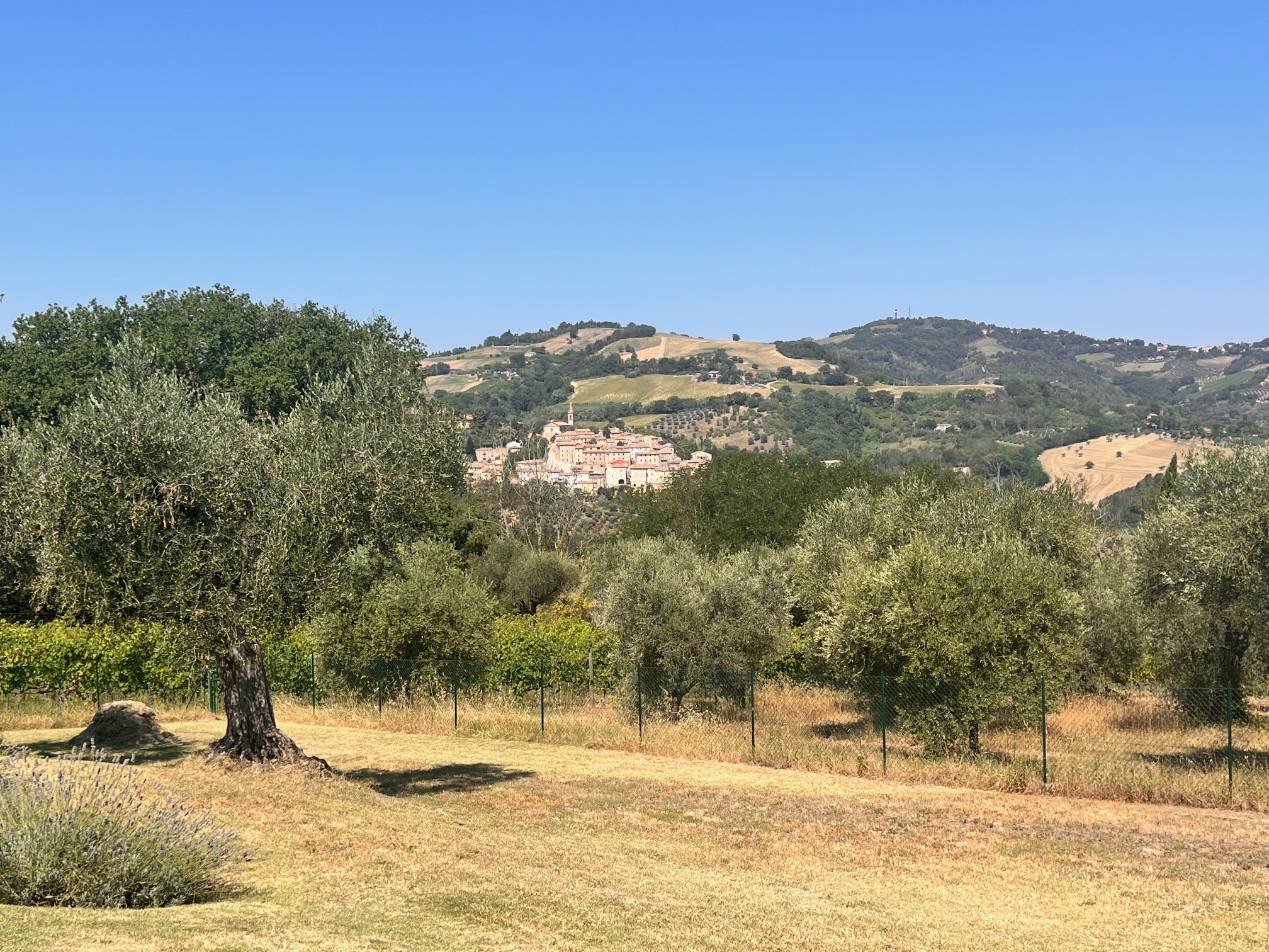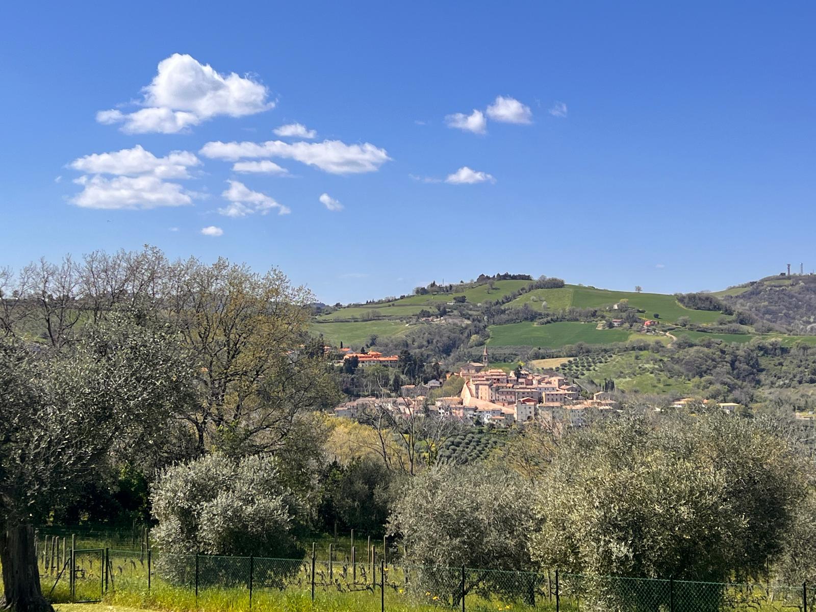This attractive and completely renovated country house offers stunning views of Cartoceto and the surrounding valley with olive groves and vineyards. Located in a beautifully maintained, fully fenced garden (4,500 m²) with a variety of plantings and a small olive grove. From the garden and the upstairs bedrooms you can catch a glimpse of the Adriatic Sea. The property has an electronic gate from the main road, and offers plenty of privacy and tranquillity .