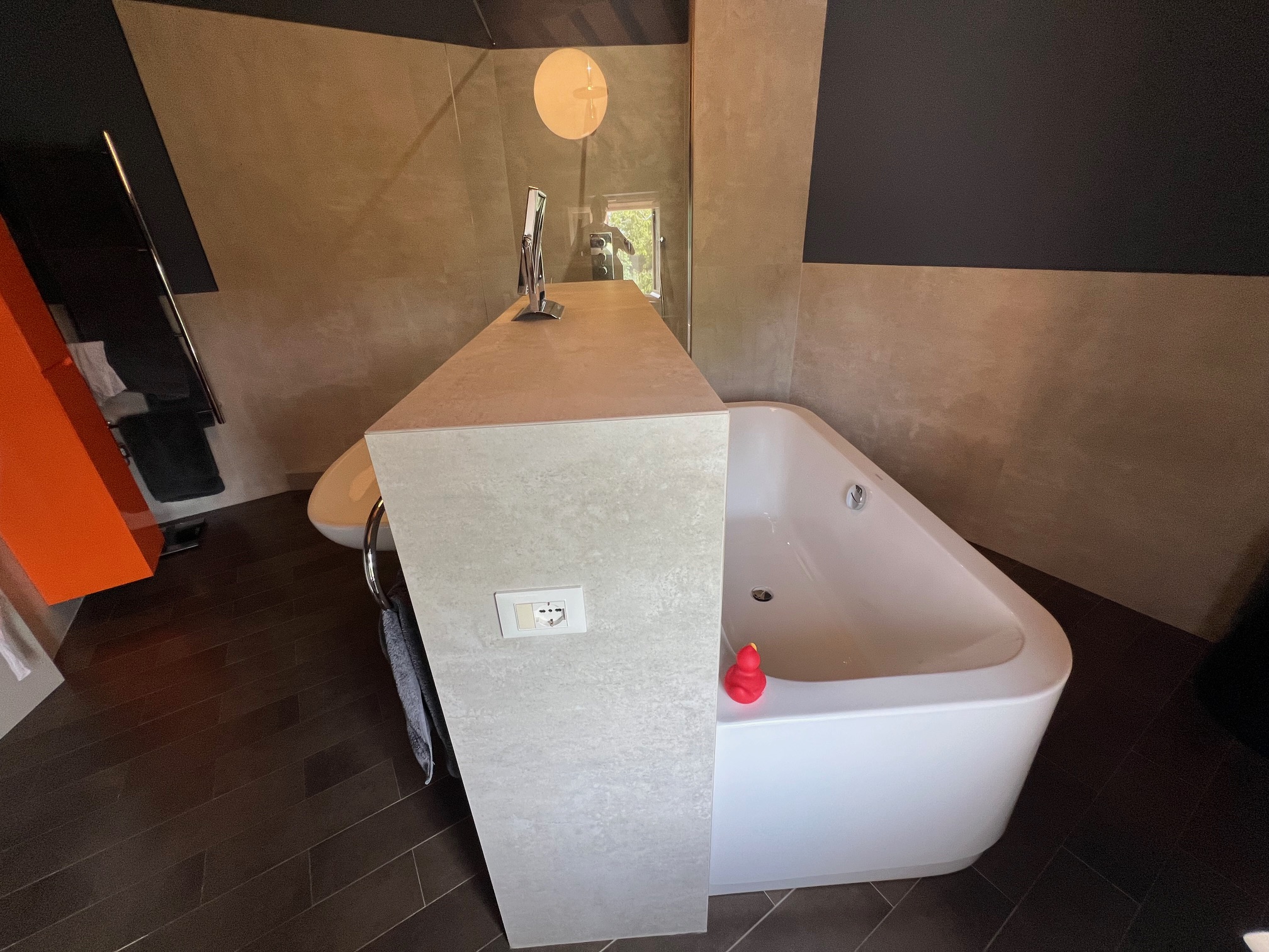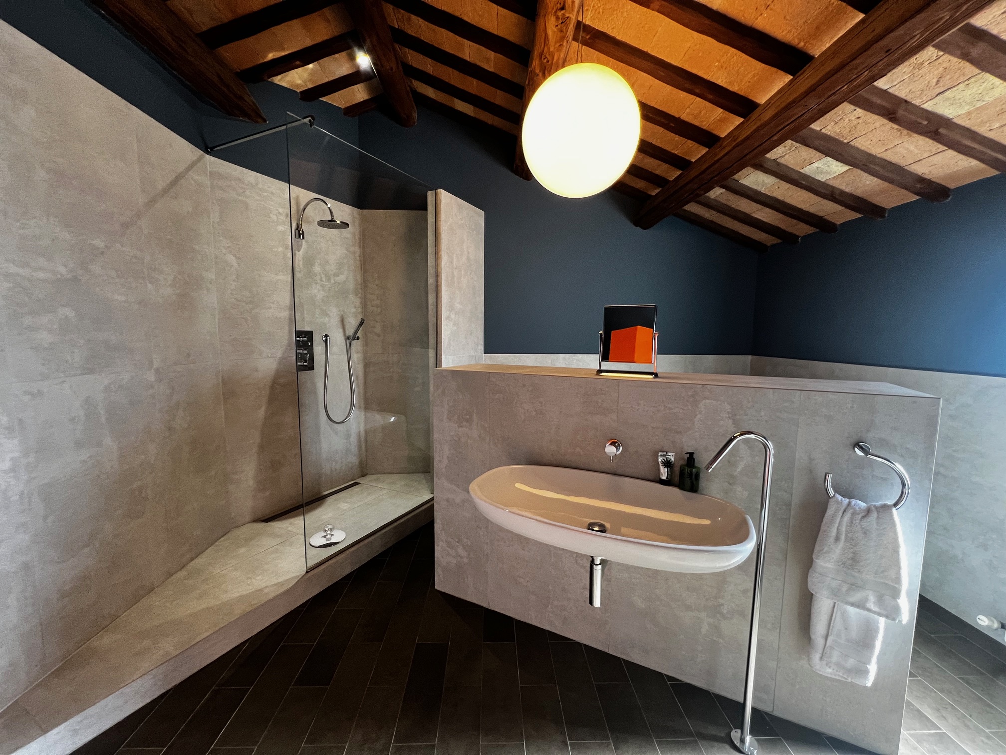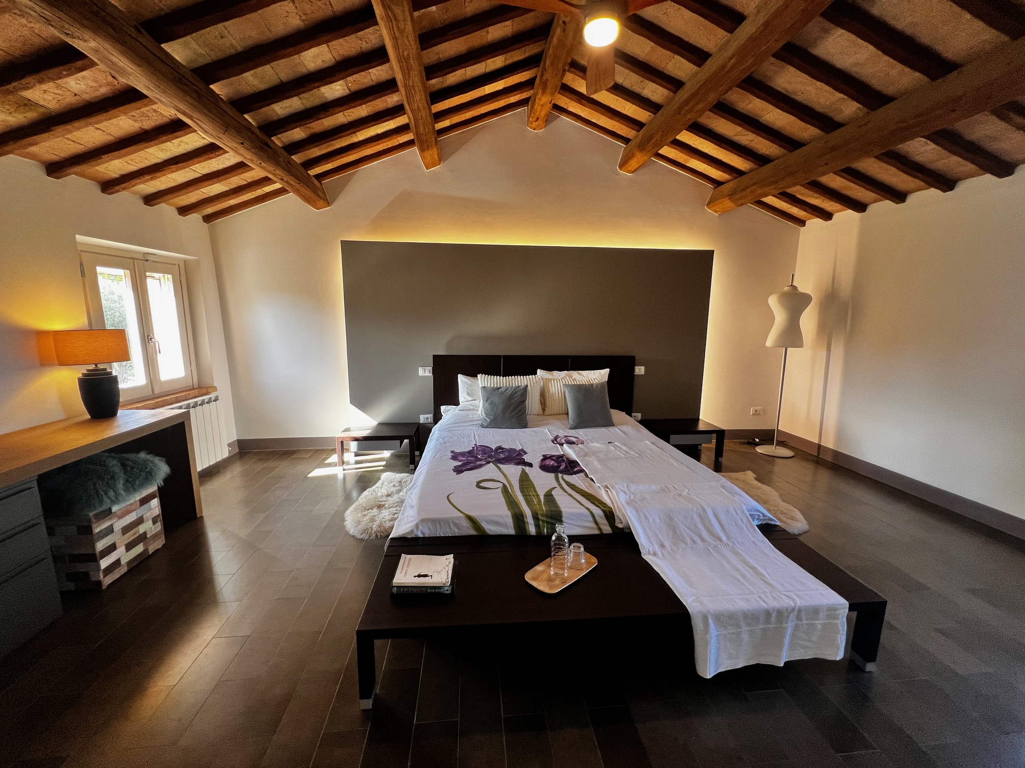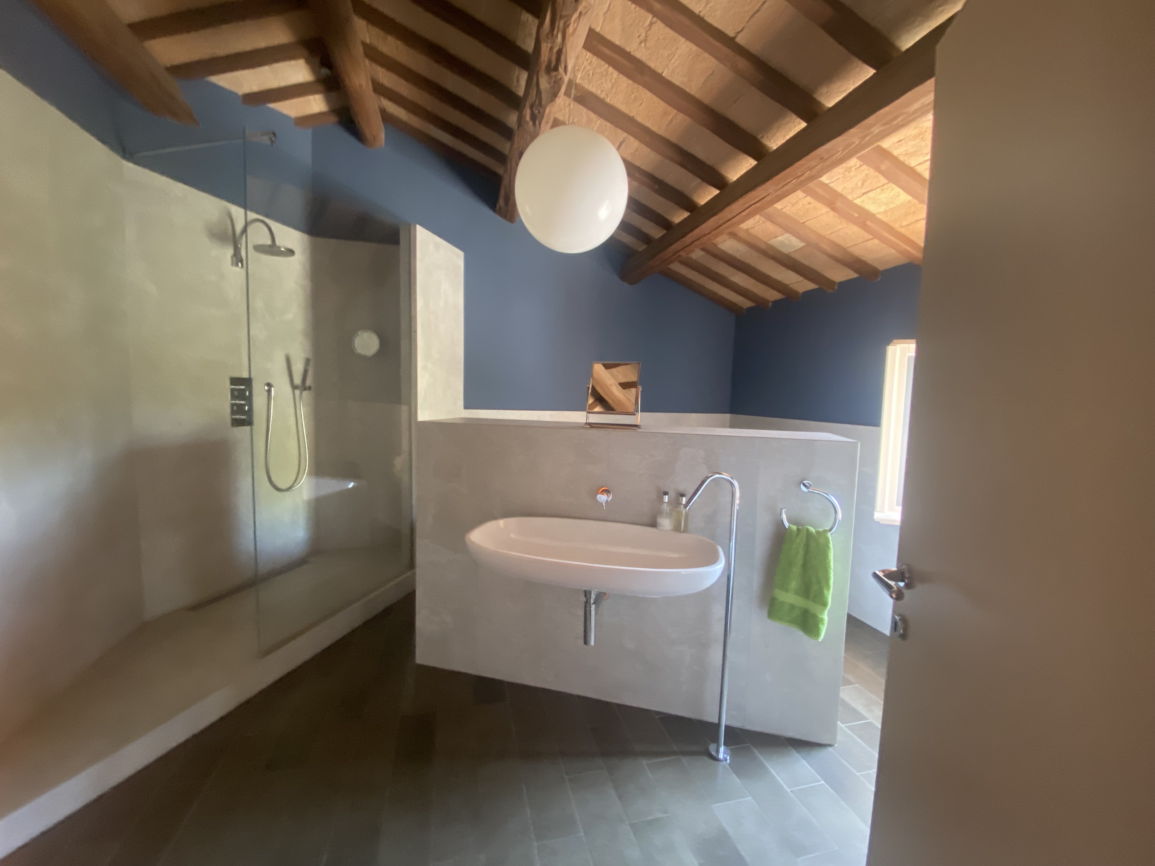This attractive and completely renovated country house offers stunning views of Cartoceto and the surrounding valley with olive groves and vineyards. Located in a beautifully maintained, fully fenced garden (4,500 m²) with a variety of plantings and a small olive grove. From the garden and the upstairs bedrooms you can catch a glimpse of the Adriatic Sea. The property has an electronic gate from the main road, and offers plenty of privacy and tranquillity .