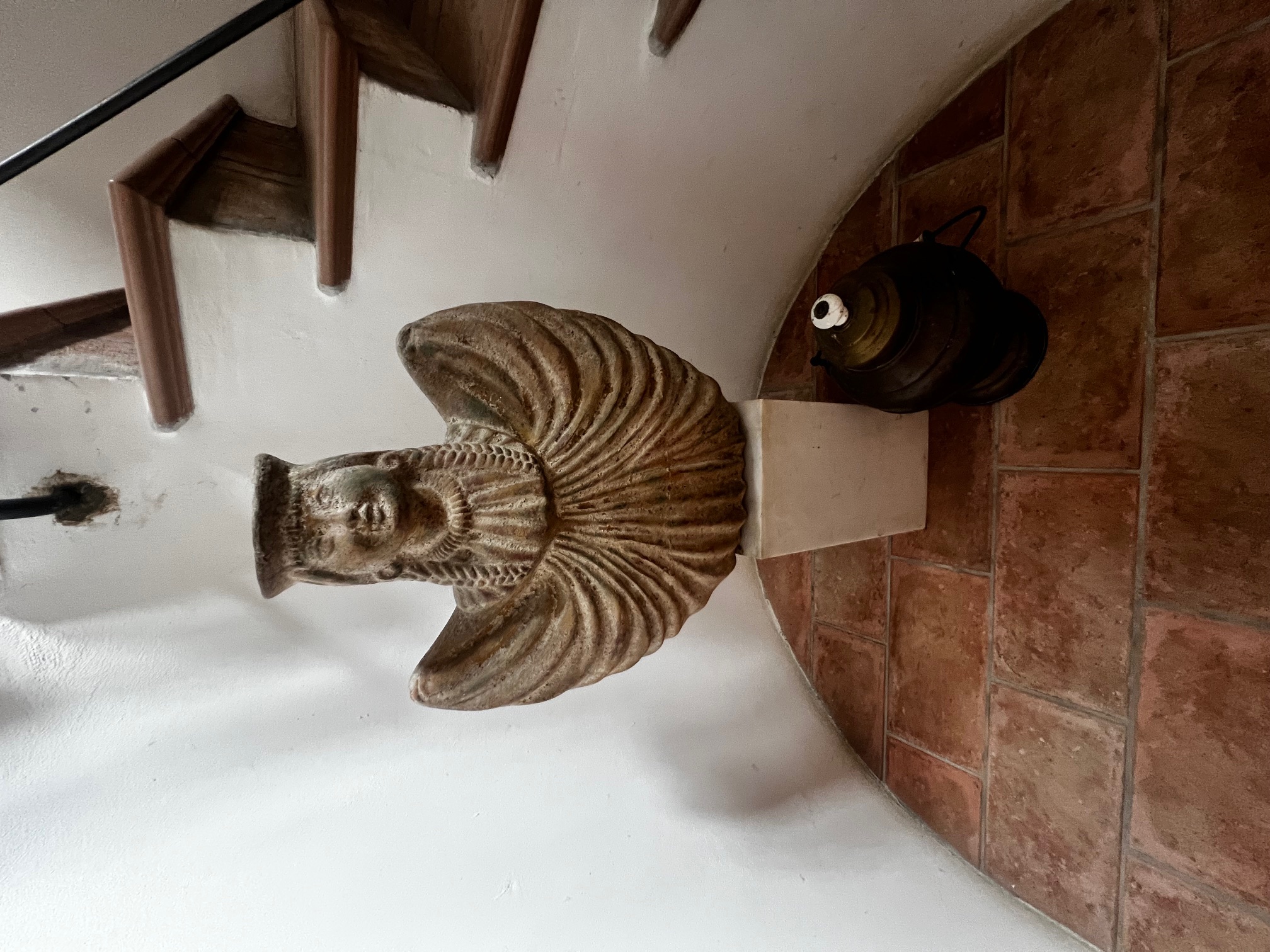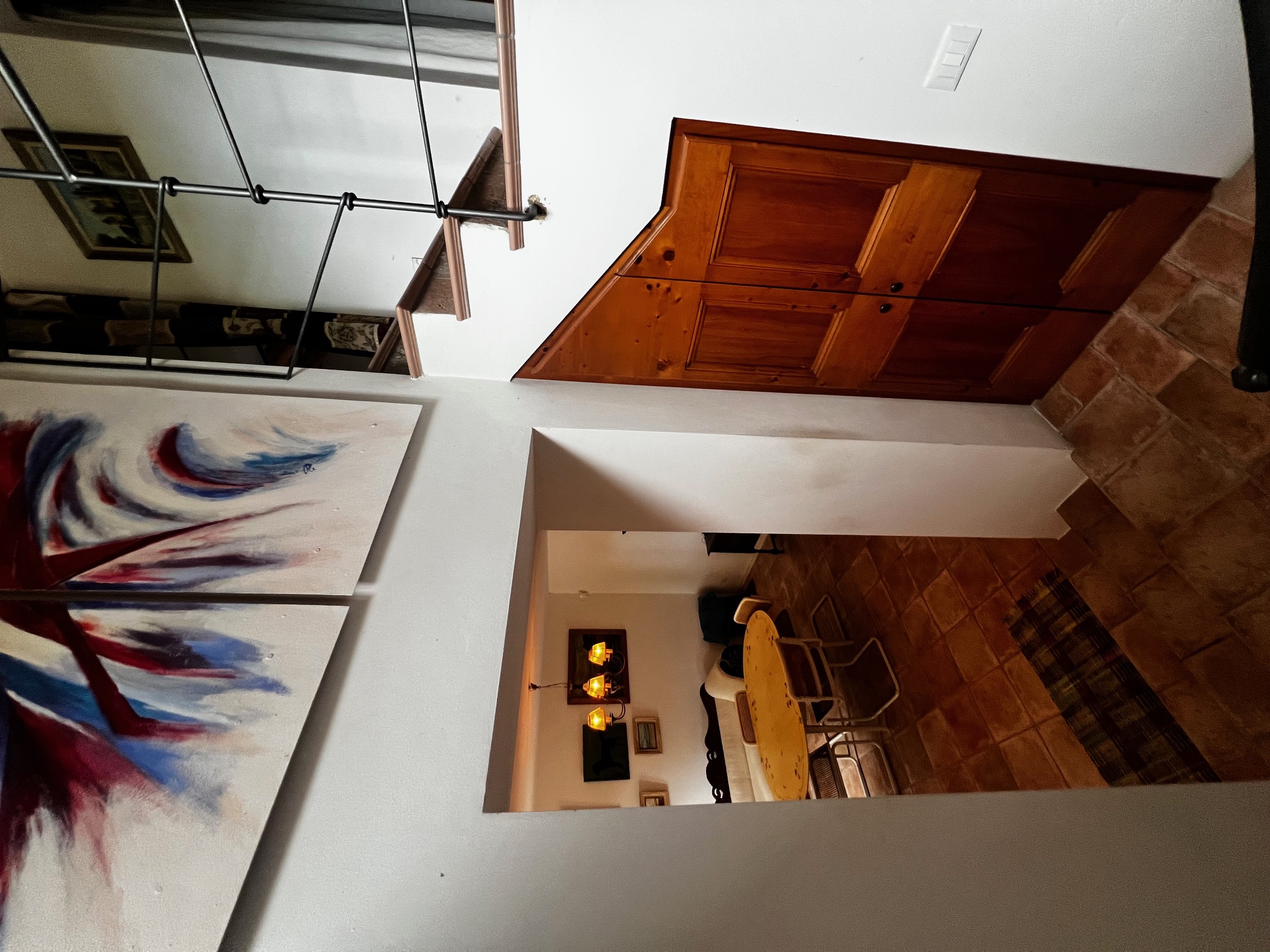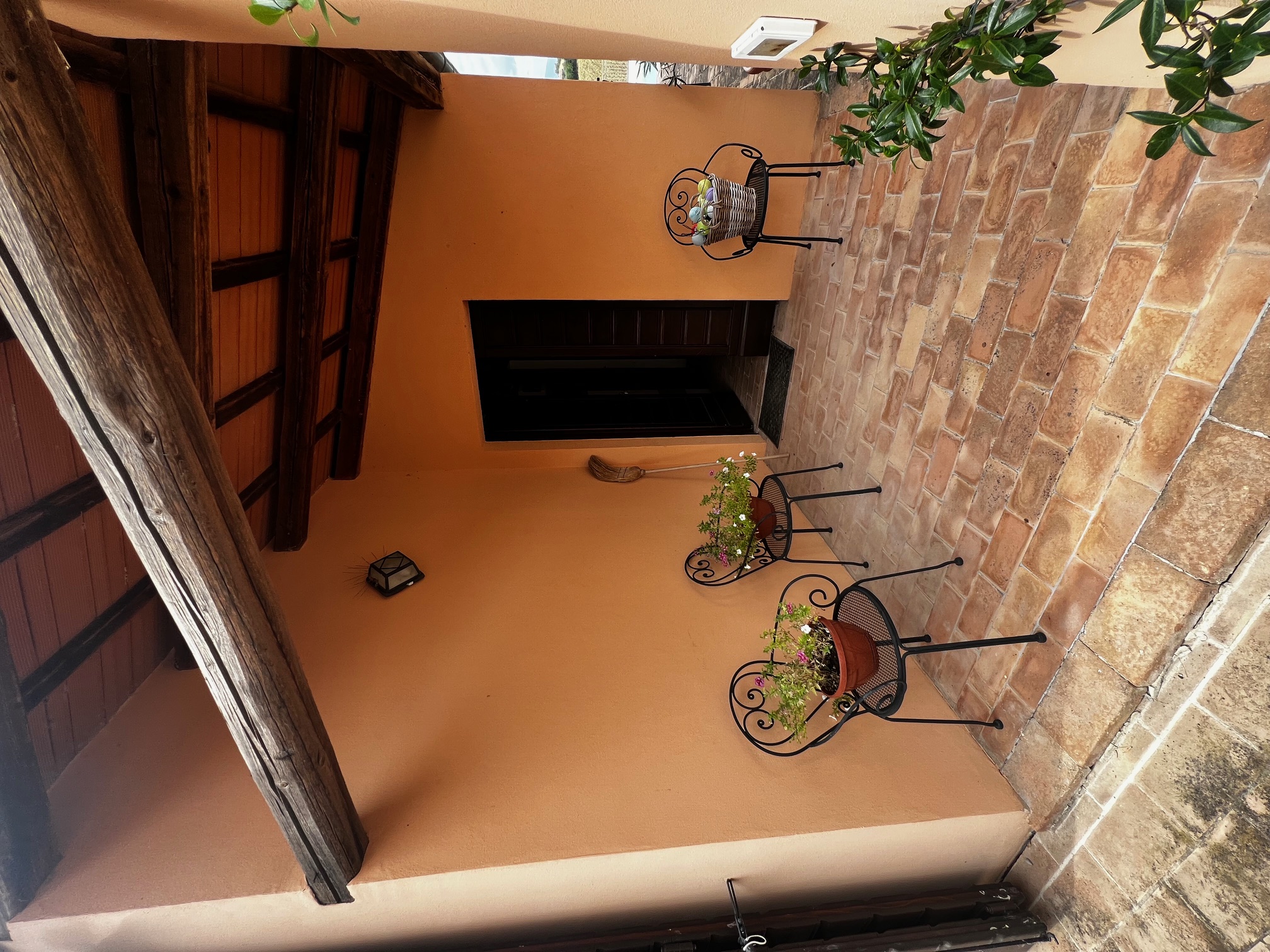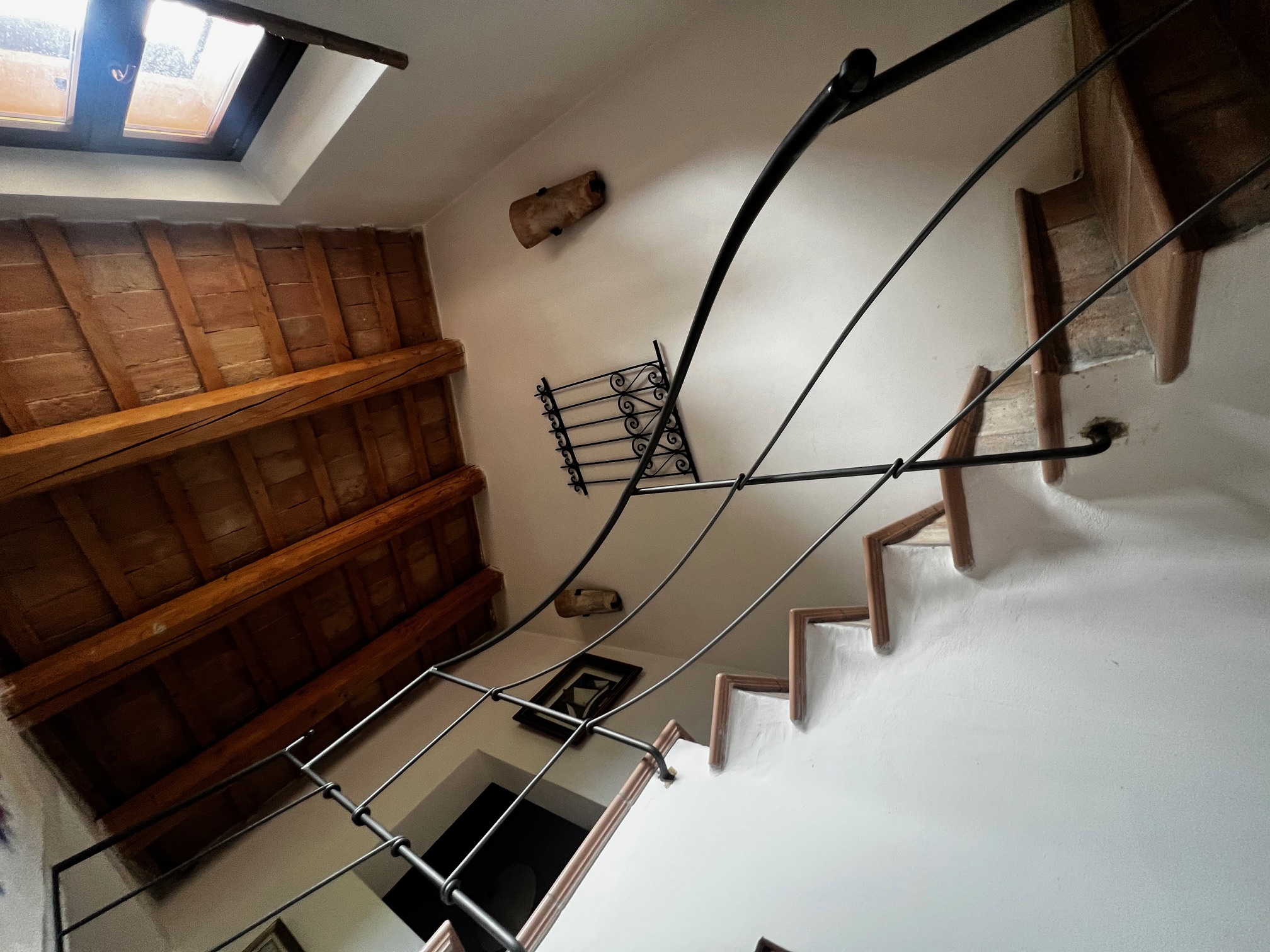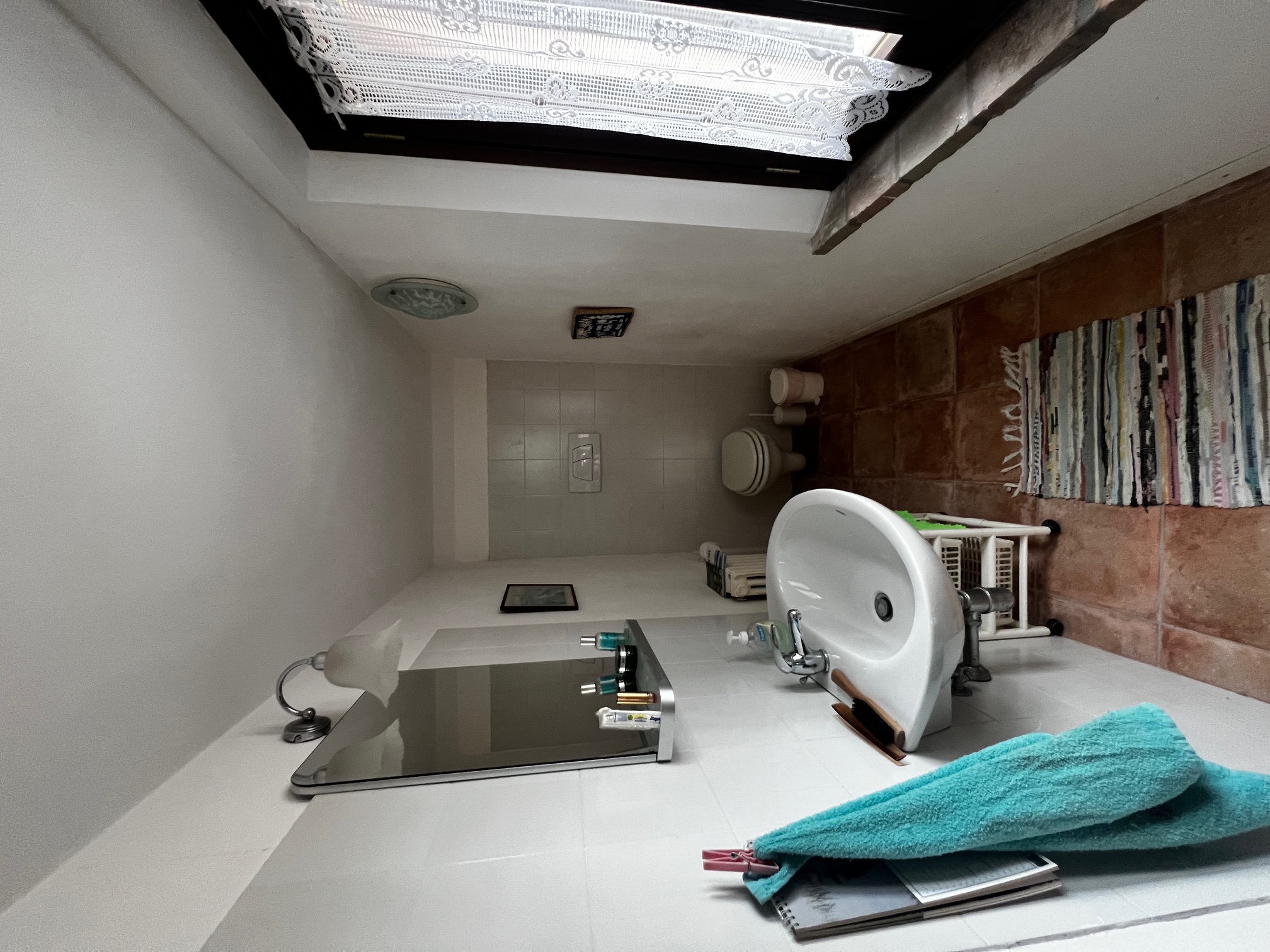 A stylish staircase leads to the master bedroom with adjoining bathroom with very large shower, 2 washbasins, bidet and toilet, a dressing room (wardrobe, could be used as a small bedroom), a living room with fireplace, 3 bedrooms and a bathroom. The first floor is also accessible via an external staircase .