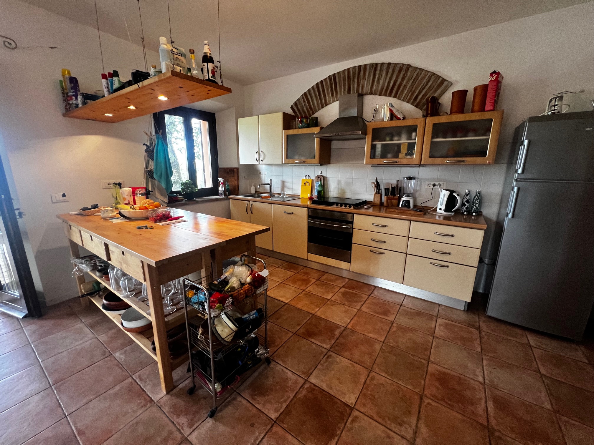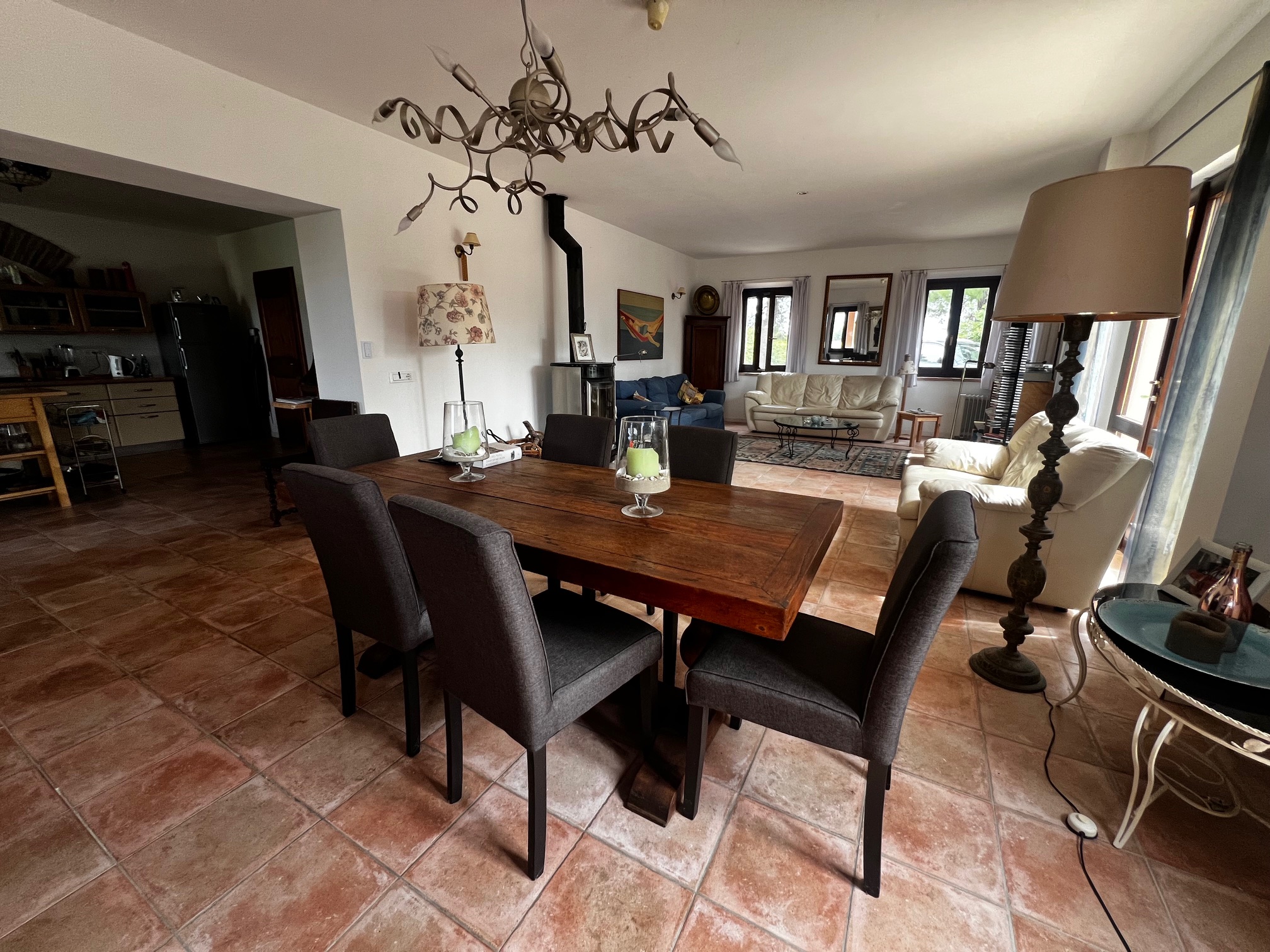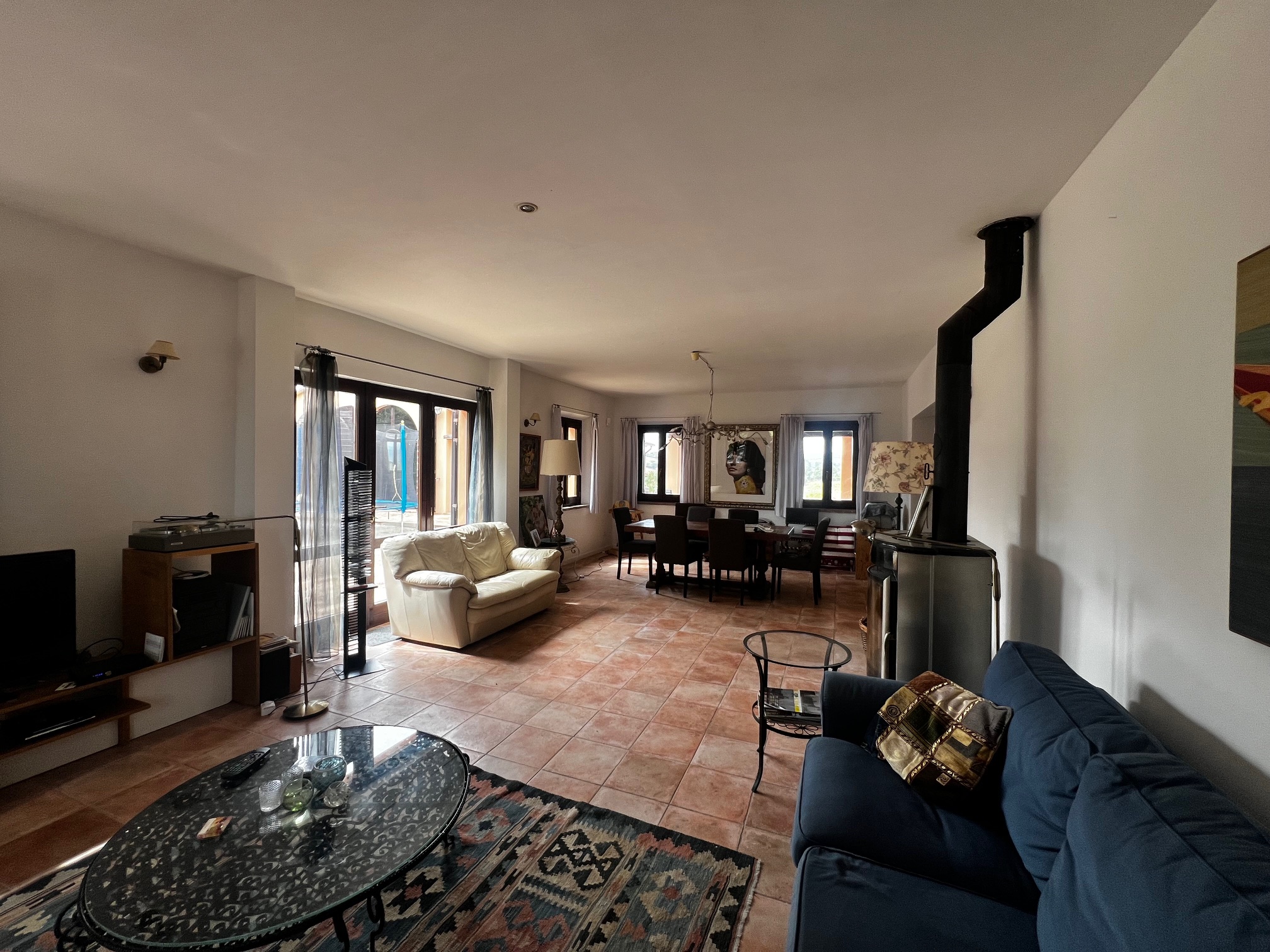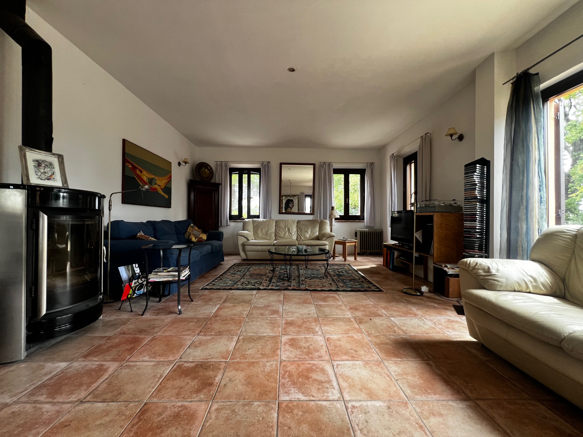 Layout: spacious hall with access to a toilet, several storage rooms, laundry room, study and technical room for the central heating (the boiler needs to be replaced). From the hall there is also access to the living area with open-plan kitchen, dining area and living room with wood-burning stove. French doors lead out onto the terraces surrounding the house: adjoining is a lovely 34 m² veranda offering wonderful views of the pool and the rolling countryside.
