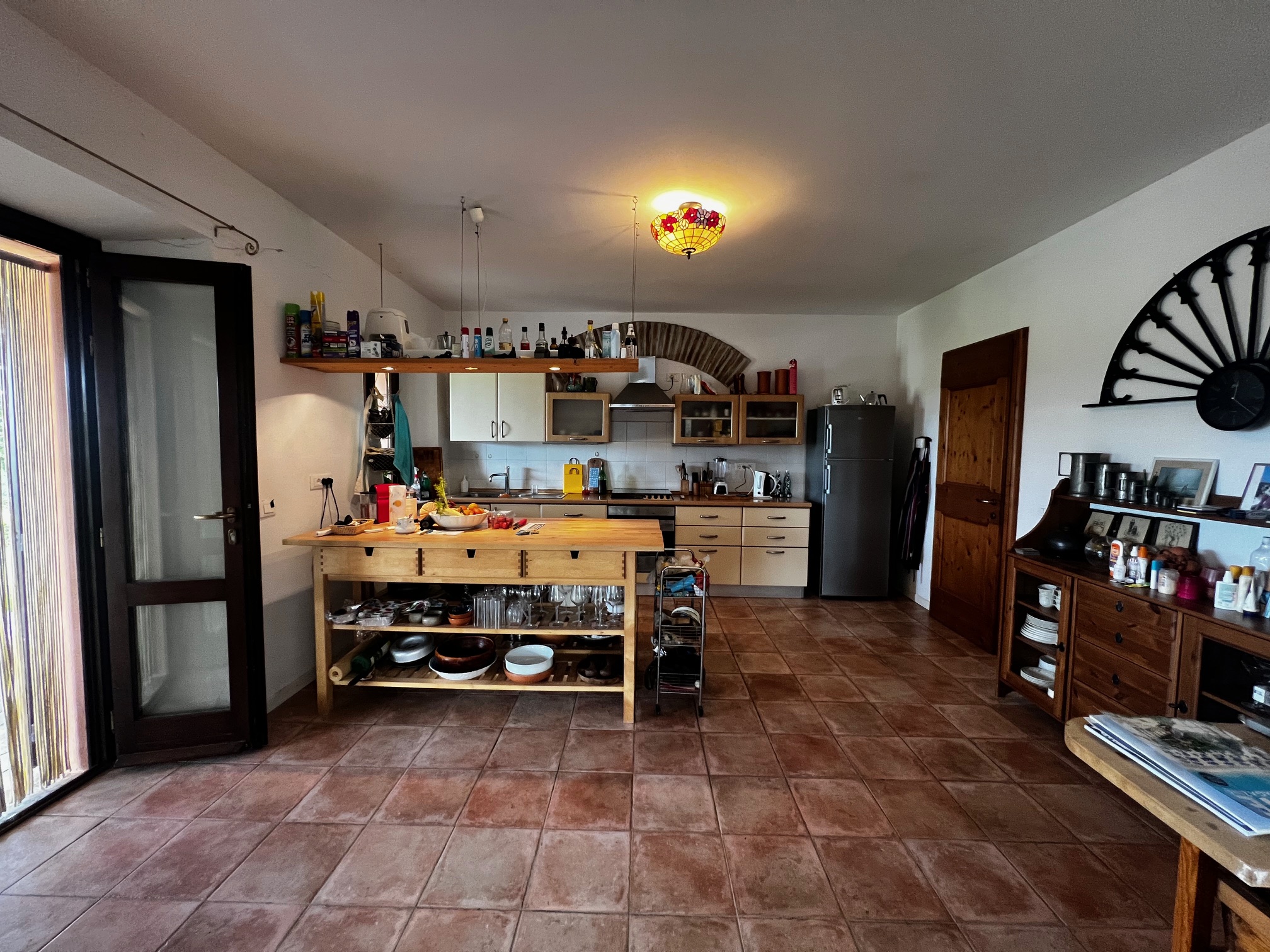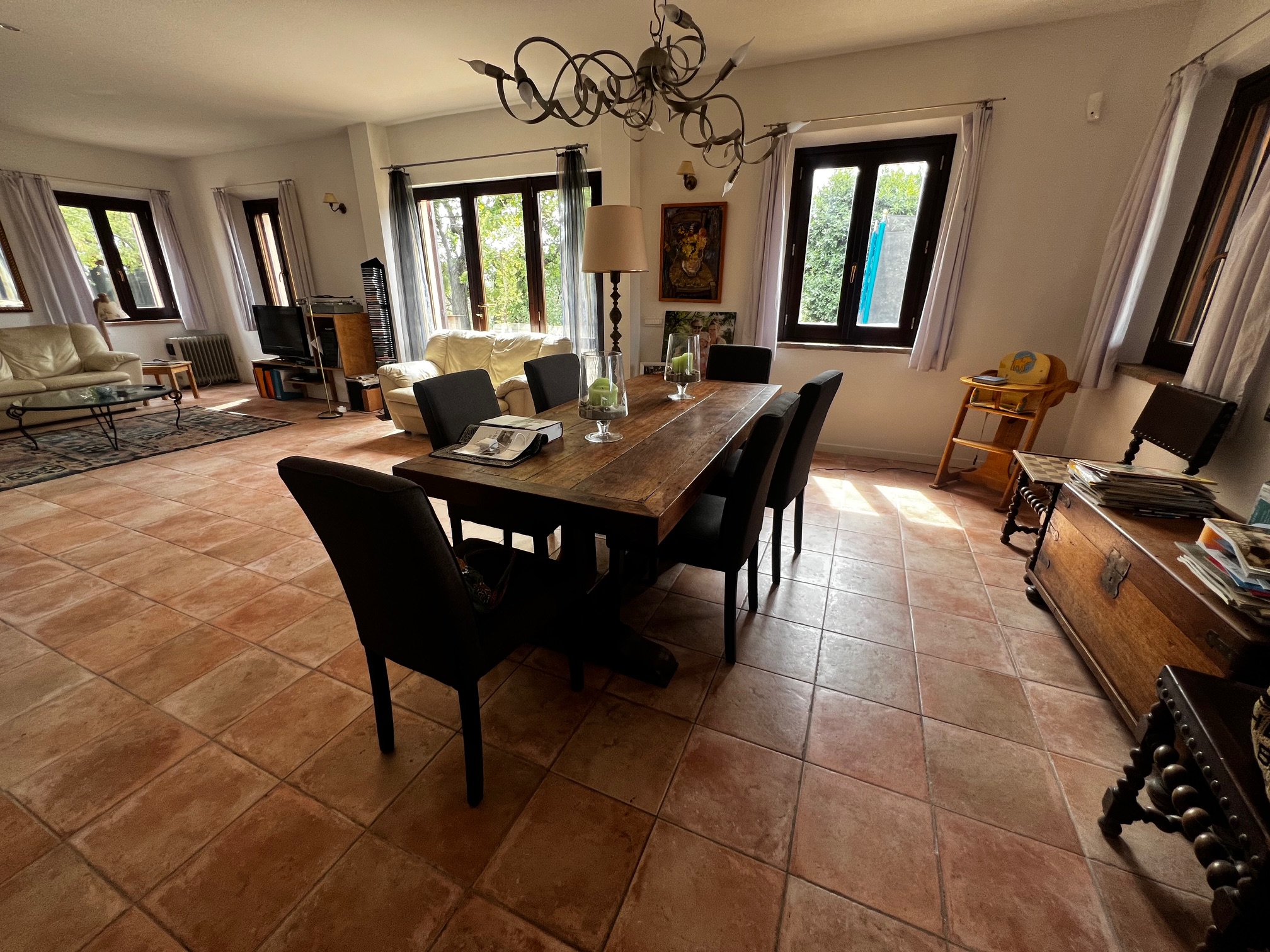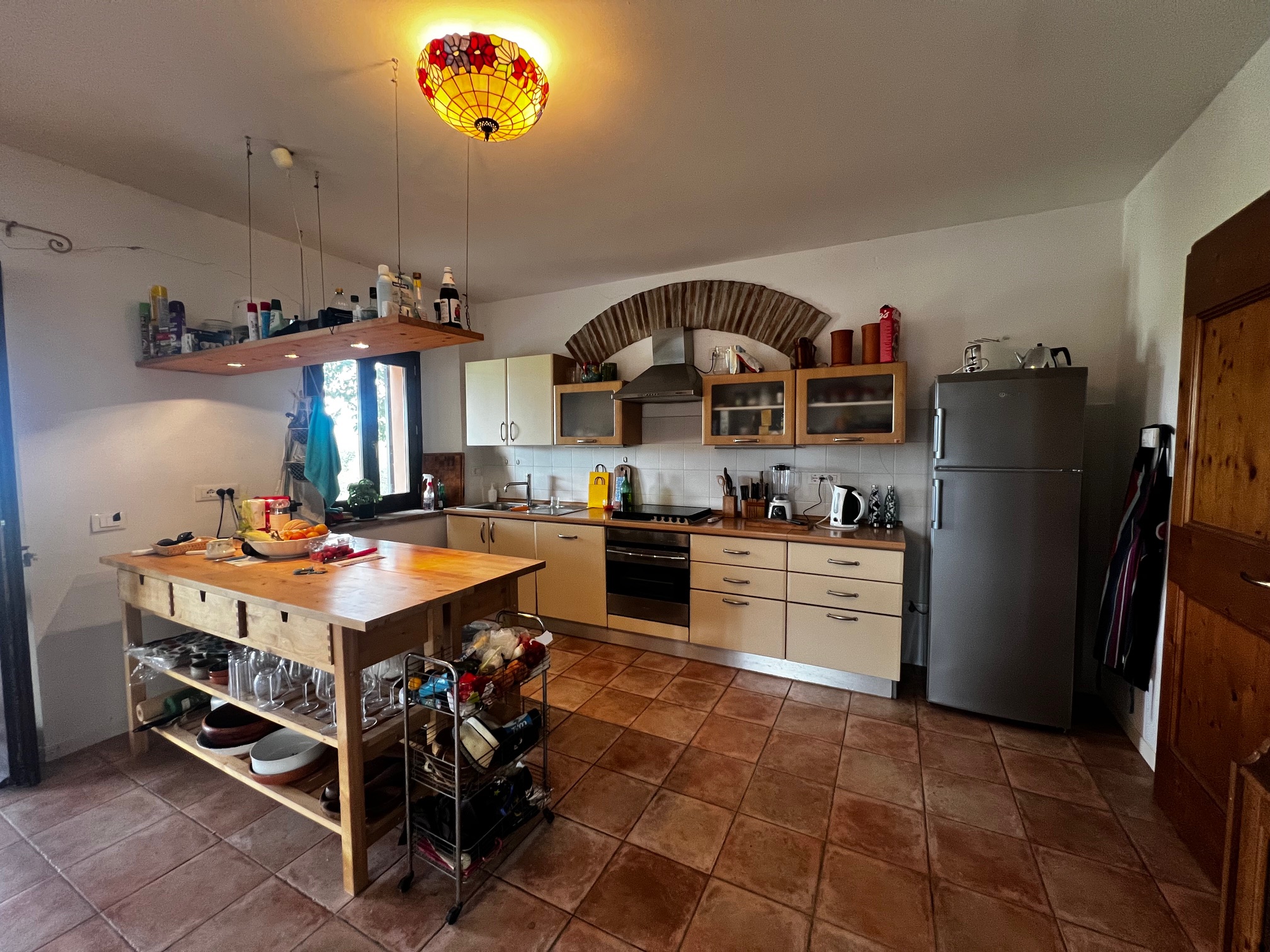 Layout: spacious hall with access to a toilet, several storage rooms, laundry room, study and technical room for the central heating (the boiler needs to be replaced). From the hall there is also access to the living area with open-plan kitchen, dining area and living room with wood-burning stove. French doors lead out onto the terraces surrounding the house: adjoining is a lovely 34 m² veranda offering wonderful views of the pool and the rolling countryside.