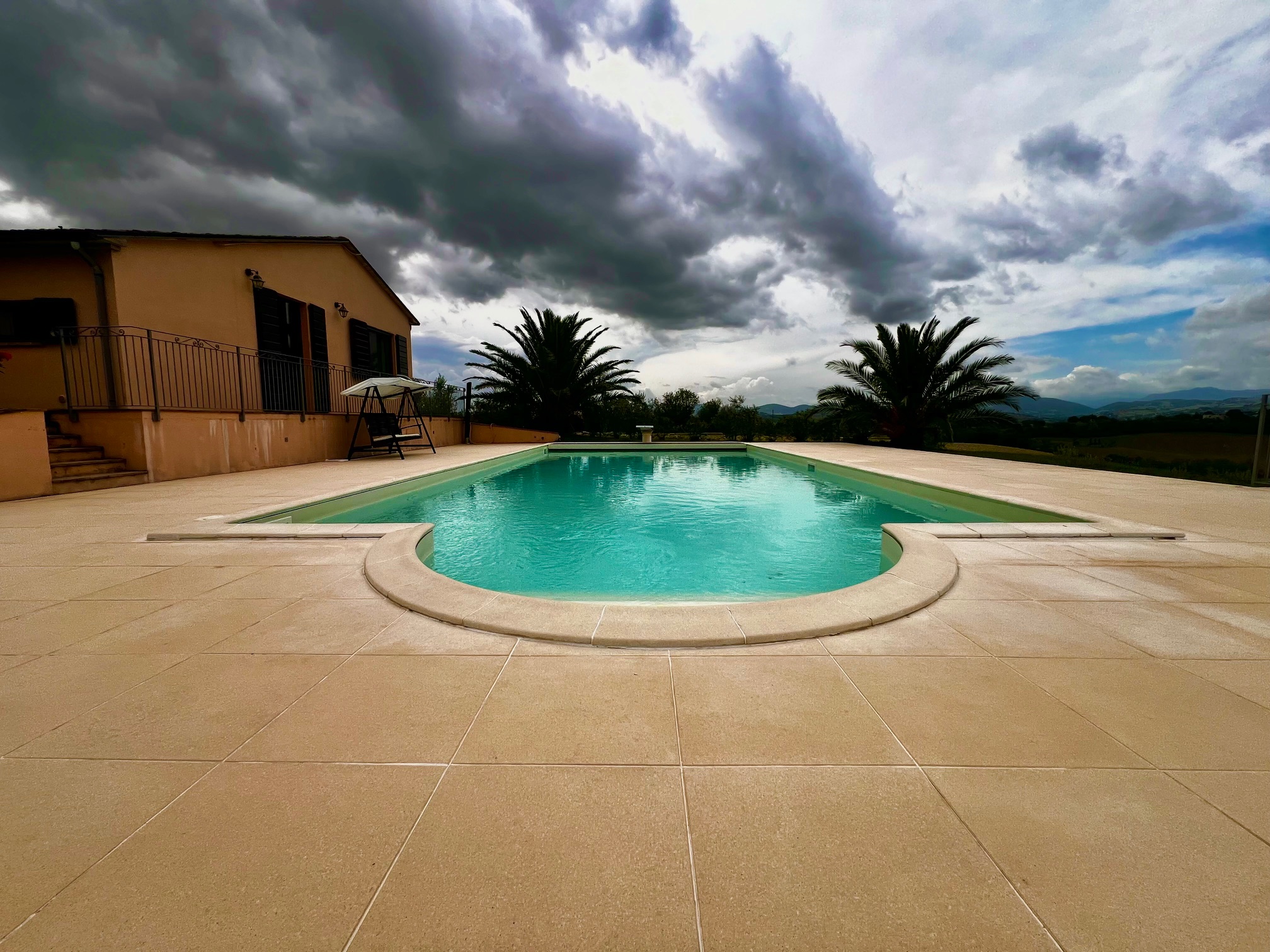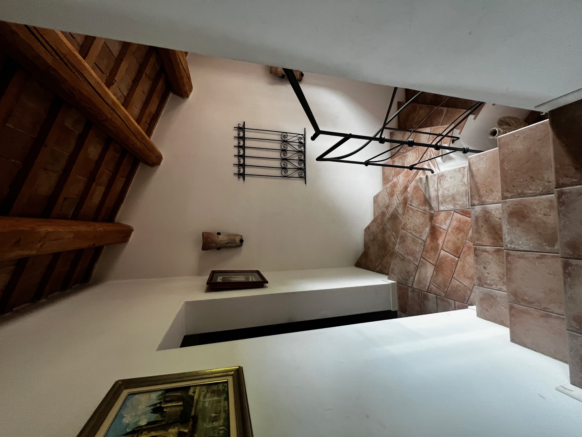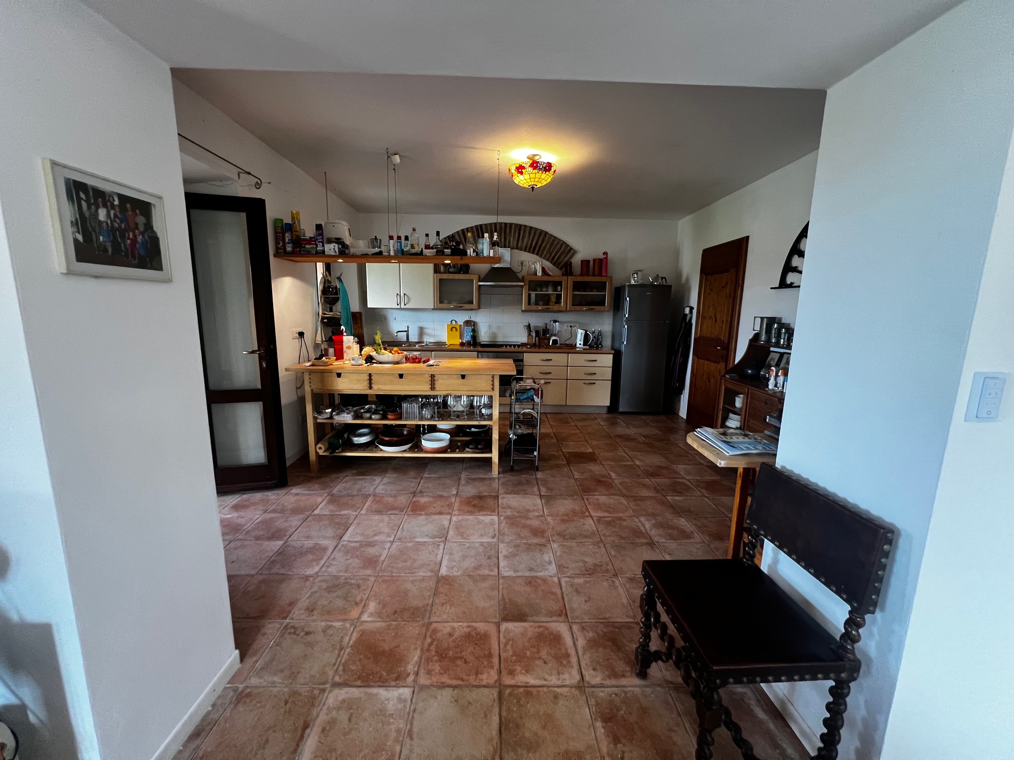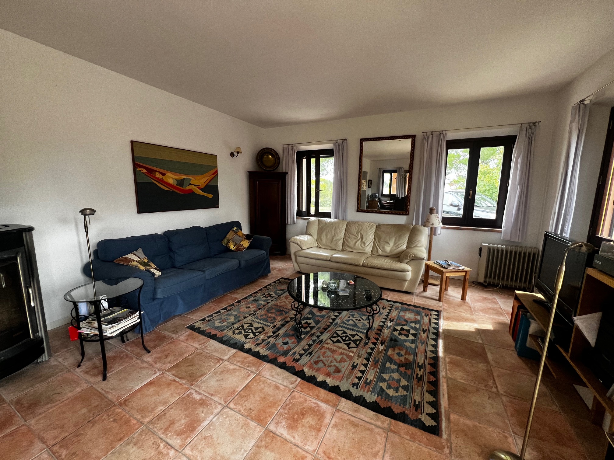 Layout: spacious hall with access to a toilet, several storage rooms, laundry room, study and technical room for the central heating (the boiler needs to be replaced). From the hall there is also access to the living area with open-plan kitchen, dining area and living room with wood-burning stove. French doors lead out onto the terraces surrounding the house: adjoining is a lovely 34 m² veranda offering wonderful views of the pool and the rolling countryside.