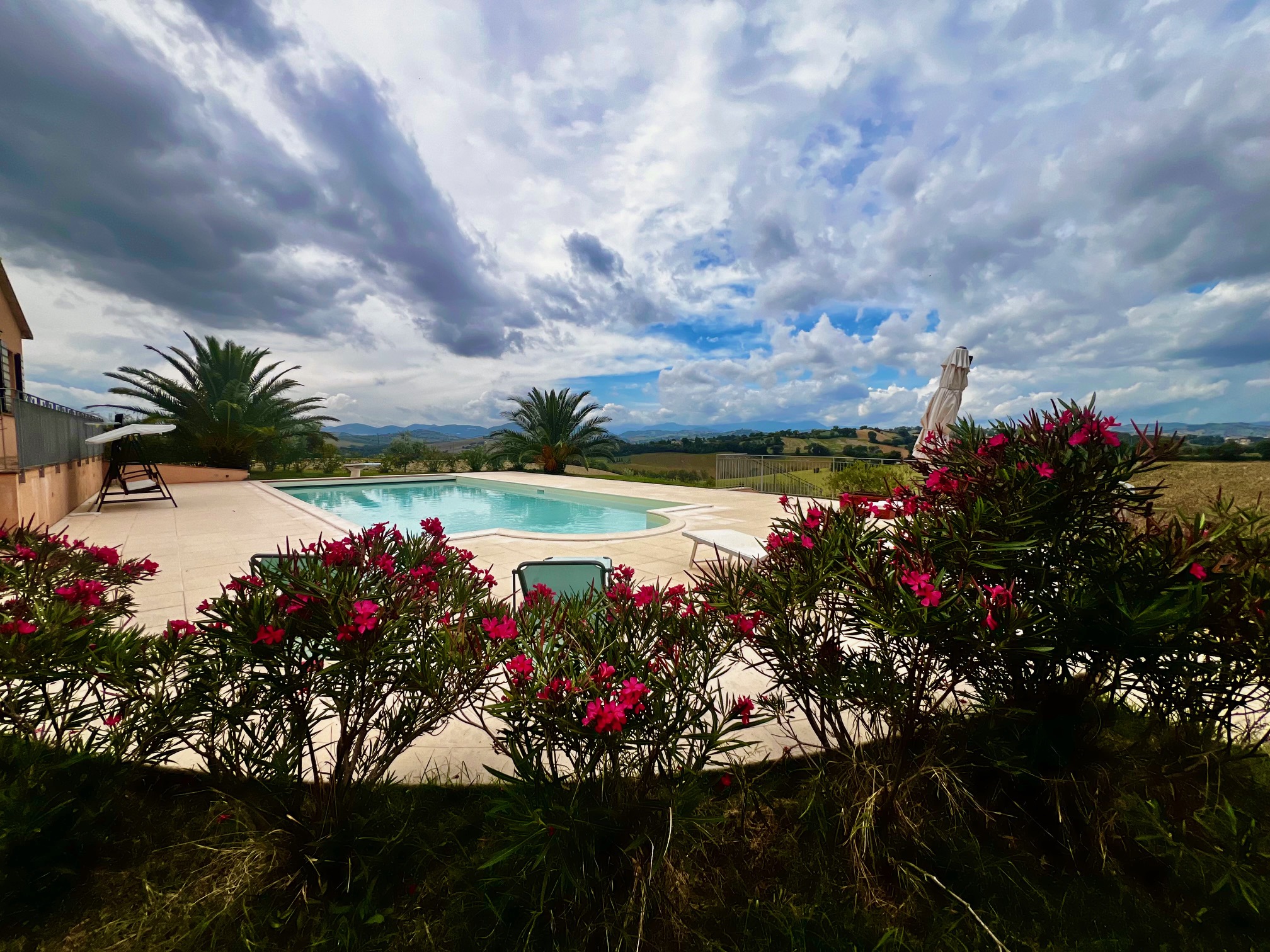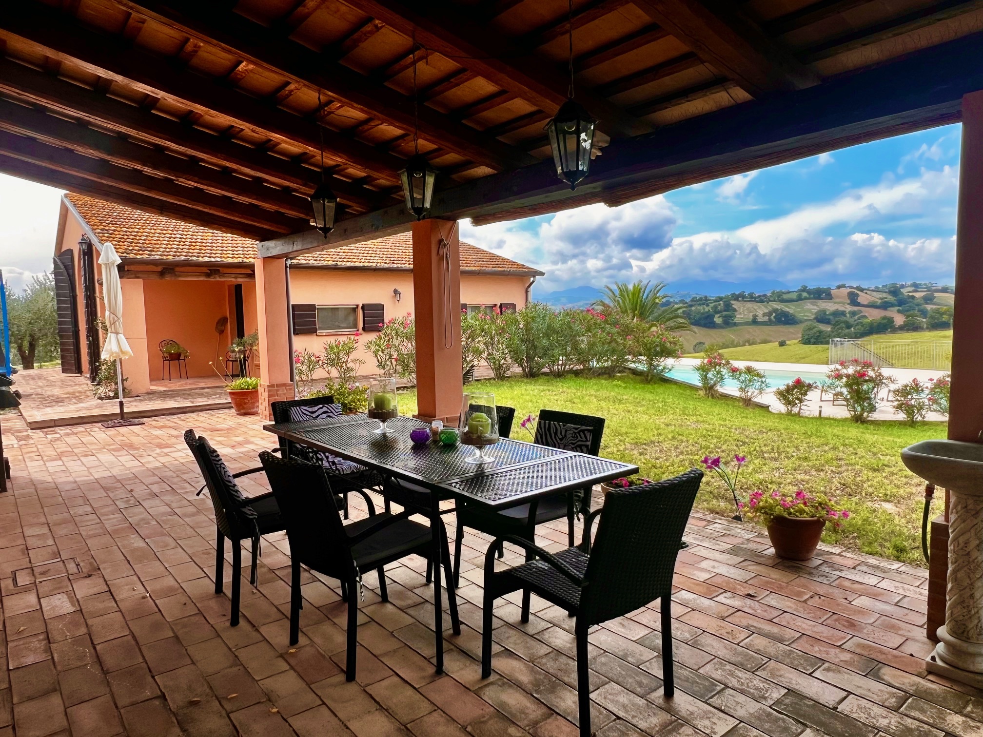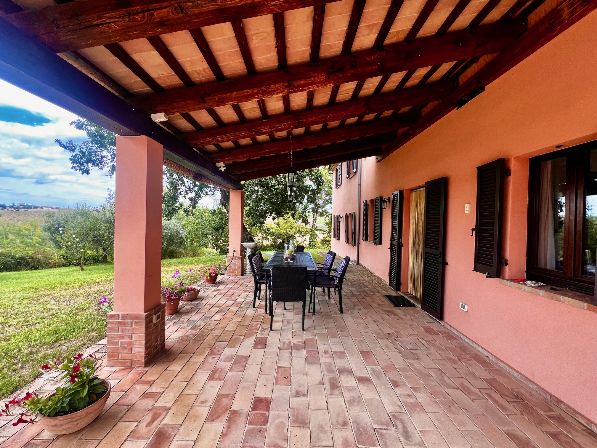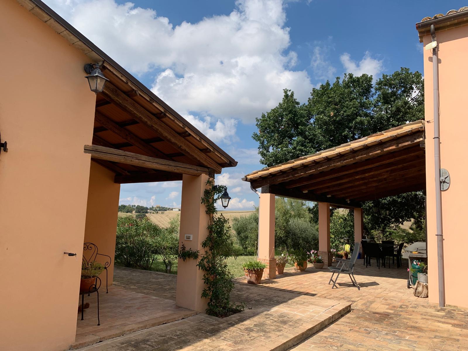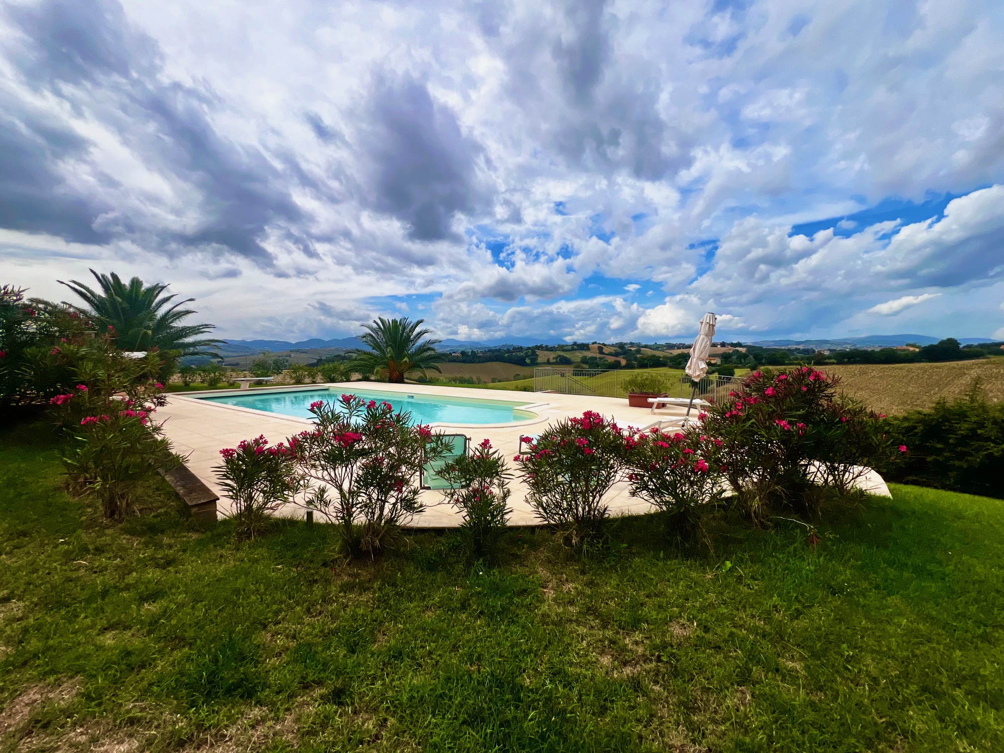 This beautiful country house with outbuilding and swimming pool is located on a hill near Castelleone di Suasa, with magnificent views of this medieval town, Ostra Vetere and Barbara from sunrise to sunset.