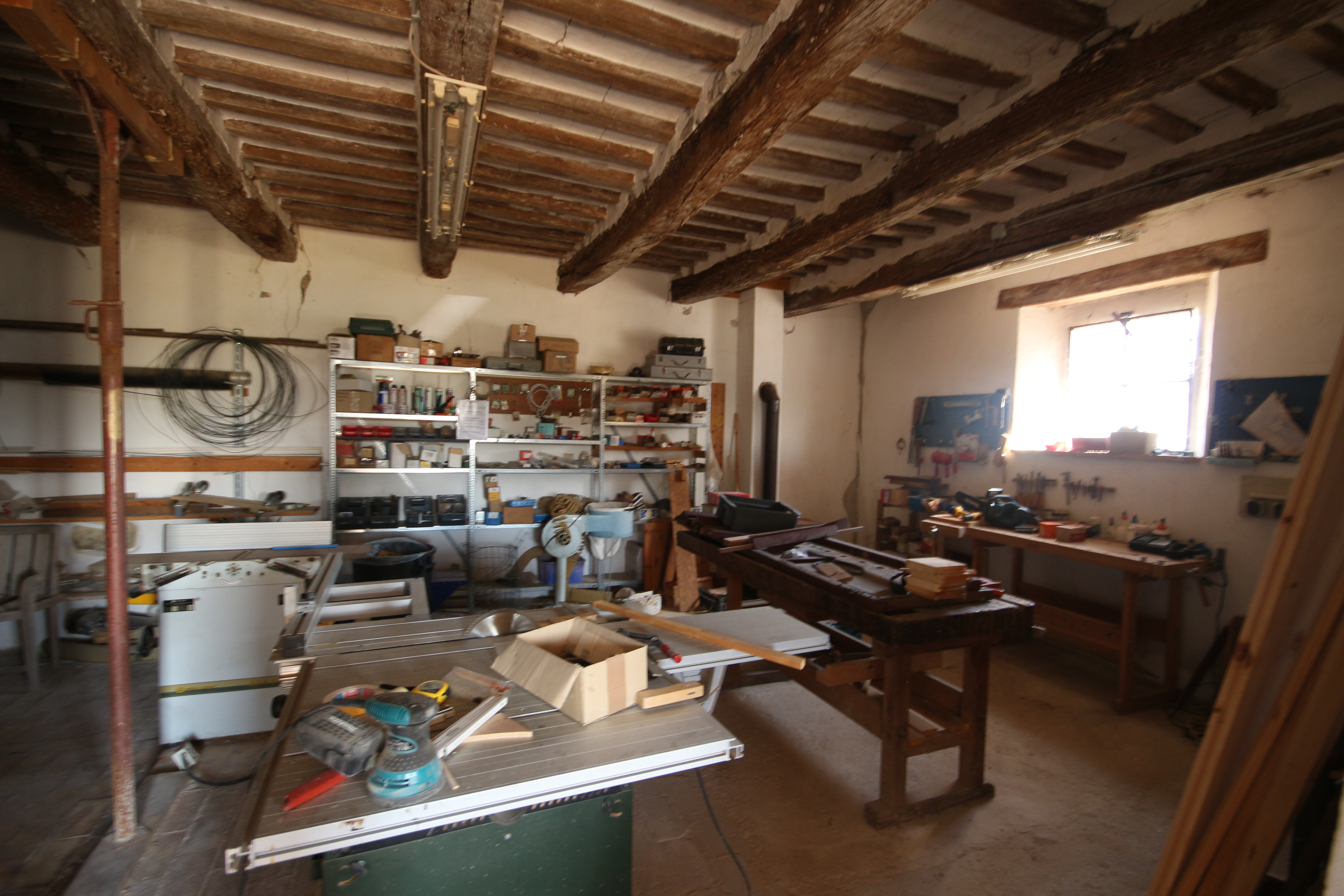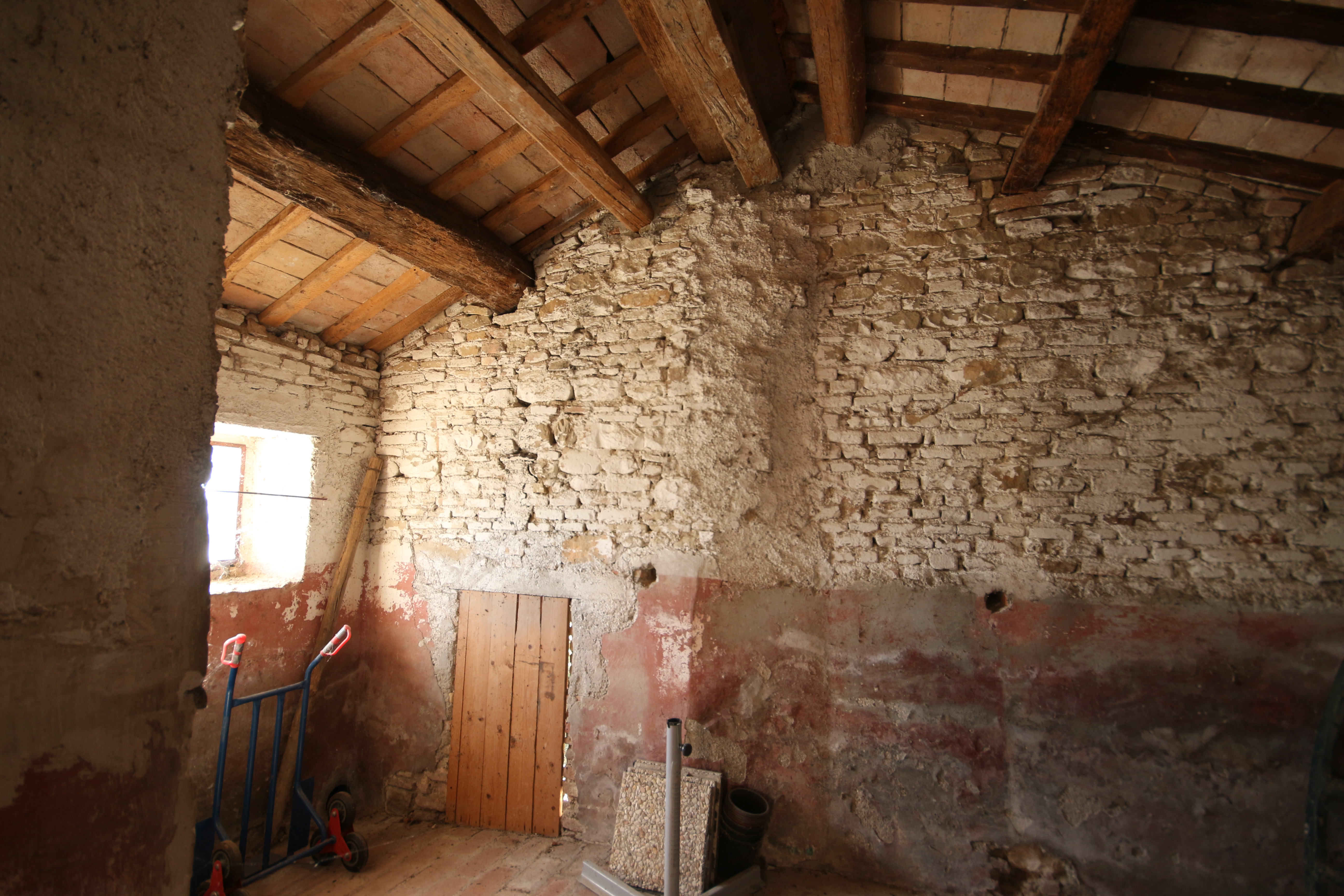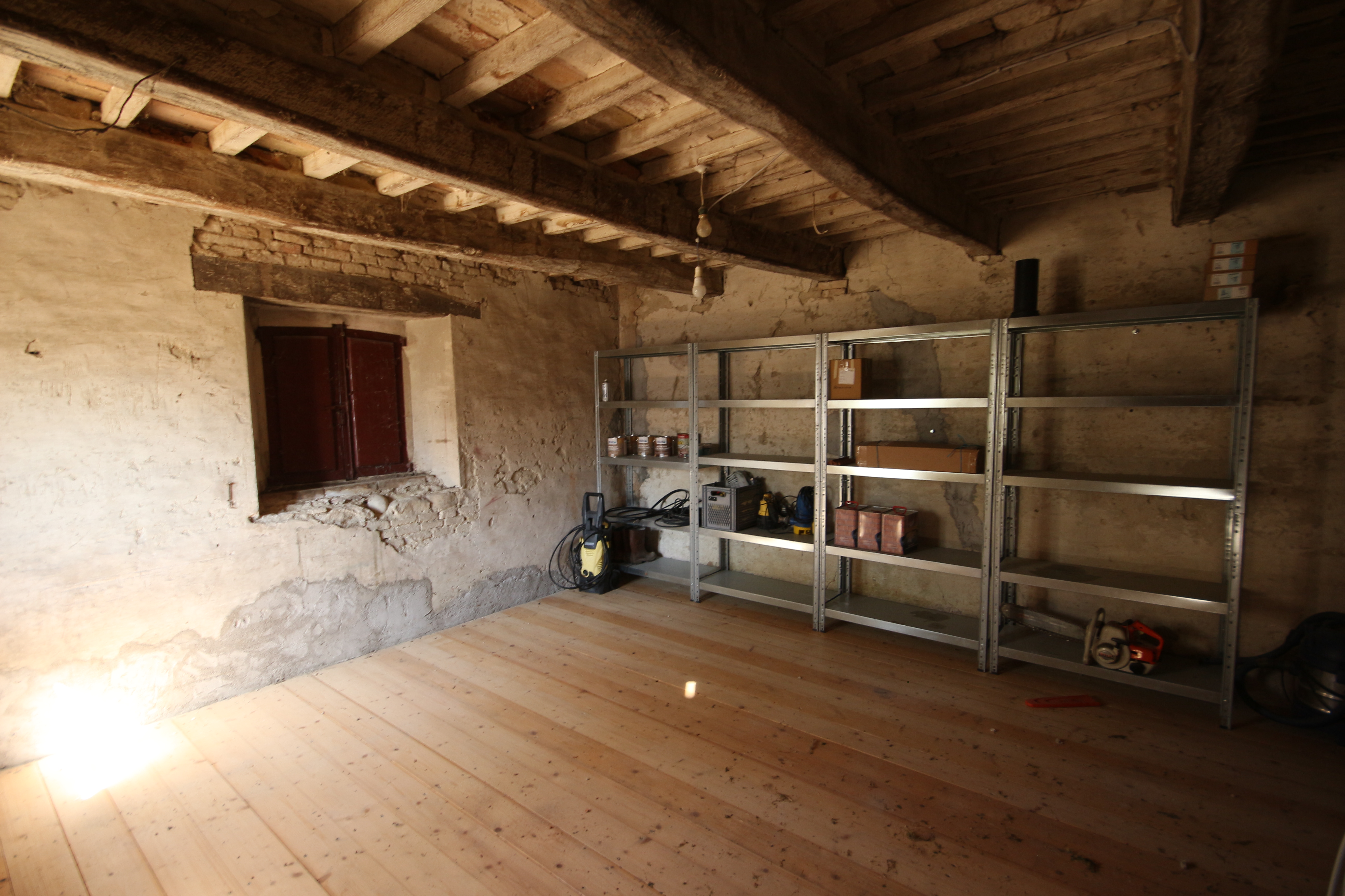 The second residential unit still needs to be renovated. The roof is currently being restored and insulated. This over 300-year-old building breathes history: from the basement with a natural spring to the characteristic rear entrance with external staircase, which has been enclosed by an intimate garden over the years. The ground floor houses a workshop and storerooms totalling about 100 m². The first and second floors can offer space for three flats.