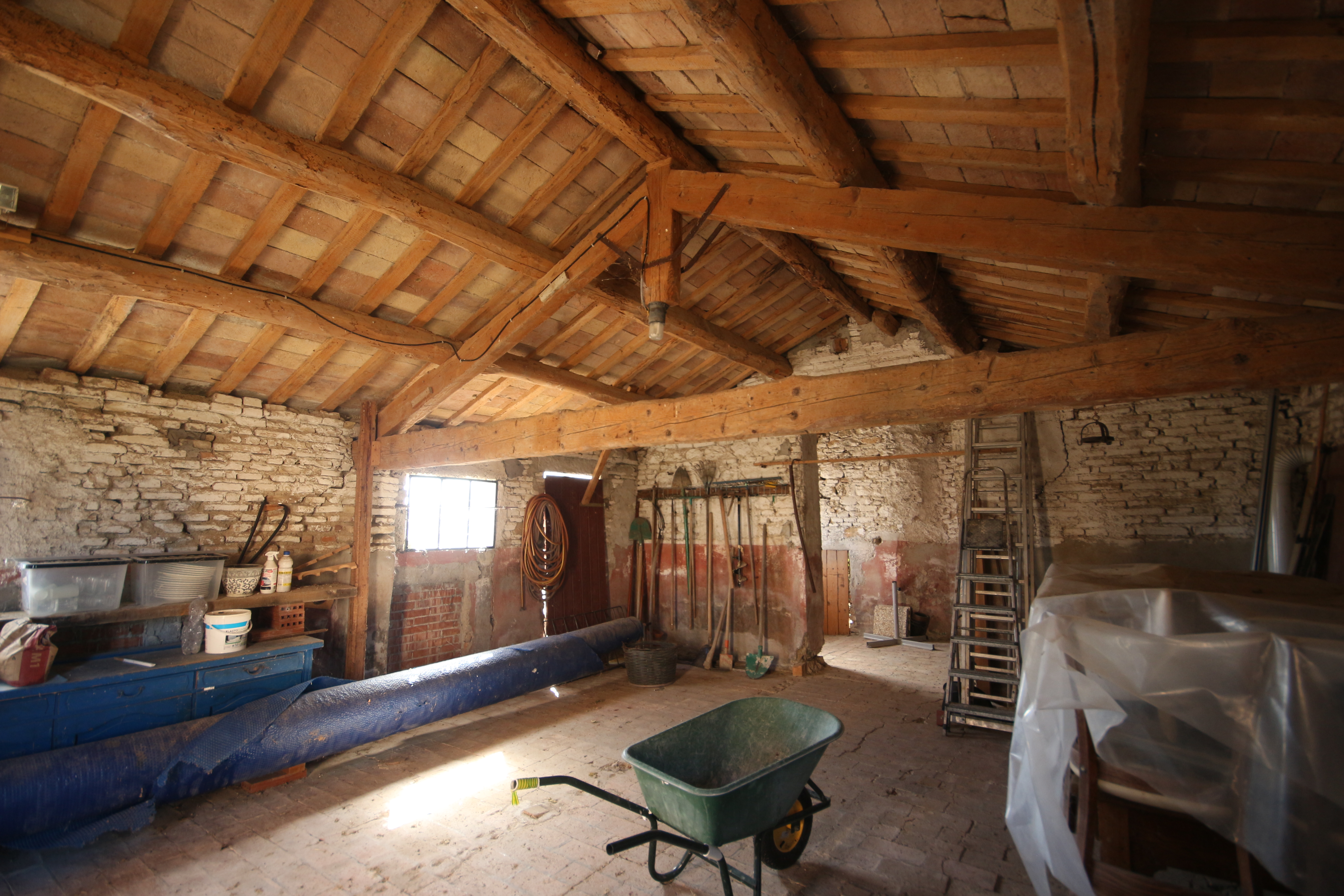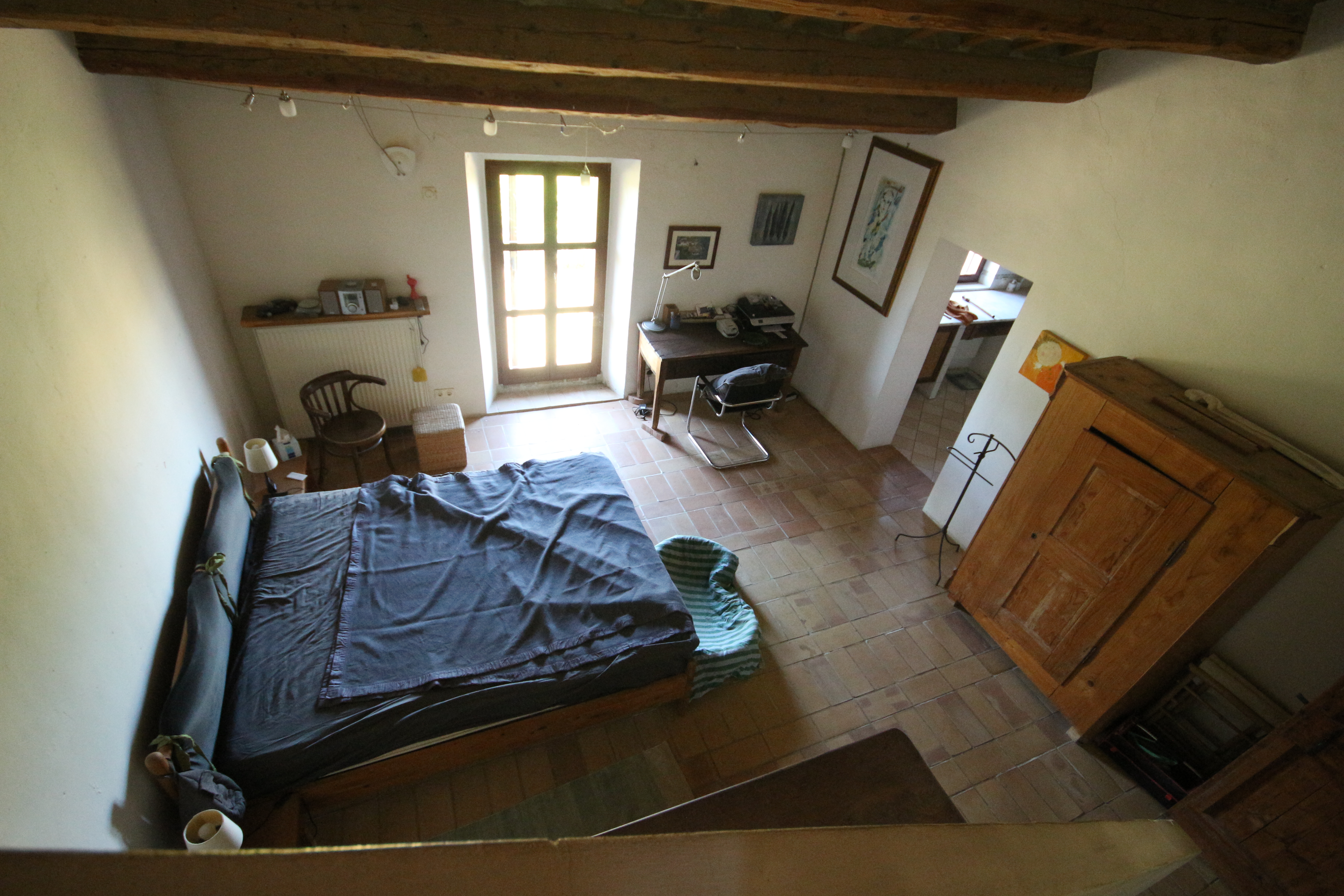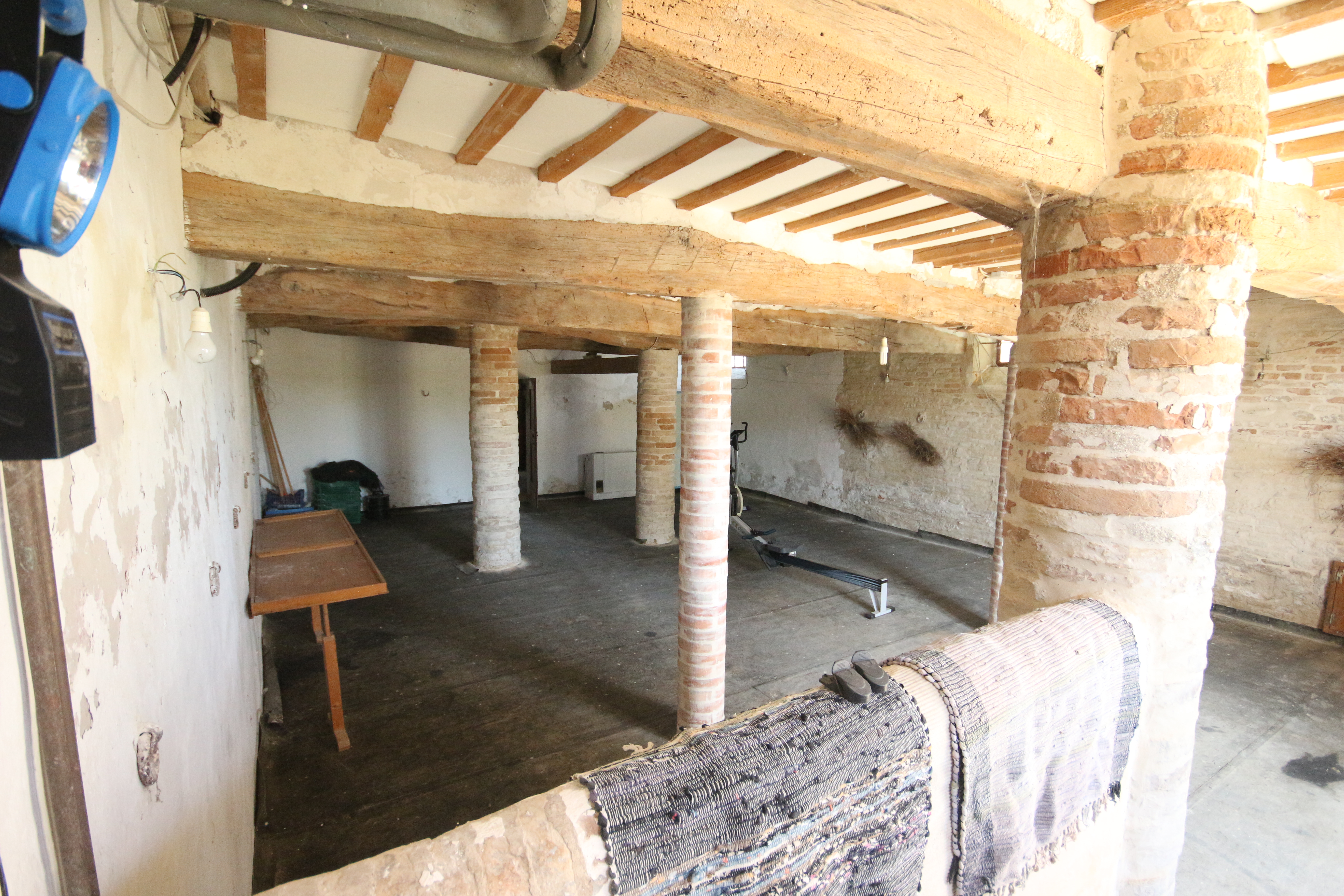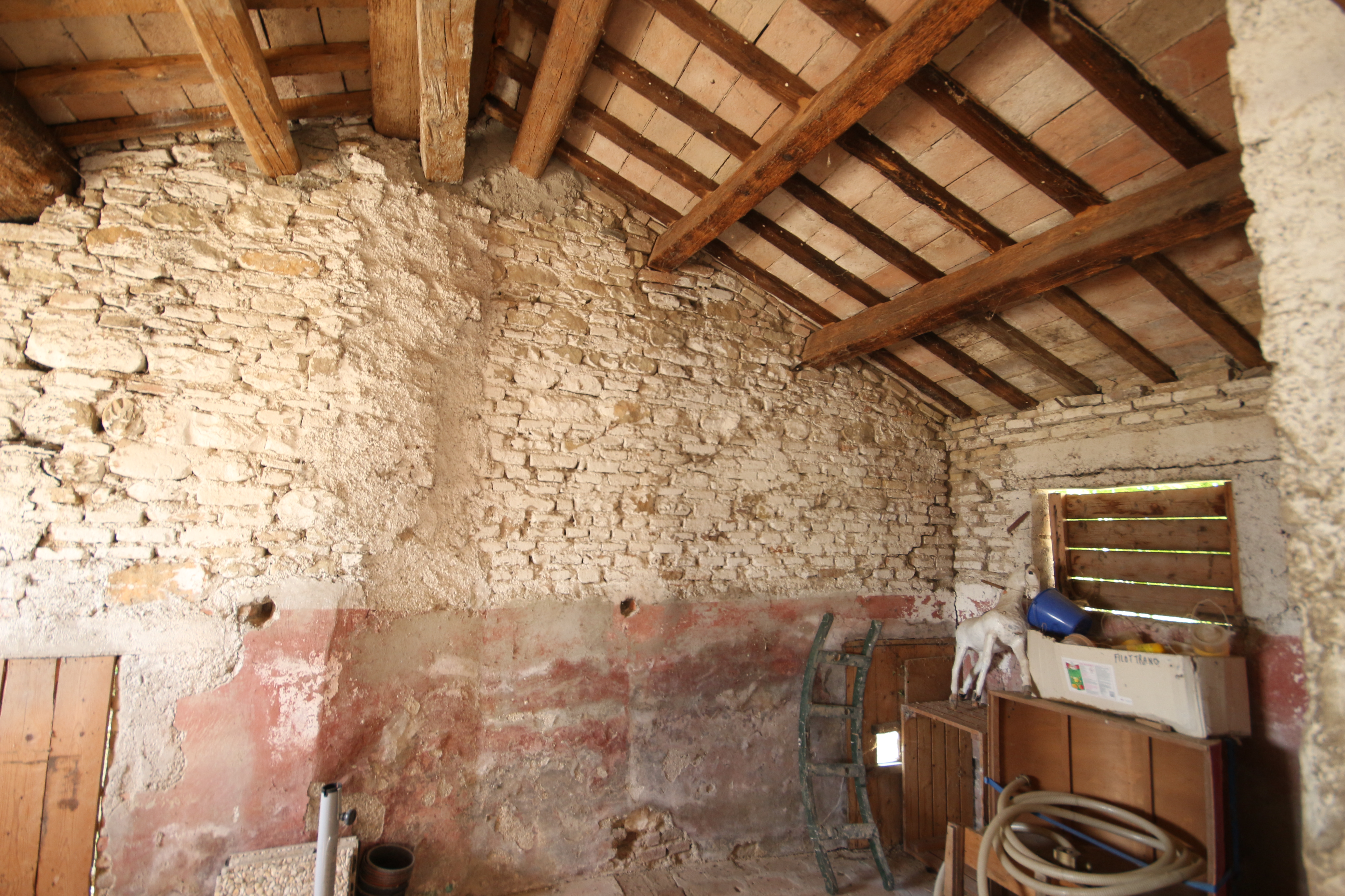 The second residential unit still needs to be renovated. The roof is currently being restored and insulated. This over 300-year-old building breathes history: from the basement with a natural spring to the characteristic rear entrance with external staircase, which has been enclosed by an intimate garden over the years. The ground floor houses a workshop and storerooms totalling about 100 m². The first and second floors can offer space for three flats.