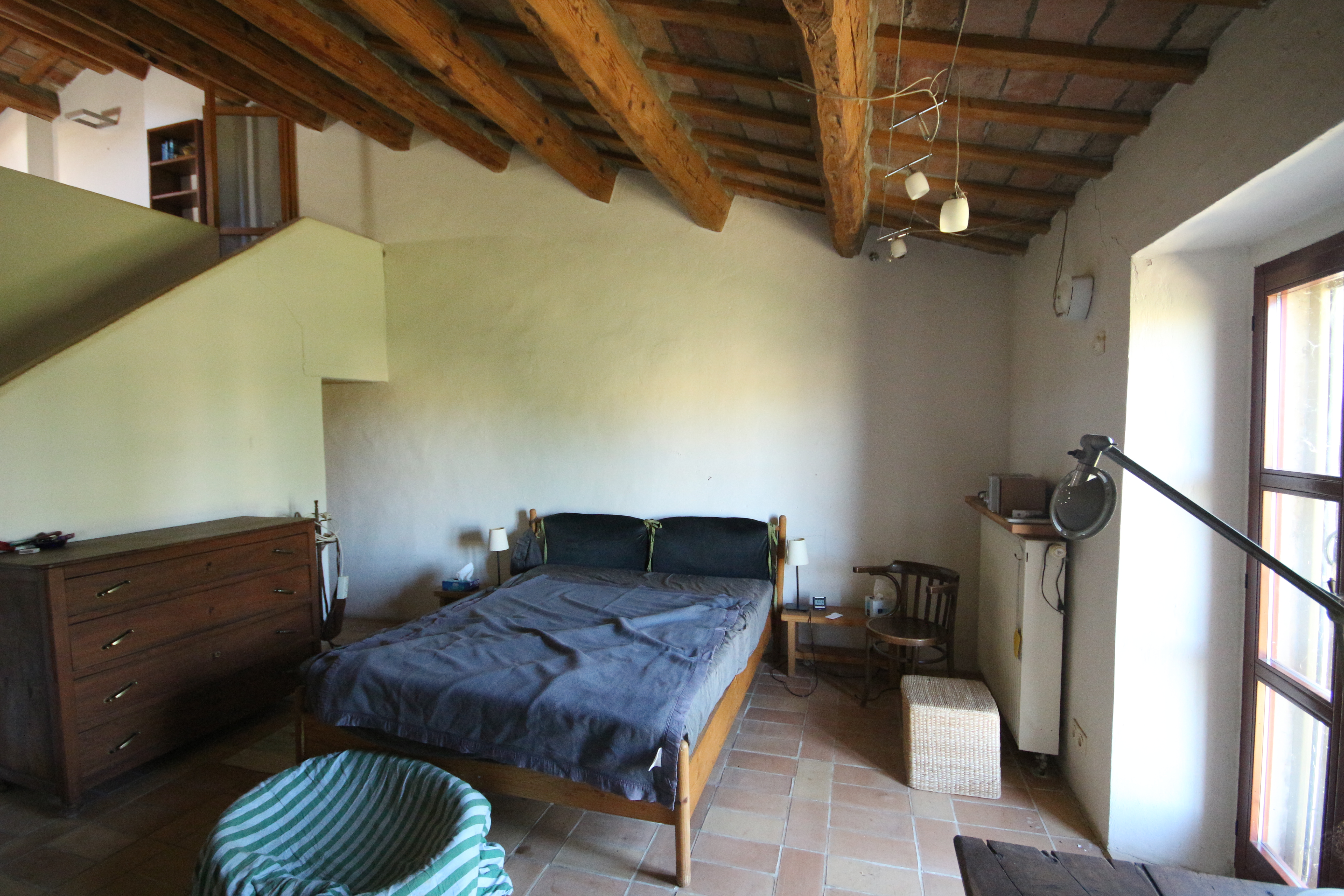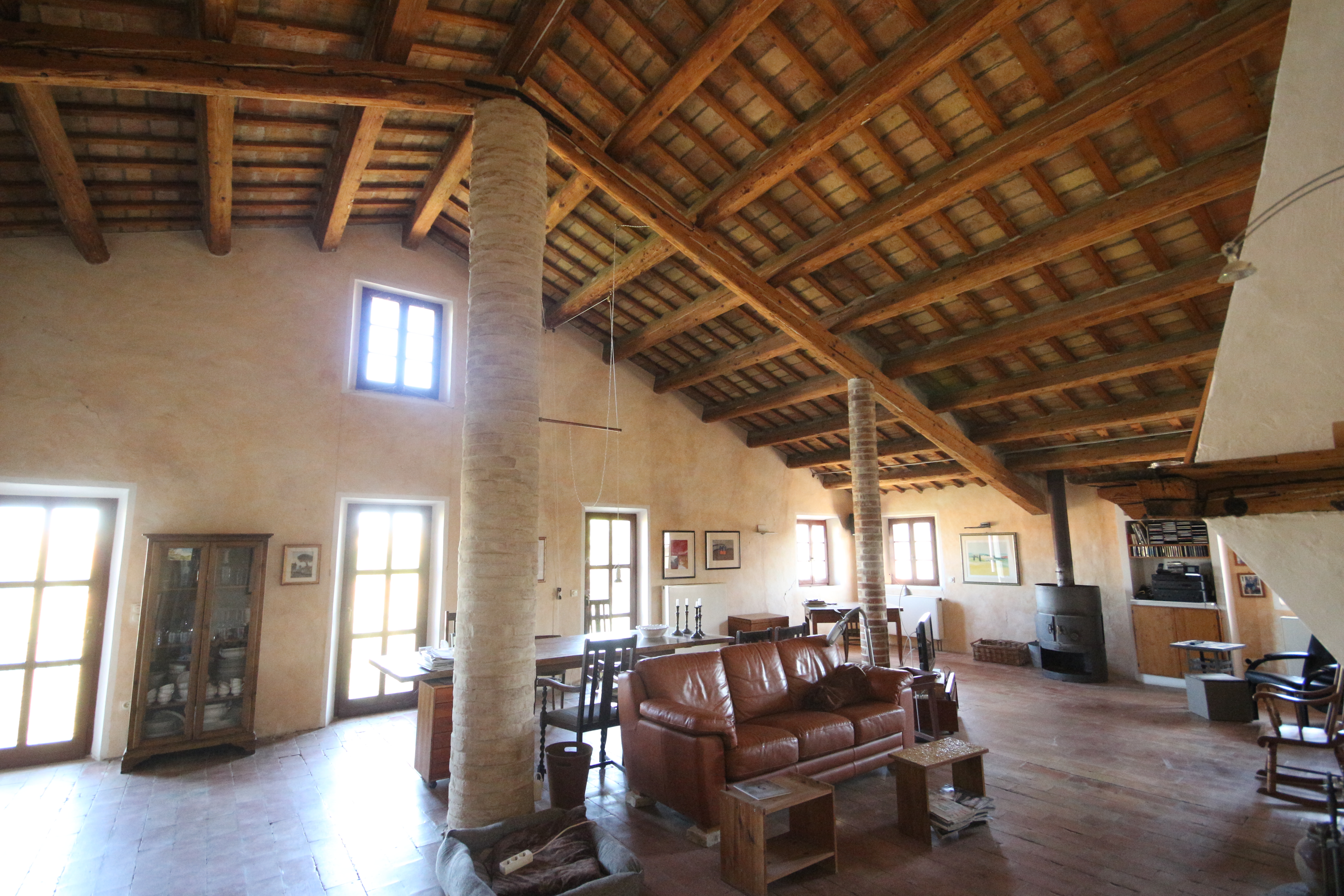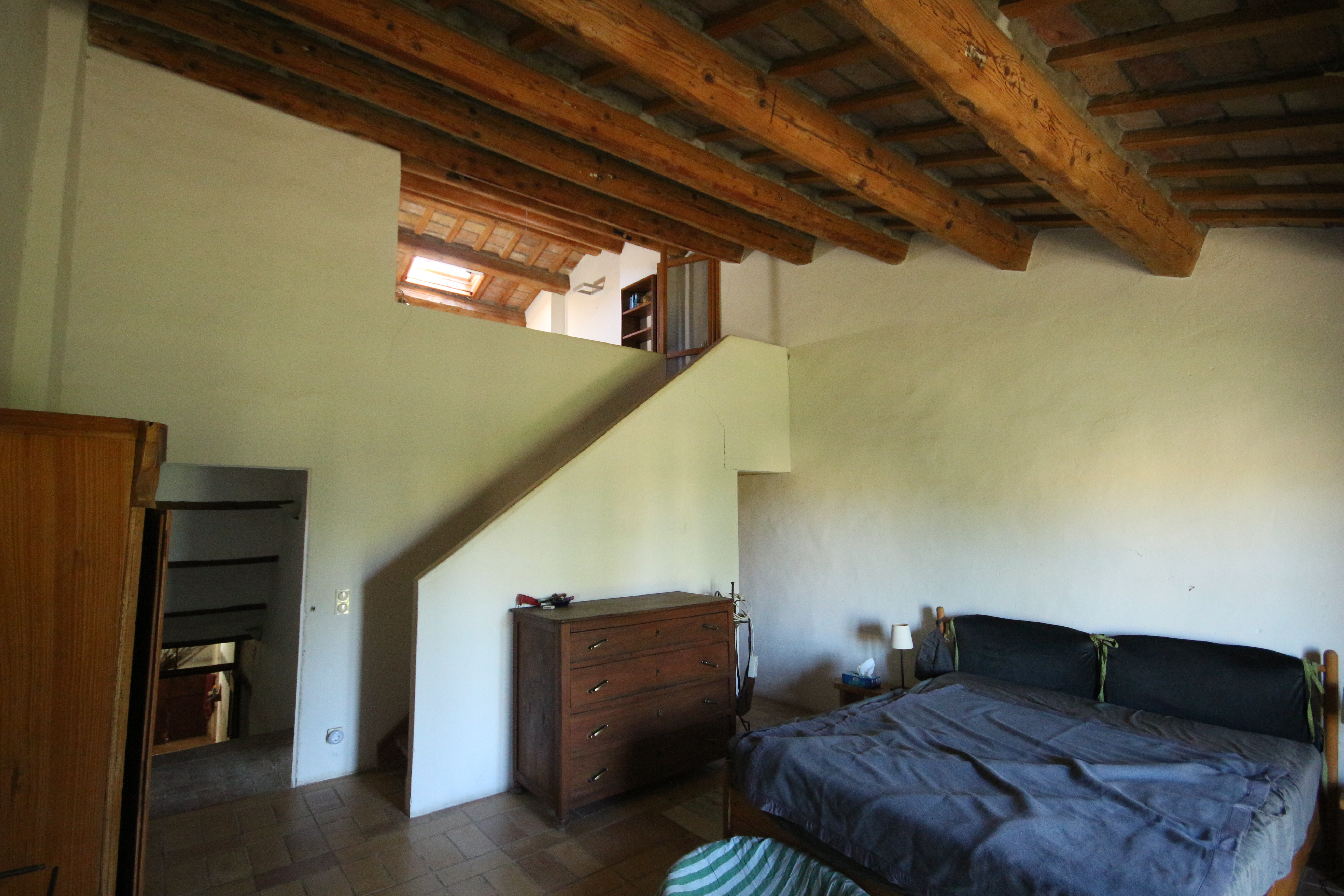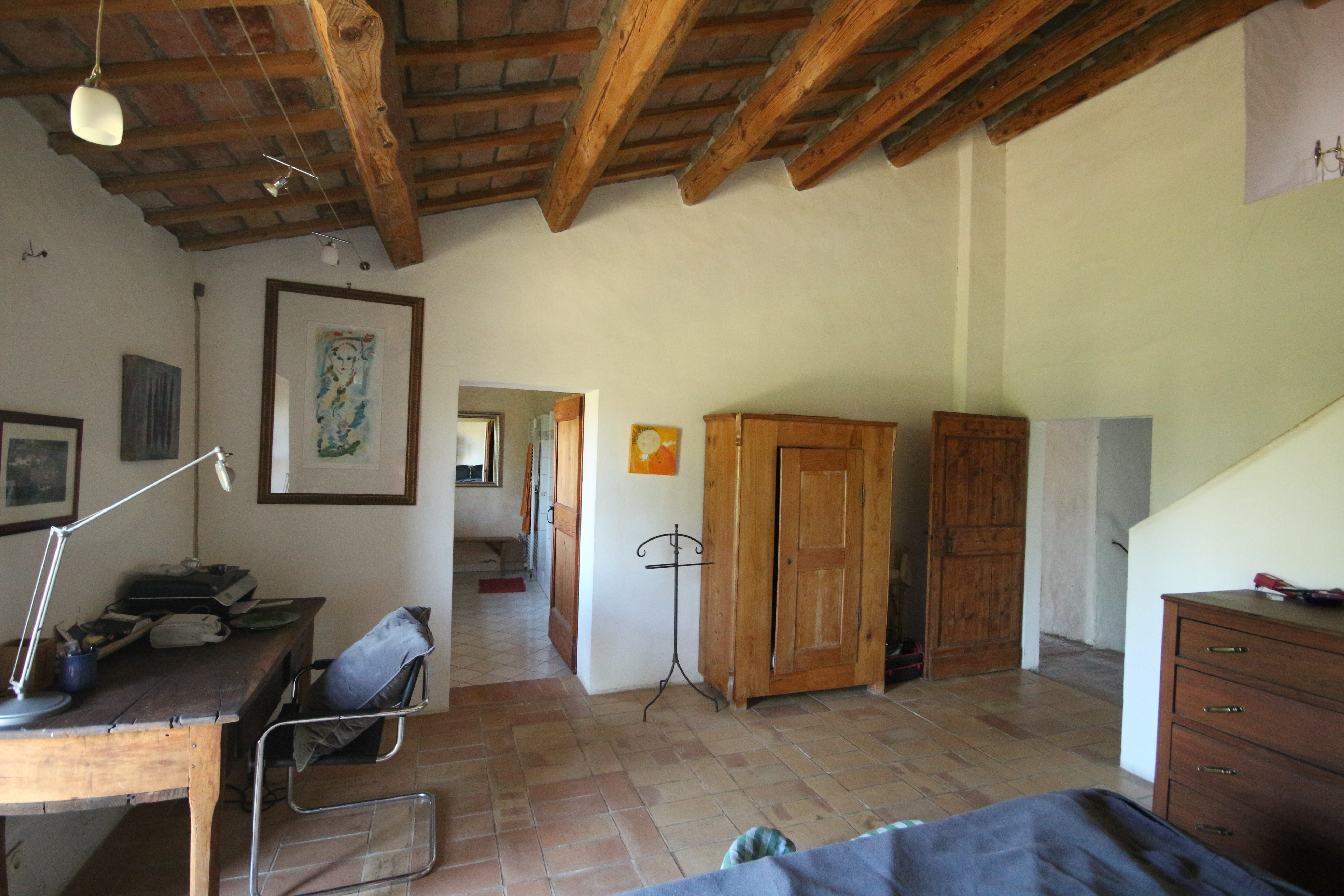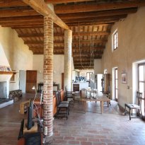 The first floor houses, on the right-hand side, an impressive 86 m² living room. Here, the generous height, the fireplace, the cast-iron stove and the beautiful ceiling with wooden beams and terracotta tiles immediately stand out. The master bedroom has a loft, a walk-in wardrobe and a private bathroom with double washbasin. There is also a comfortable guest room with a private bathroom, accessible from the living room.