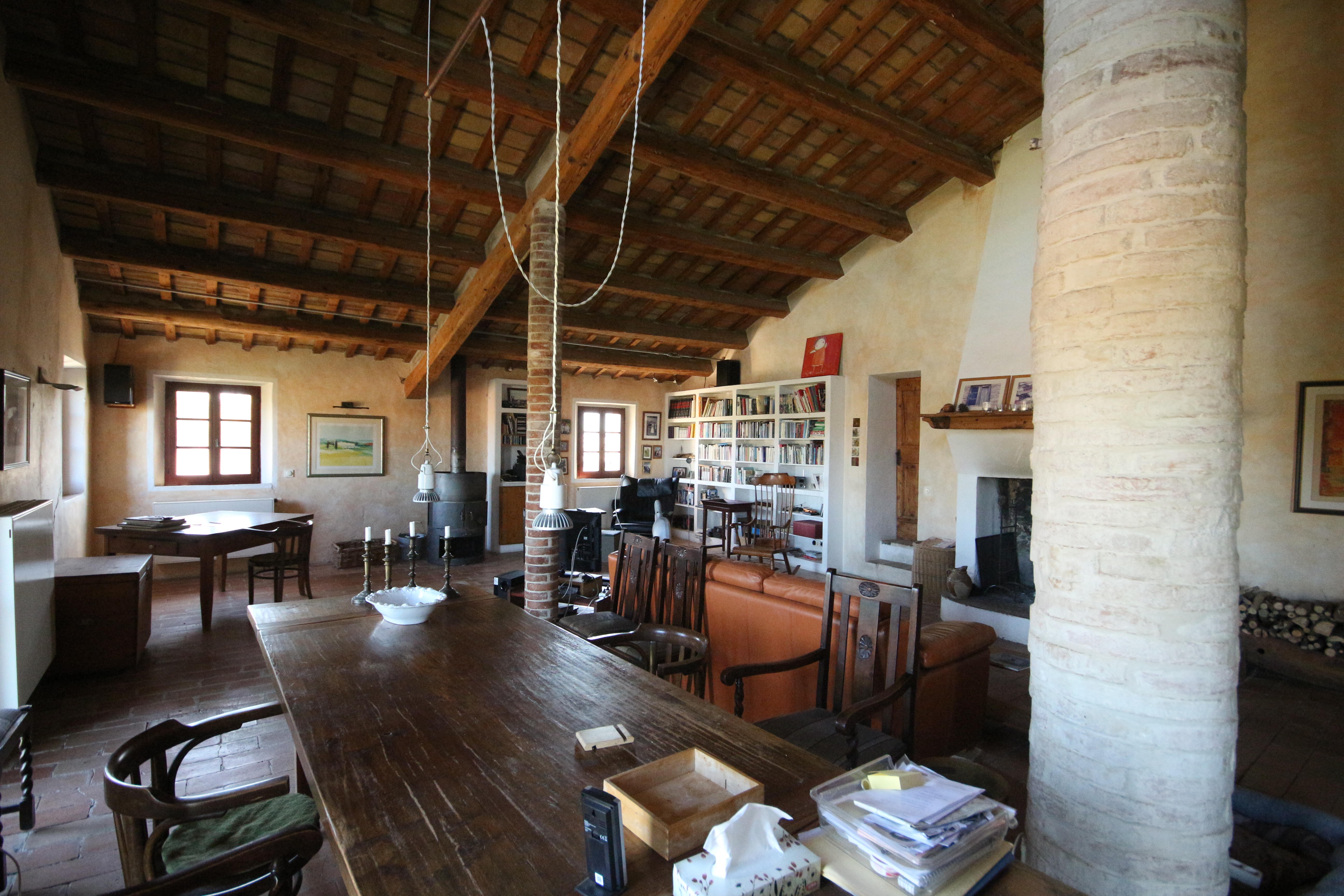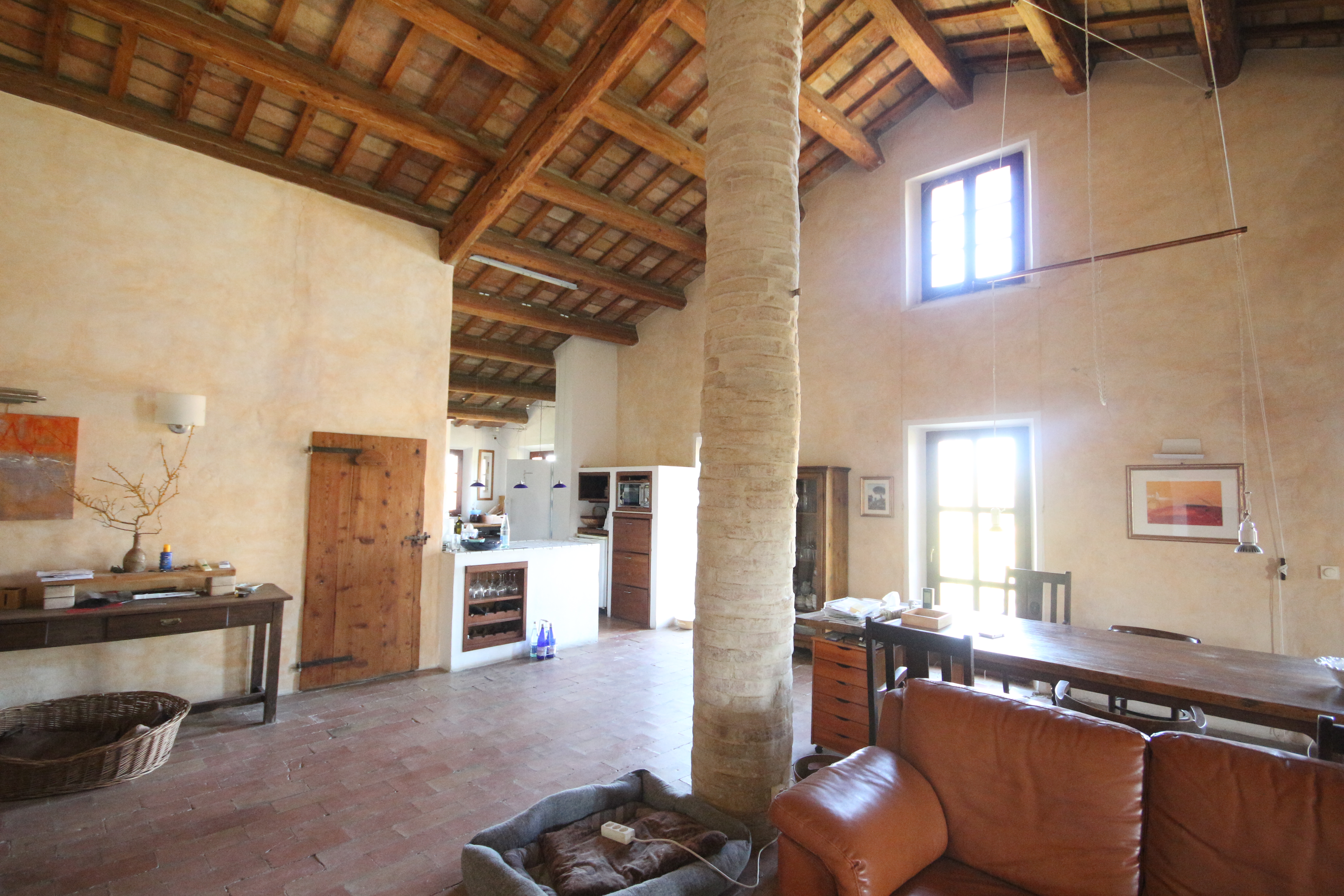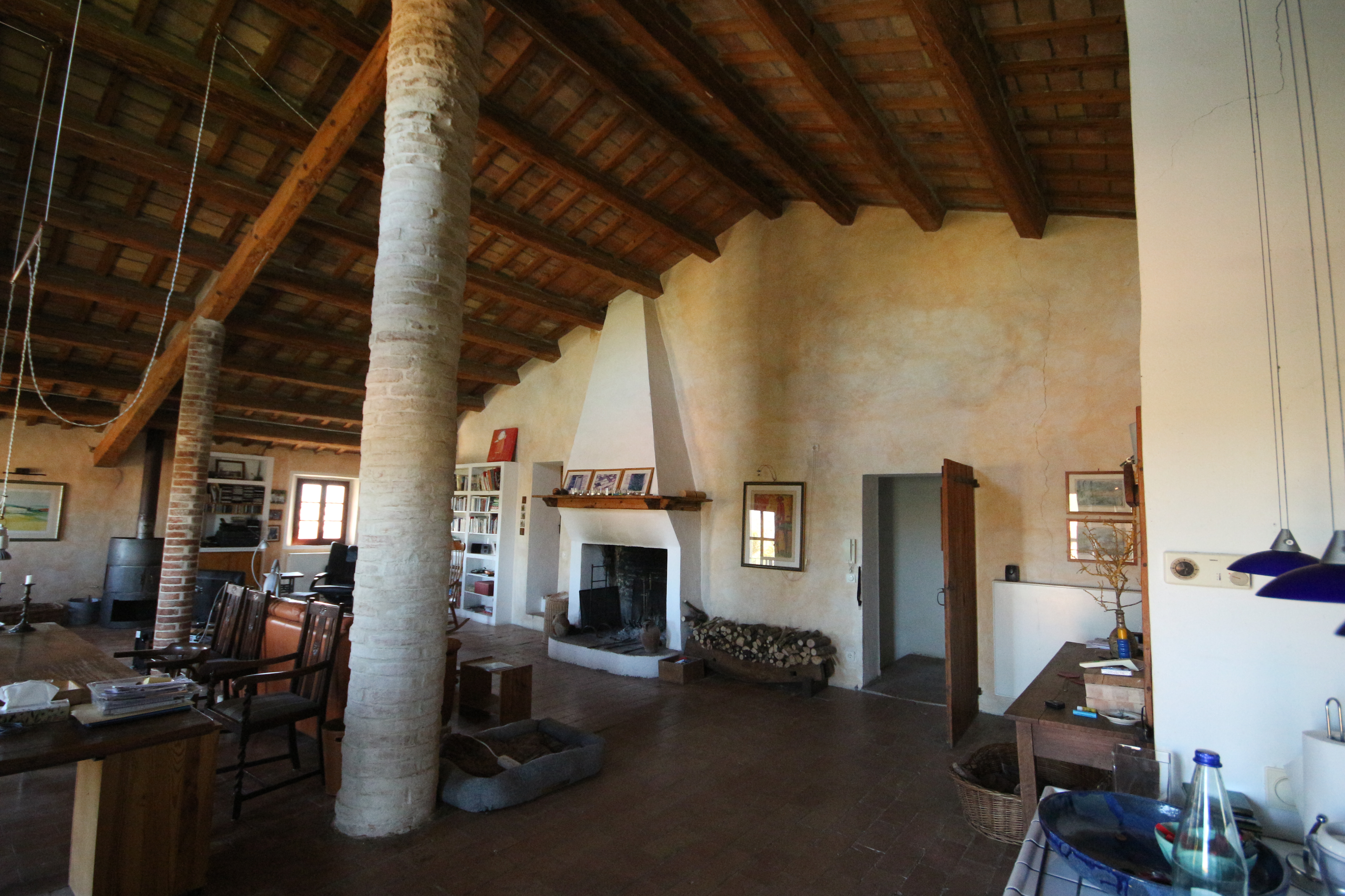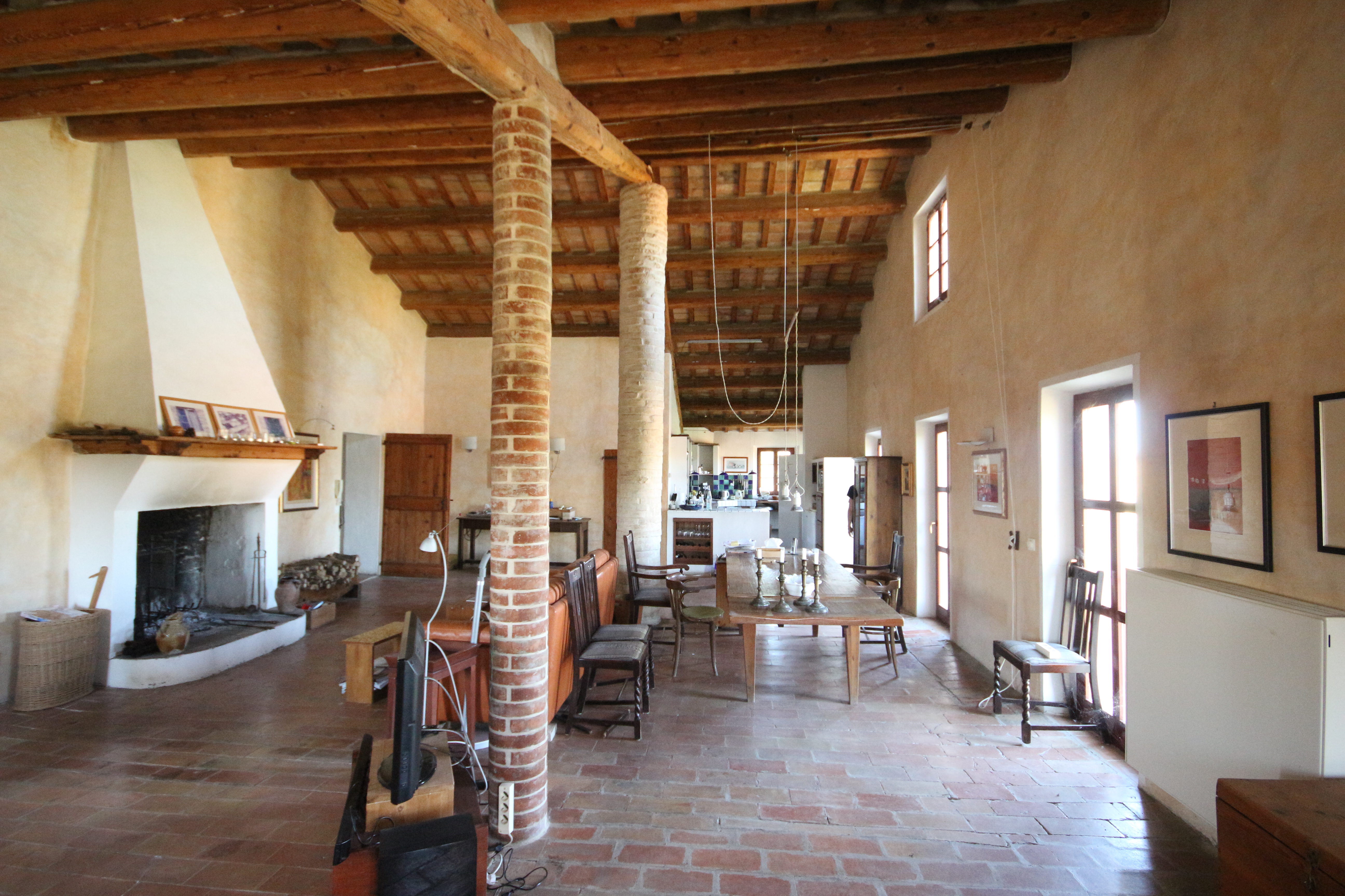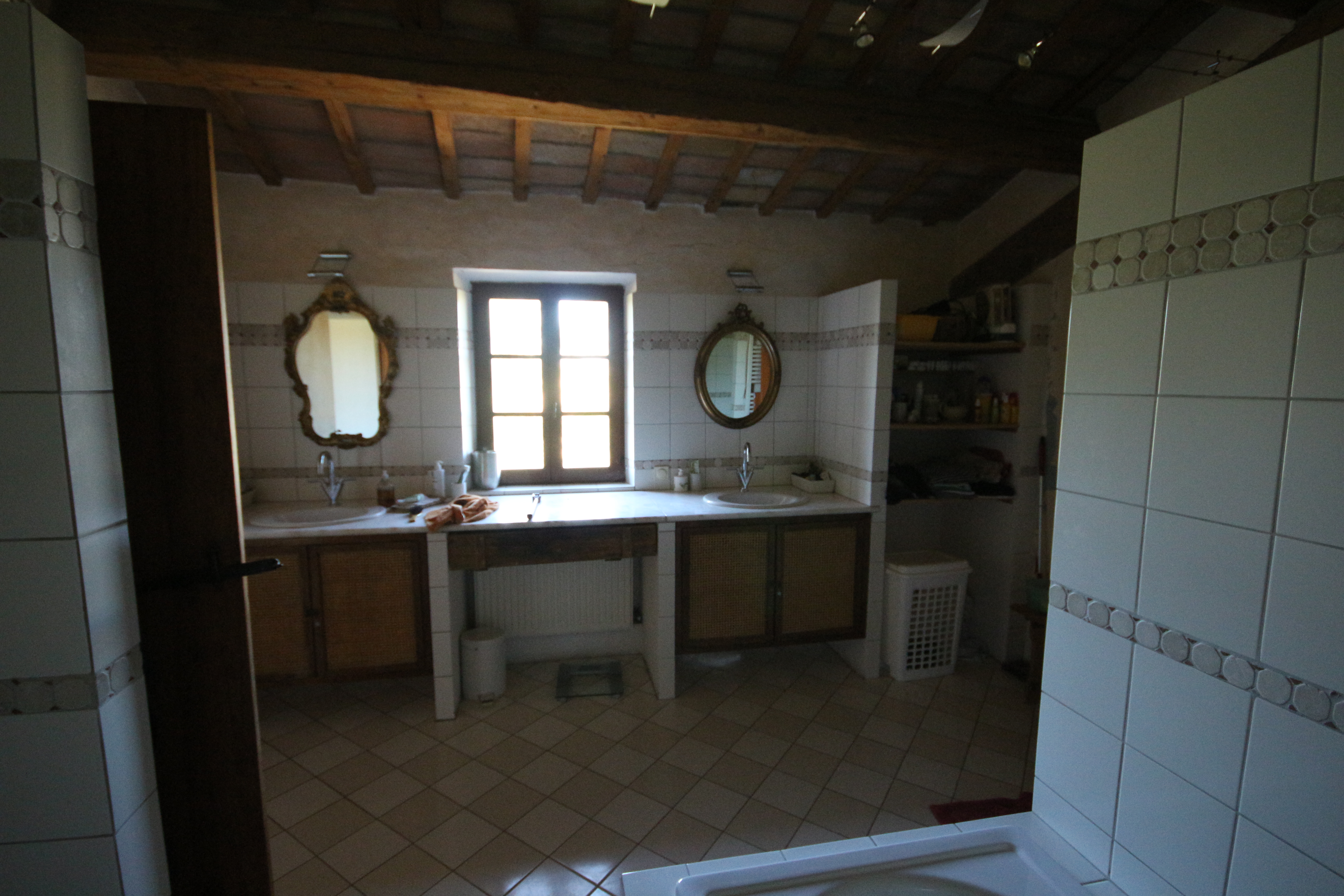 The first floor houses, on the right-hand side, an impressive 86 m² living room. Here, the generous height, the fireplace, the cast-iron stove and the beautiful ceiling with wooden beams and terracotta tiles immediately stand out. The master bedroom has a loft, a walk-in wardrobe and a private bathroom with double washbasin. There is also a comfortable guest room with a private bathroom, accessible from the living room.