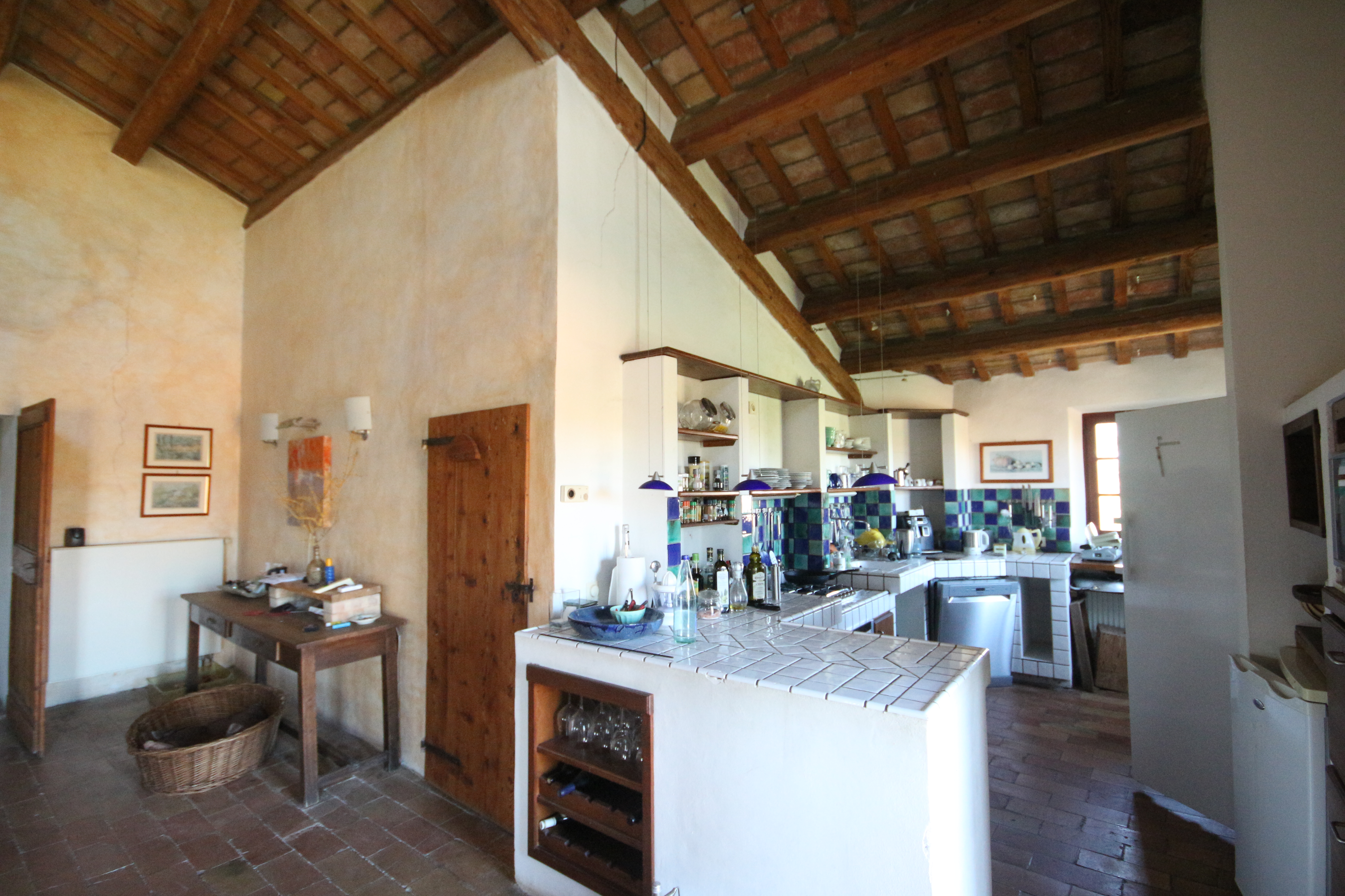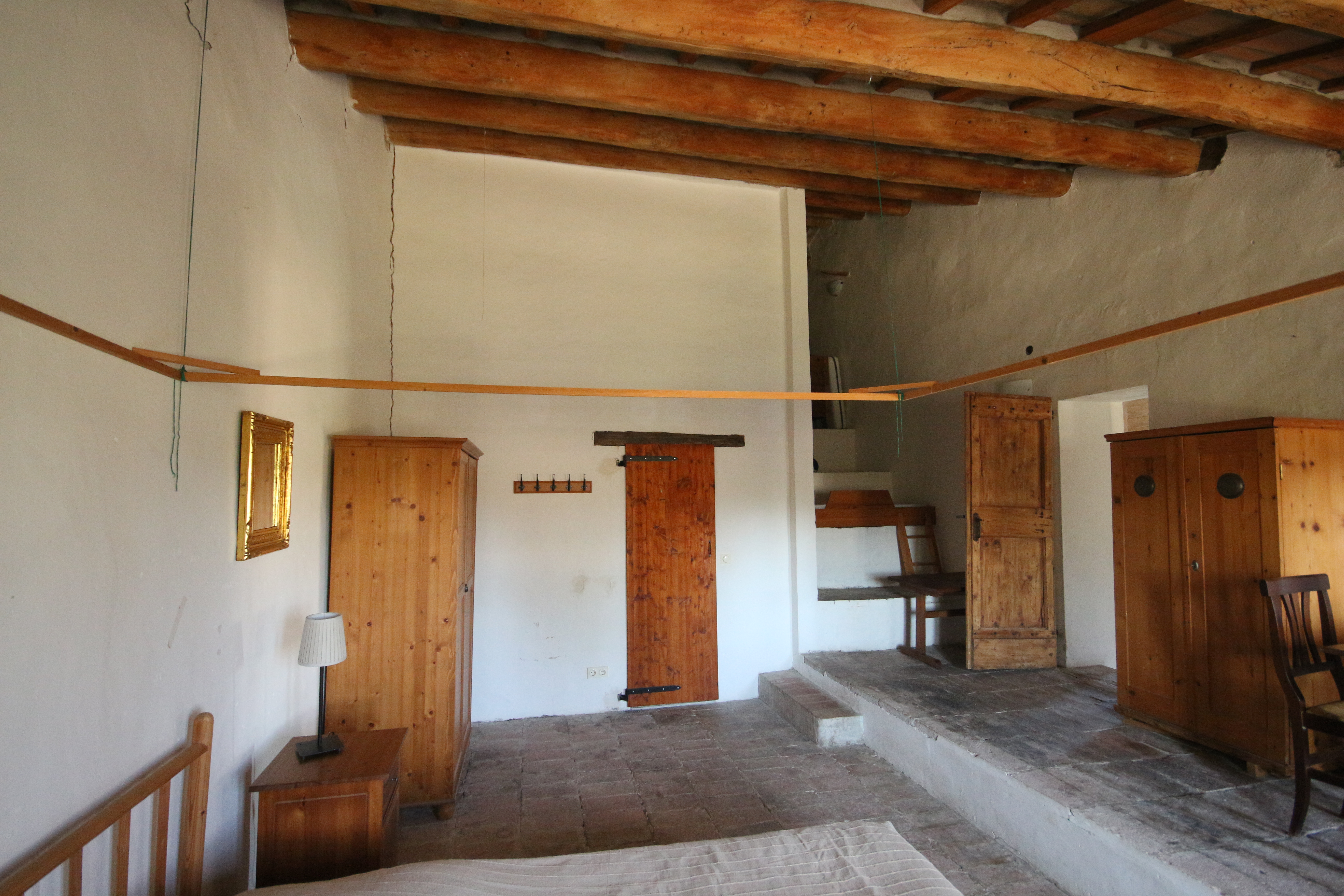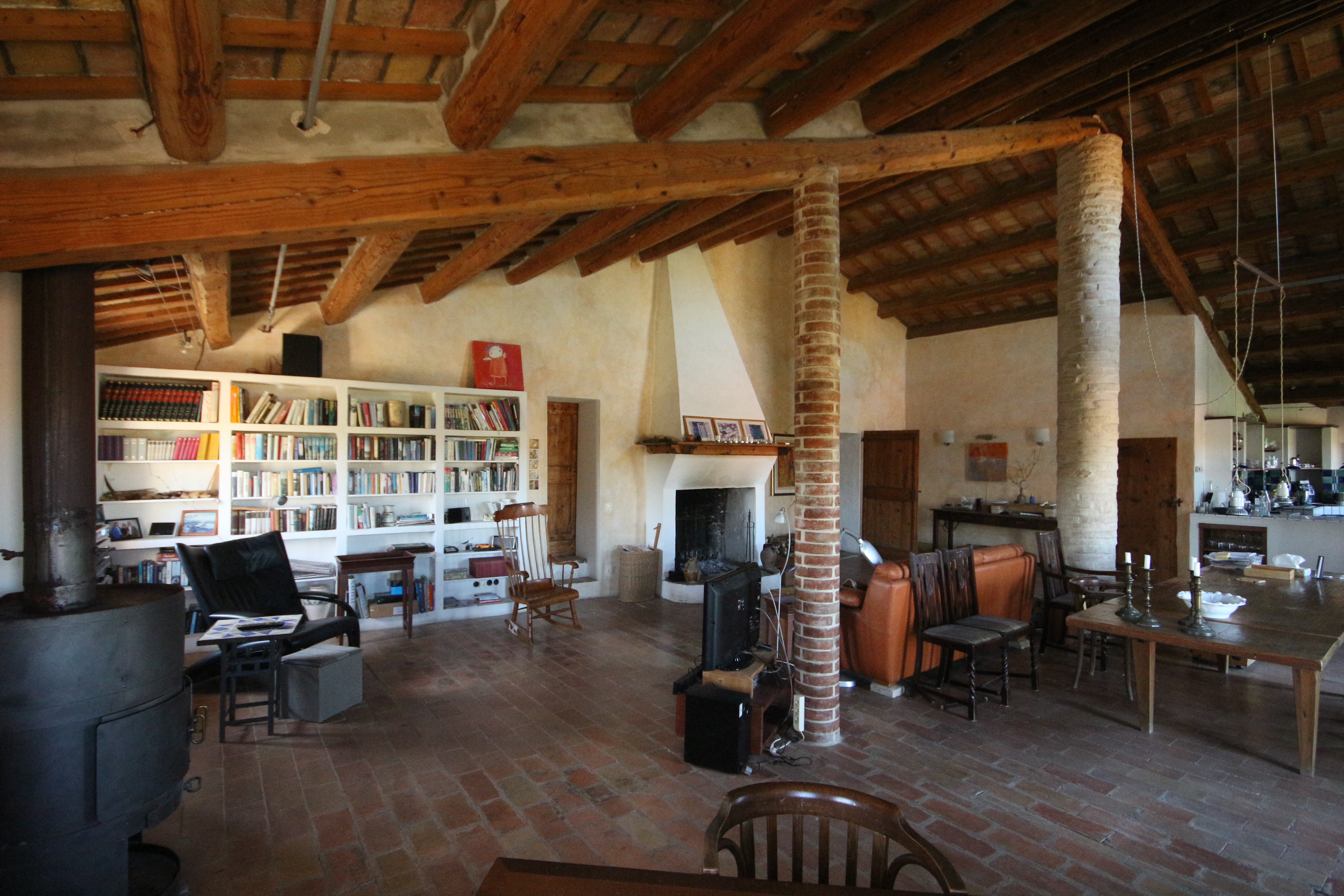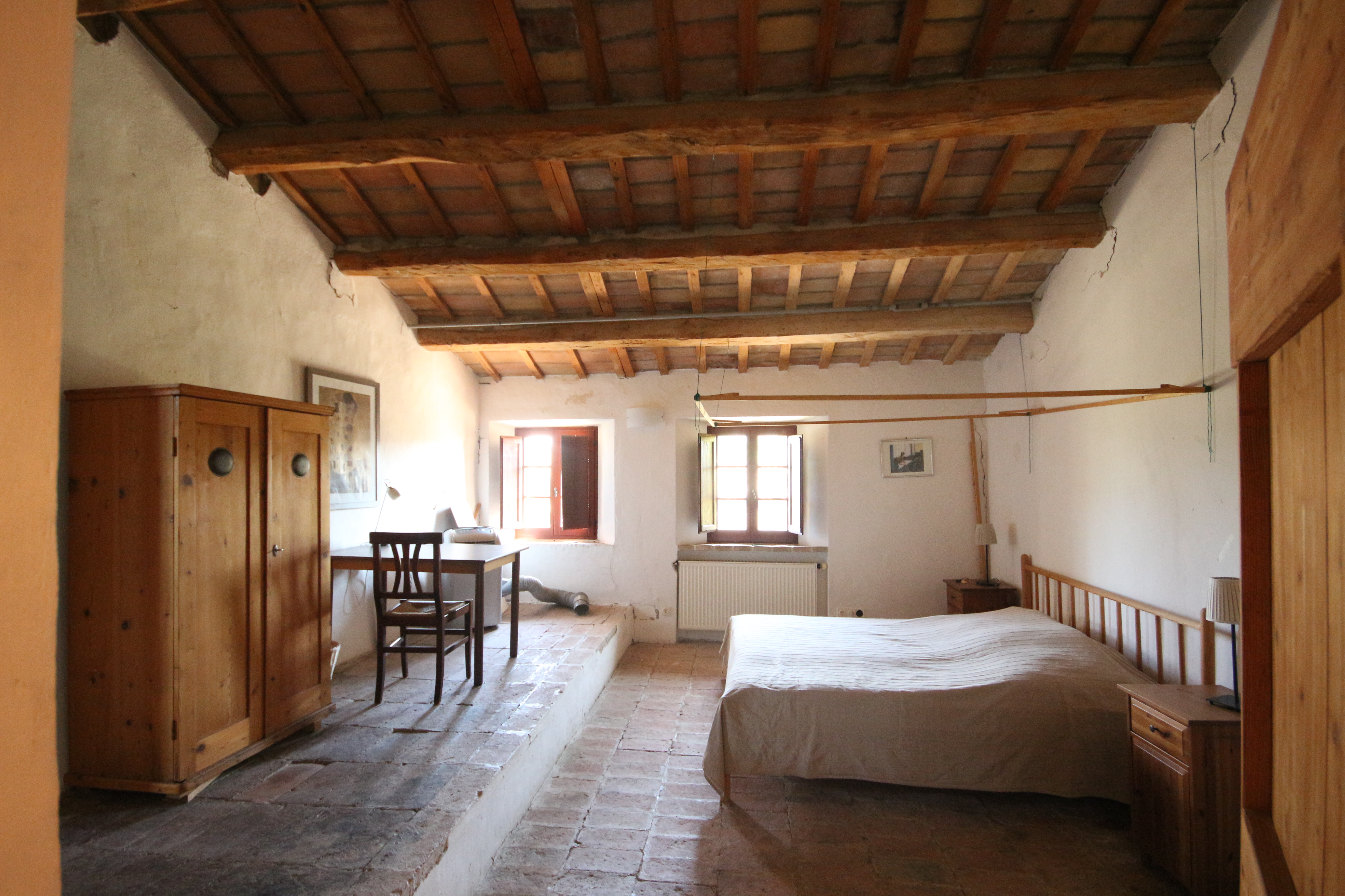The first floor houses, on the right-hand side, an impressive 86 m² living room. Here, the generous height, the fireplace, the cast-iron stove and the beautiful ceiling with wooden beams and terracotta tiles immediately stand out. The master bedroom has a loft, a walk-in wardrobe and a private bathroom with double washbasin. There is also a comfortable guest room with a private bathroom, accessible from the living room.