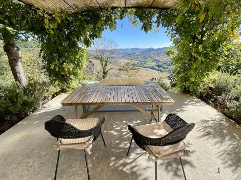 Beautifully restored stone house for sale between Montefalcone Appennino and Santa Vittoria in Matenano, offering stunning panoramic views, a private 2,000 m² garden, elegant interiors, and multiple outdoor terraces. Fully furnished and ready to enjoy.