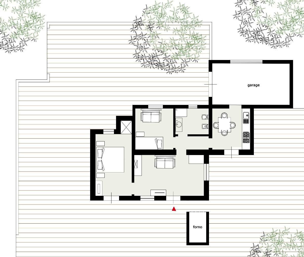 The property is entirely located on the ground floor and offers bright, well-organized spaces. It consists of two spacious bedrooms, a functional bathroom, a practical kitchenette, and a large living room with a characteristic stone fireplace, perfect for creating a cozy atmosphere all year round.