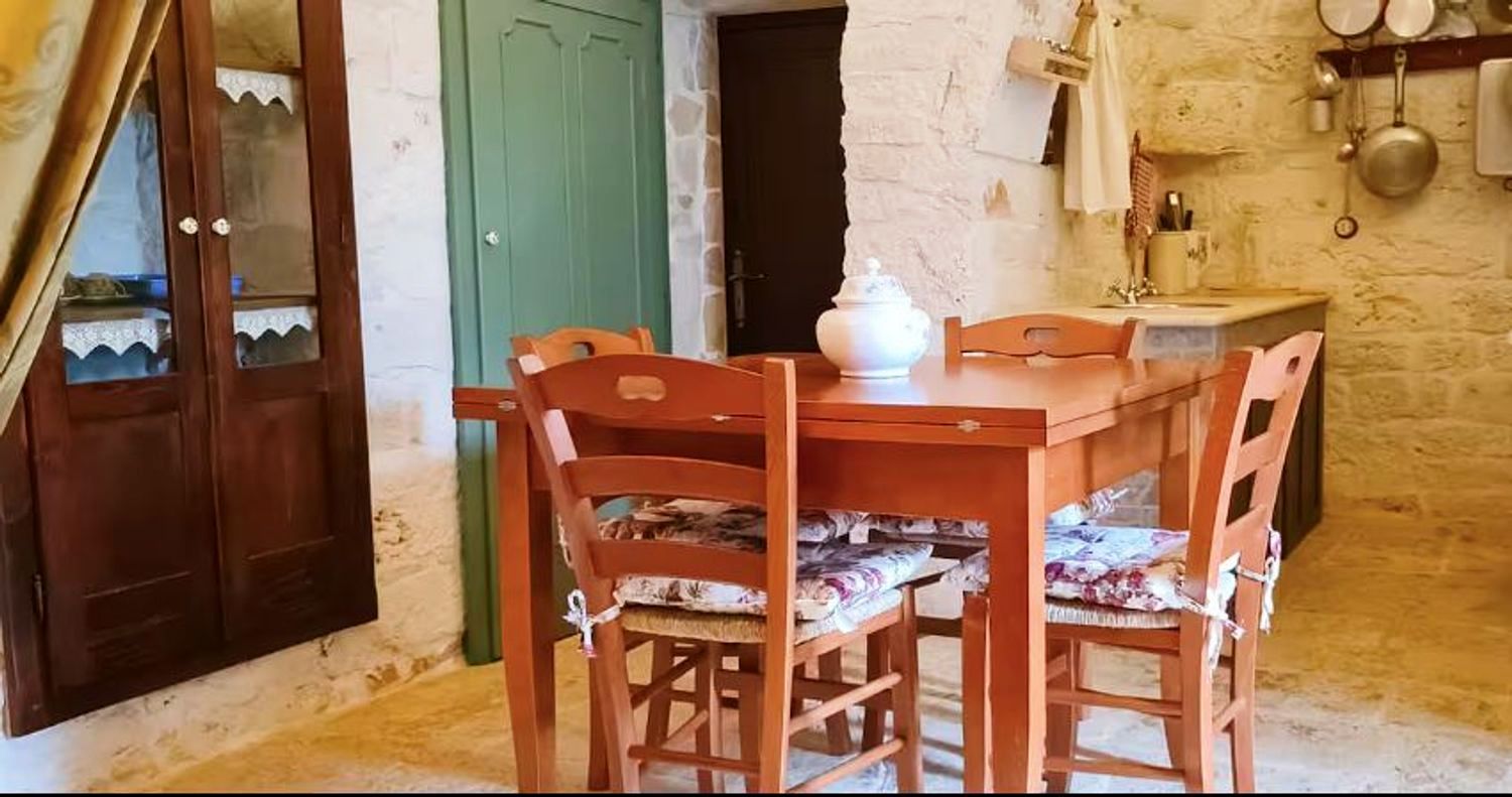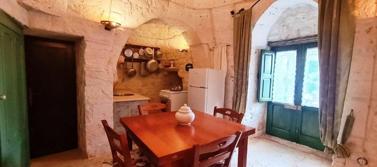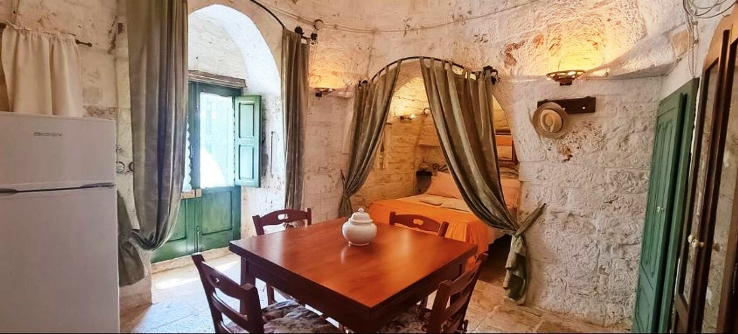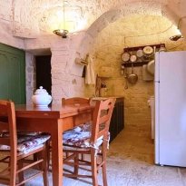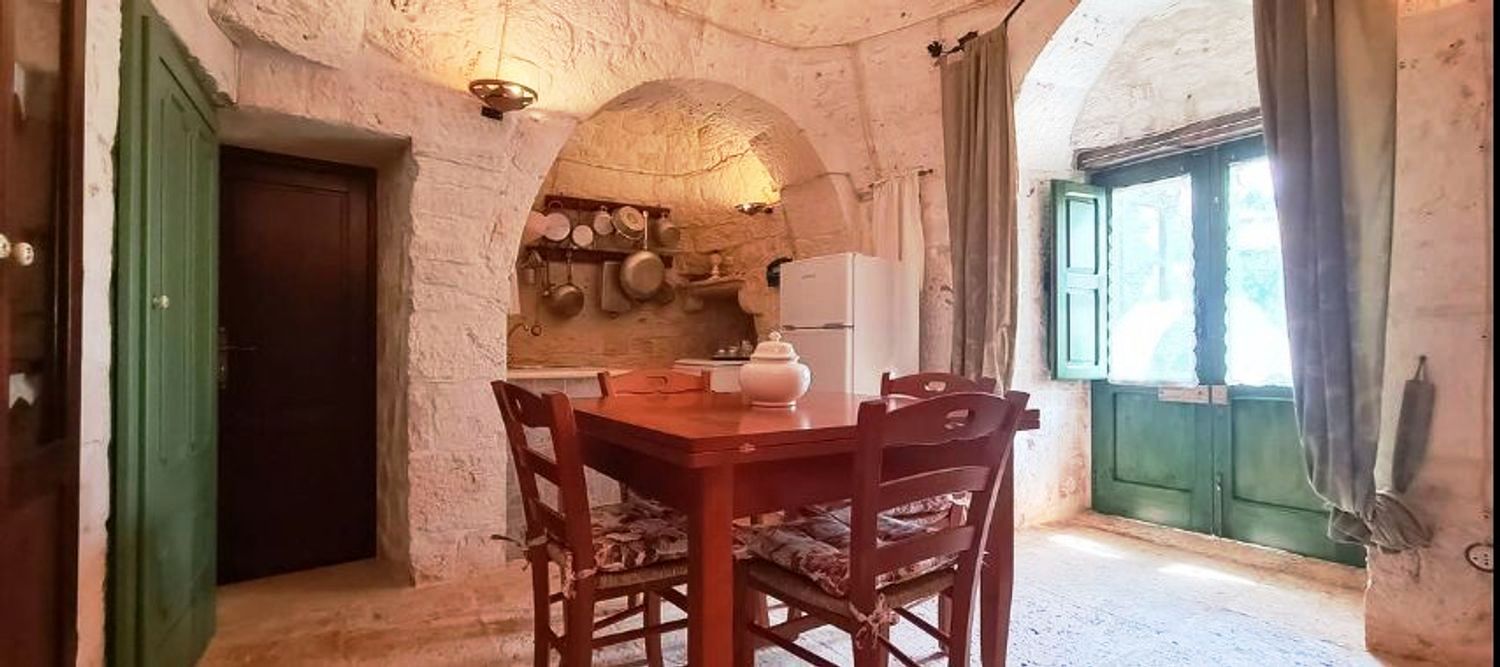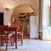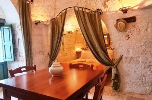 With respect for the rural architecture of that period, the trullo has been restored and brought back to its former glory. Inside, you'll find the beautiful original "chianche" floor, with its exposed stone cones and wooden elements and alcoves, where the colors blend together in an incredible interplay, just like in times gone by. You'll almost feel like you're back where the people lived 200 years ago.