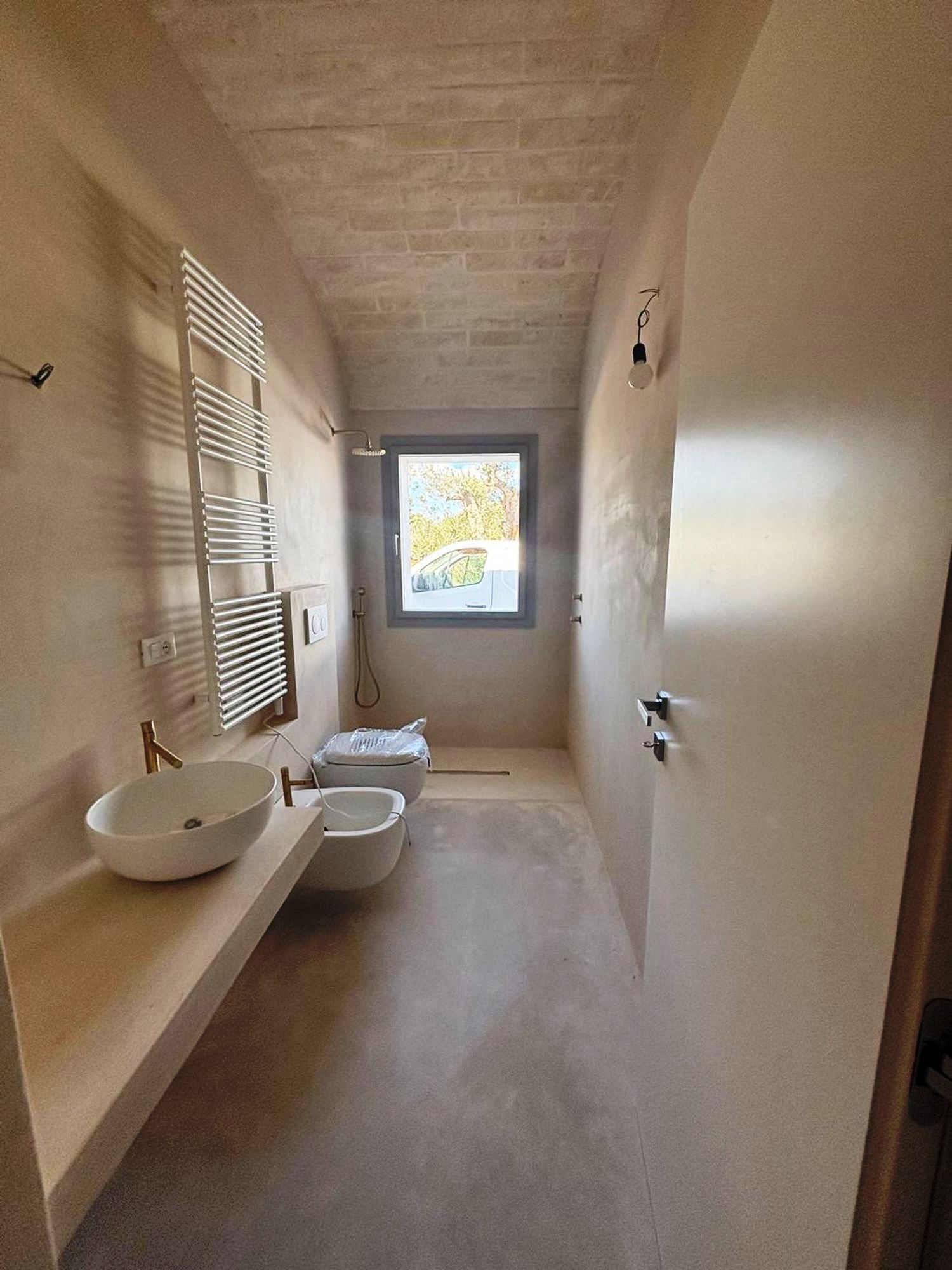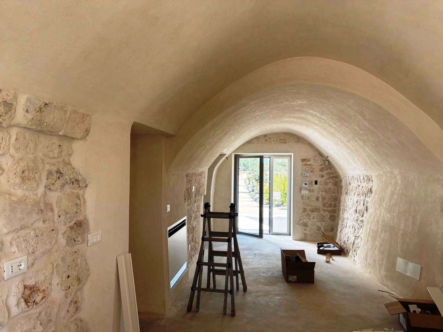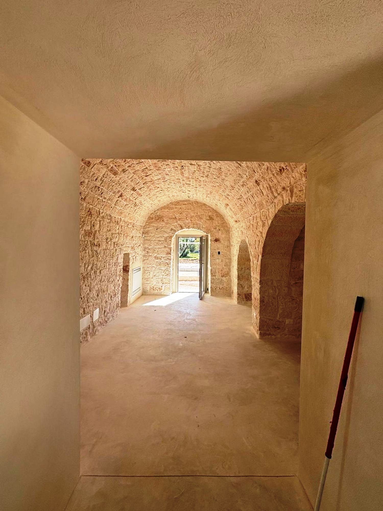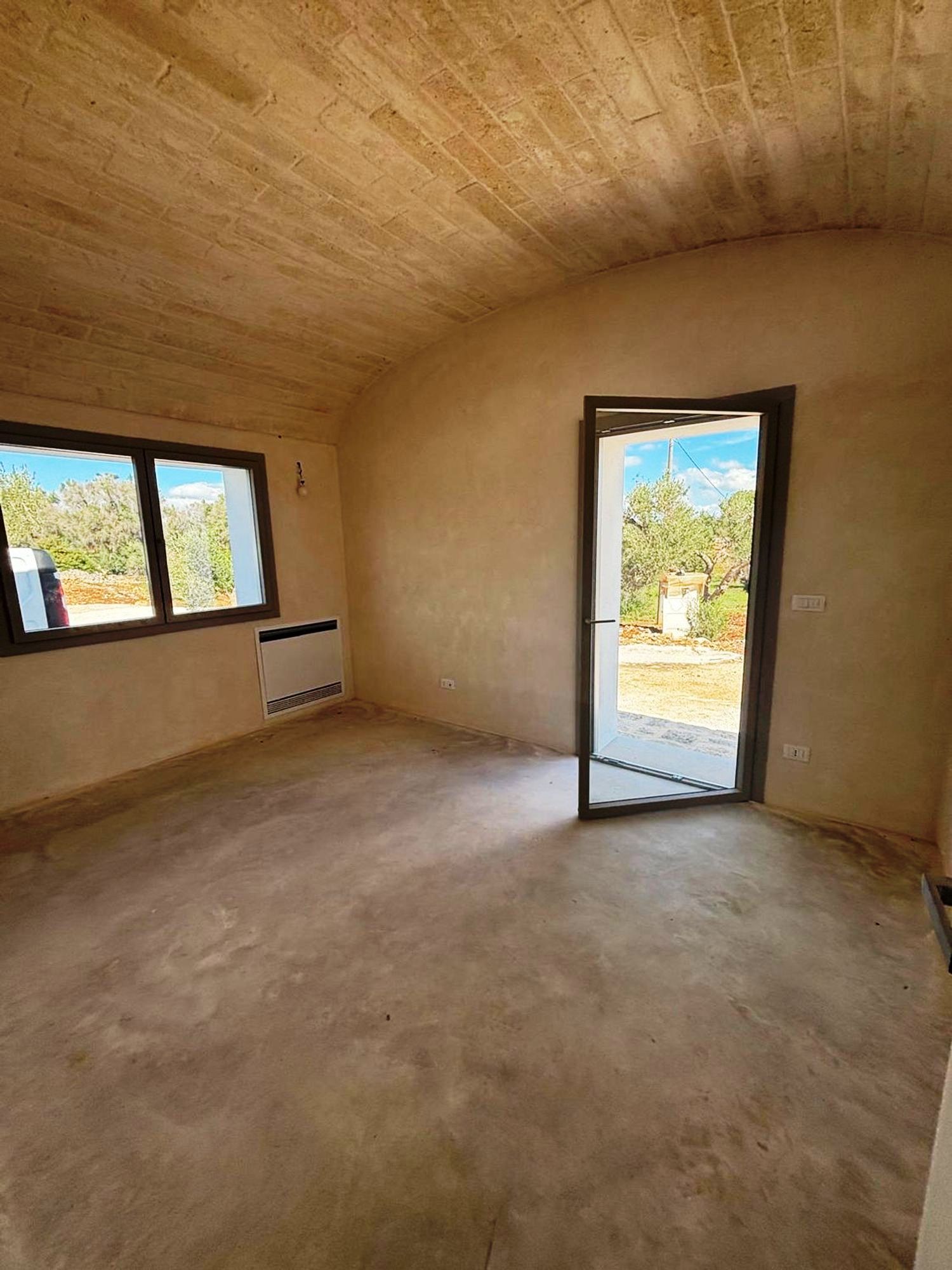 It also features state-of-the-art technology, including thermally insulated PVC windows and doors with double glazing, wall-hung sanitary ware, natural brass faucets, natural stone walls and ceilings, flush interior doors, resin flooring, a pergola with a kitchen corner, a courtyard with typical "chianche" (natural stone paving), a heat pump system for plumbing and heating, an internal heating/cooling system with fan coils, a 6 kW photovoltaic system, an automated Corten gate, an alarm system with video surveillance, an electric car charging station, an artesian well, and outdoor lighting.