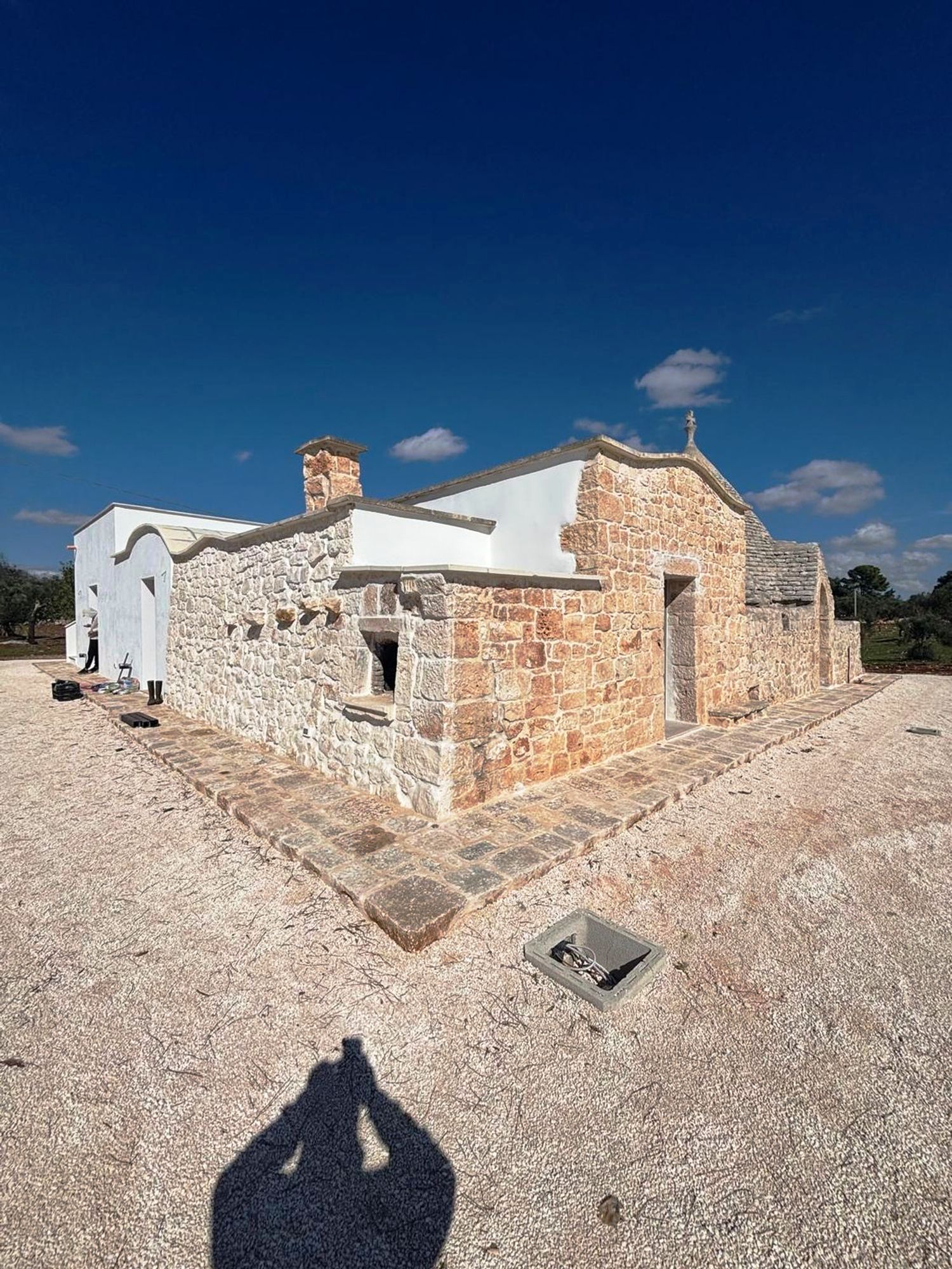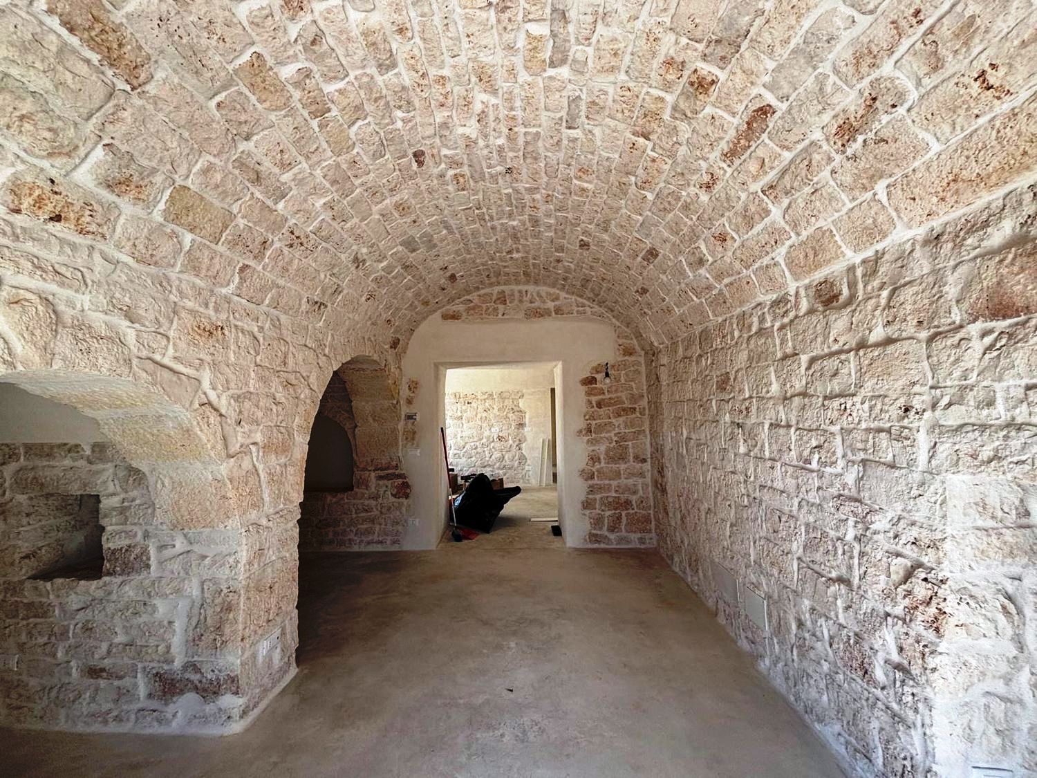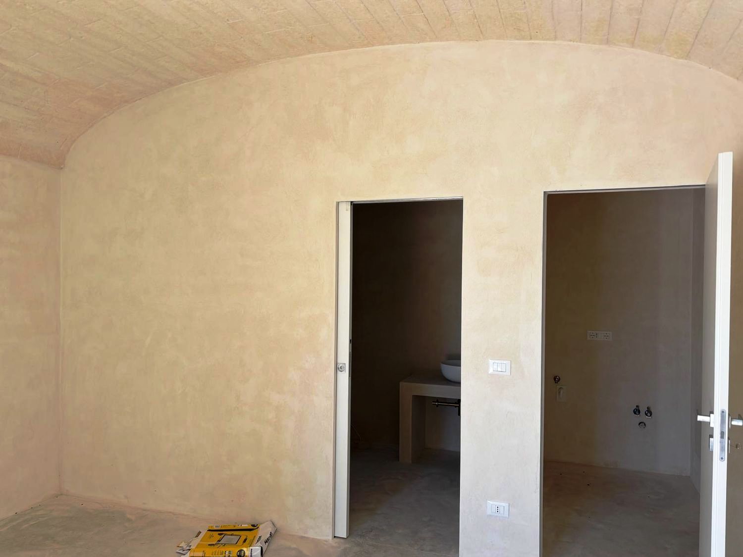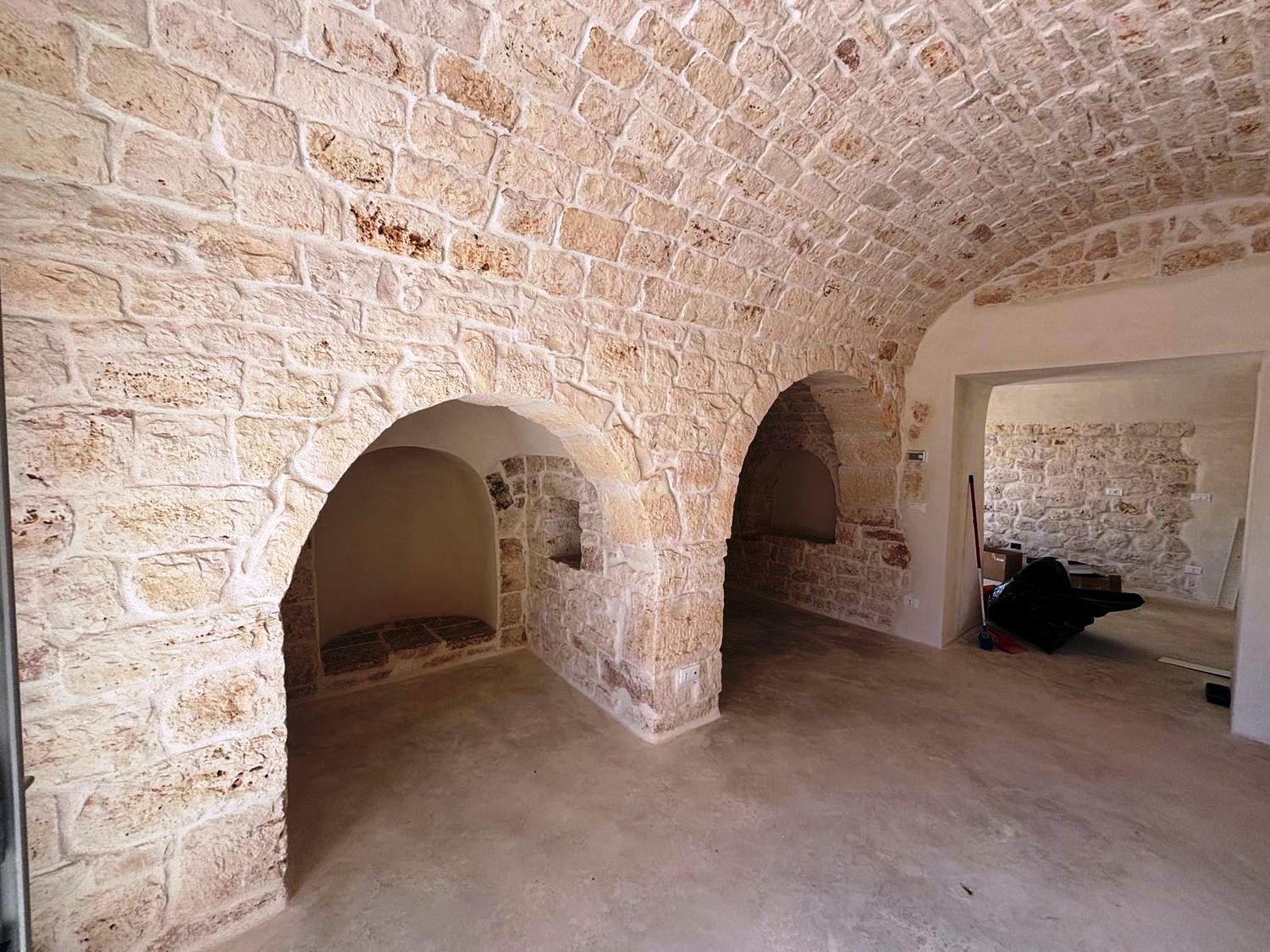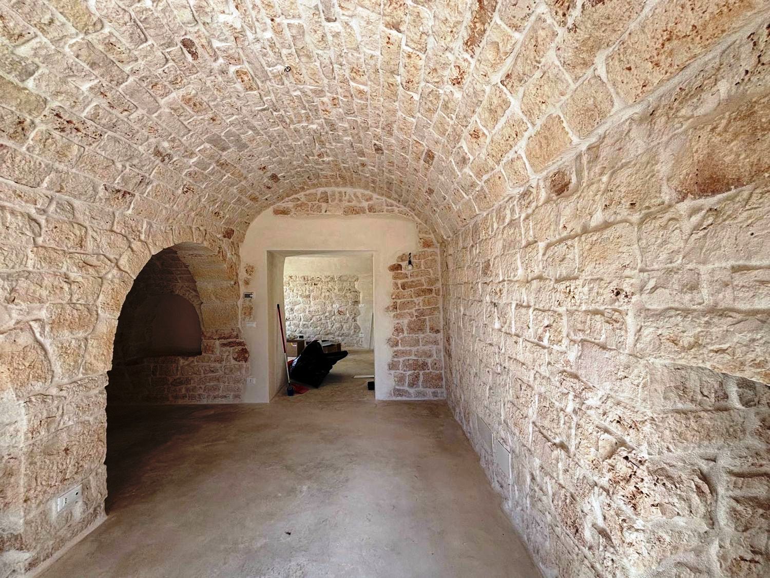 It also features state-of-the-art technology, including thermally insulated PVC windows and doors with double glazing, wall-hung sanitary ware, natural brass faucets, natural stone walls and ceilings, flush interior doors, resin flooring, a pergola with a kitchen corner, a courtyard with typical "chianche" (natural stone paving), a heat pump system for plumbing and heating, an internal heating/cooling system with fan coils, a 6 kW photovoltaic system, an automated Corten gate, an alarm system with video surveillance, an electric car charging station, an artesian well, and outdoor lighting.