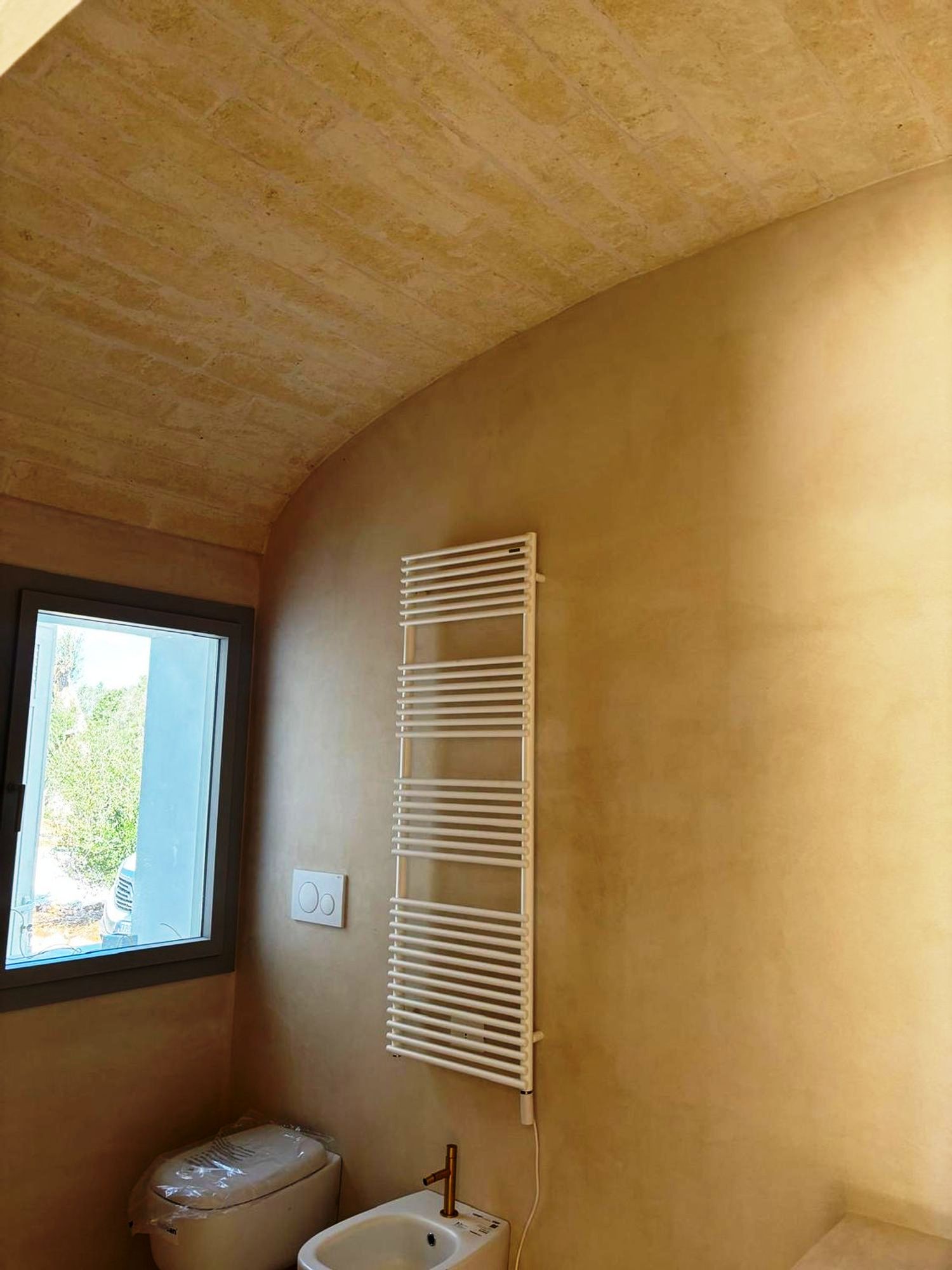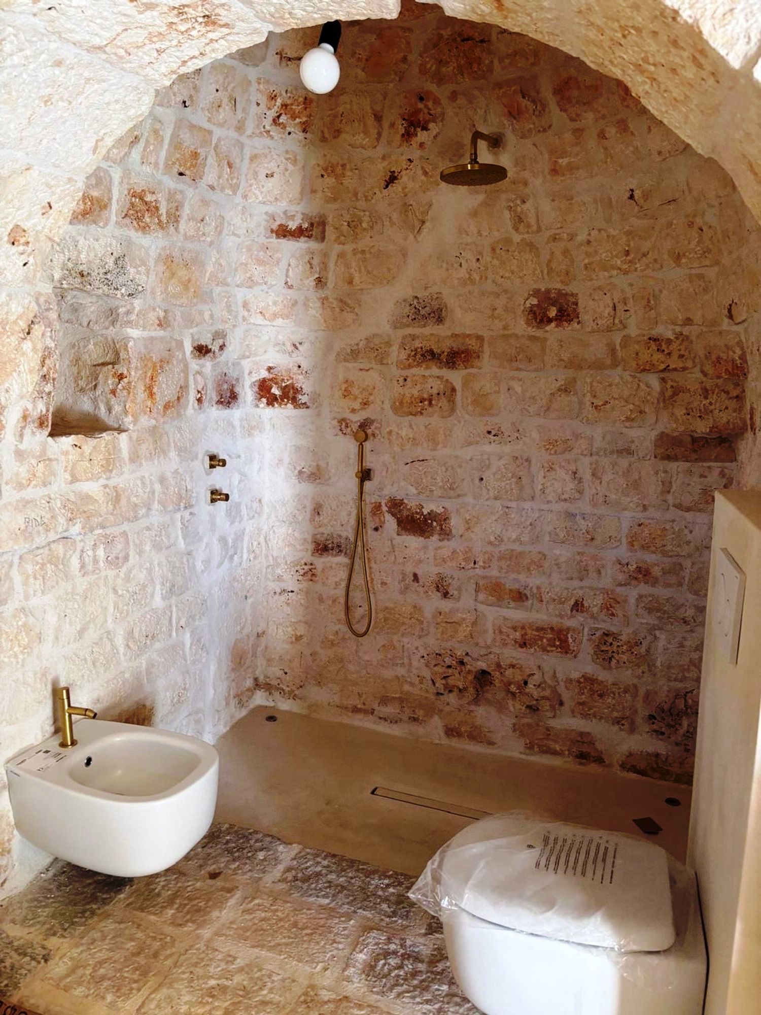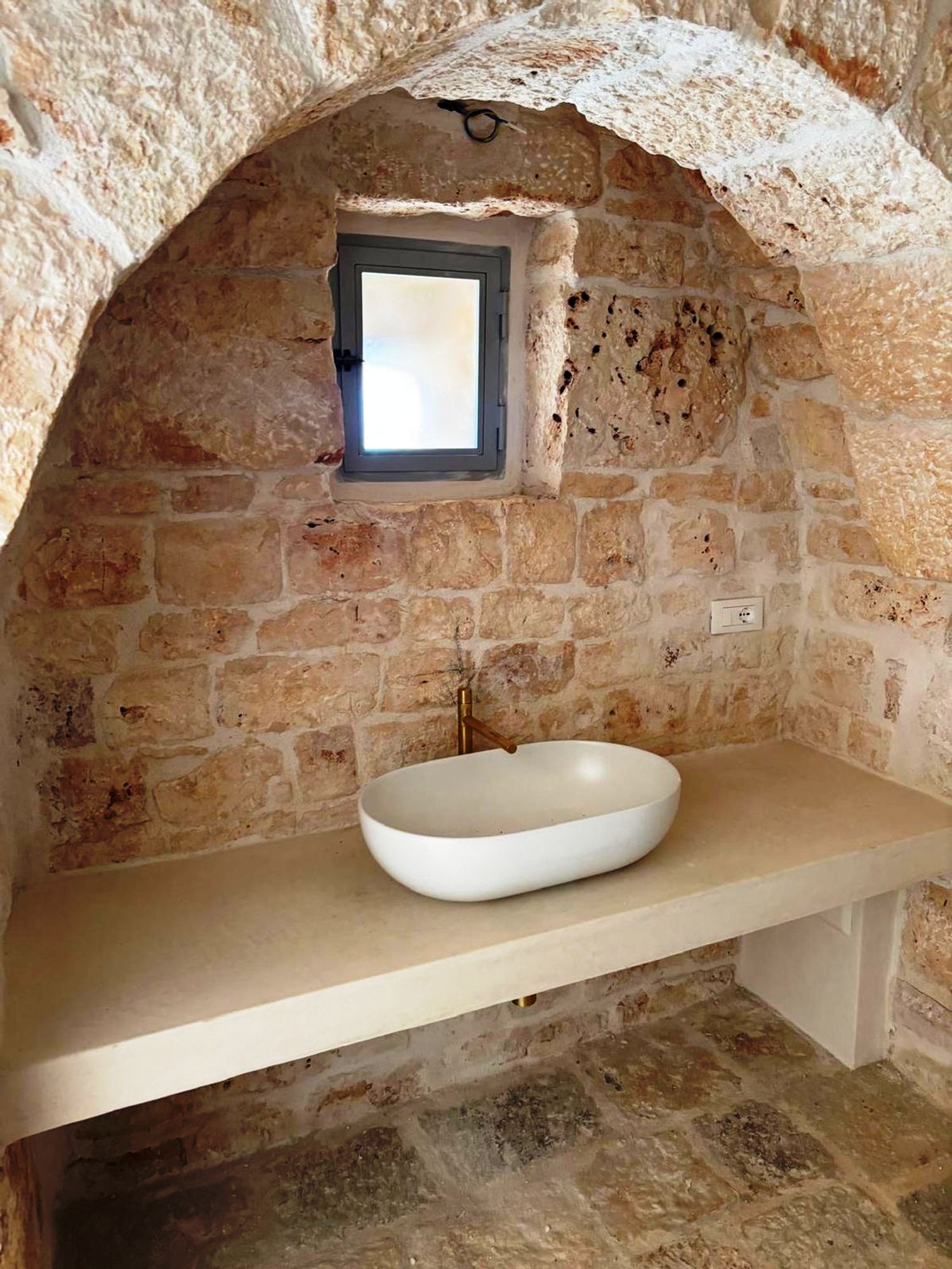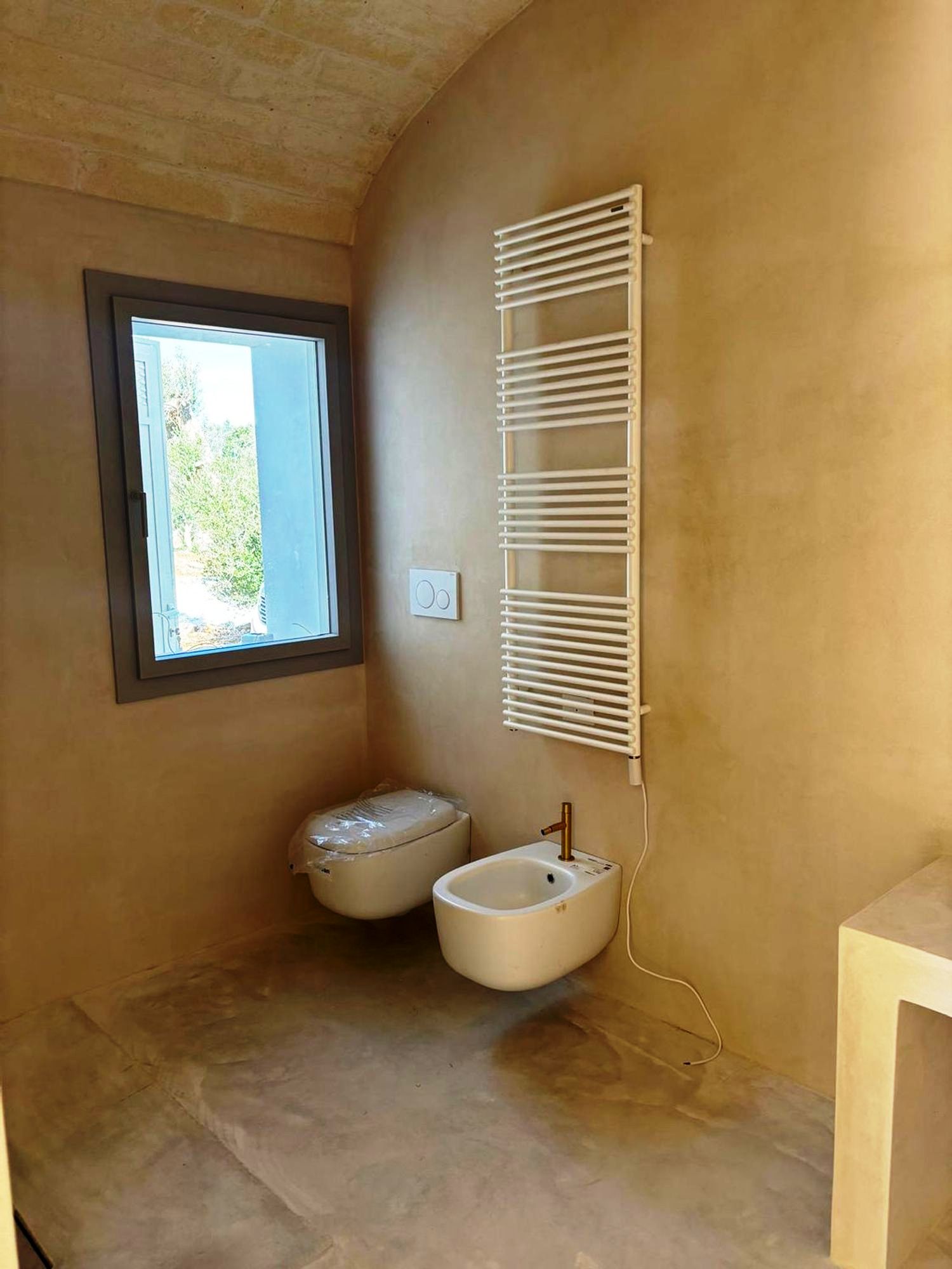 It also features state-of-the-art technology, including thermally insulated PVC windows and doors with double glazing, wall-hung sanitary ware, natural brass faucets, natural stone walls and ceilings, flush interior doors, resin flooring, a pergola with a kitchen corner, a courtyard with typical "chianche" (natural stone paving), a heat pump system for plumbing and heating, an internal heating/cooling system with fan coils, a 6 kW photovoltaic system, an automated Corten gate, an alarm system with video surveillance, an electric car charging station, an artesian well, and outdoor lighting.
