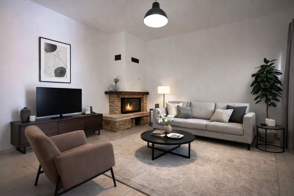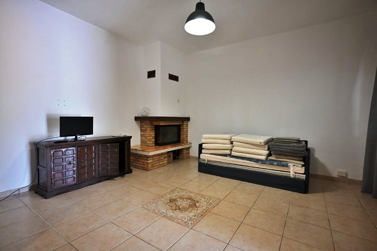 Inside, the property boasts a bright and welcoming living room with fireplace, connected to the kitchen-diner. A functional hallway leads to the sleeping area, which includes two bedrooms and two bathrooms—an ideal layout also suitable for guests or holiday rentals.