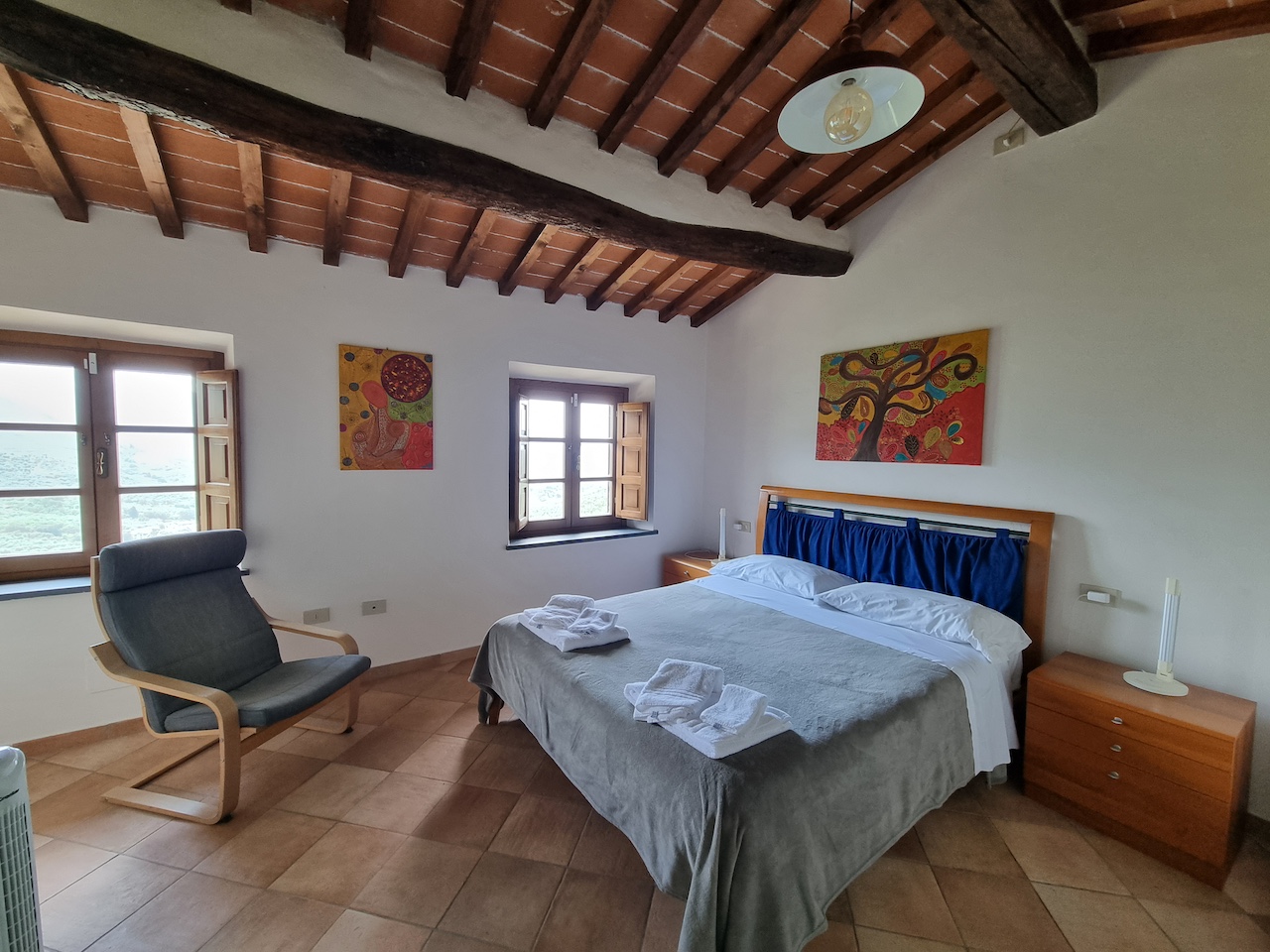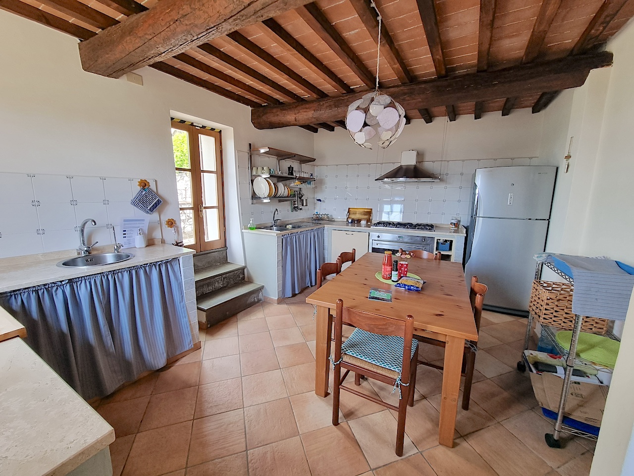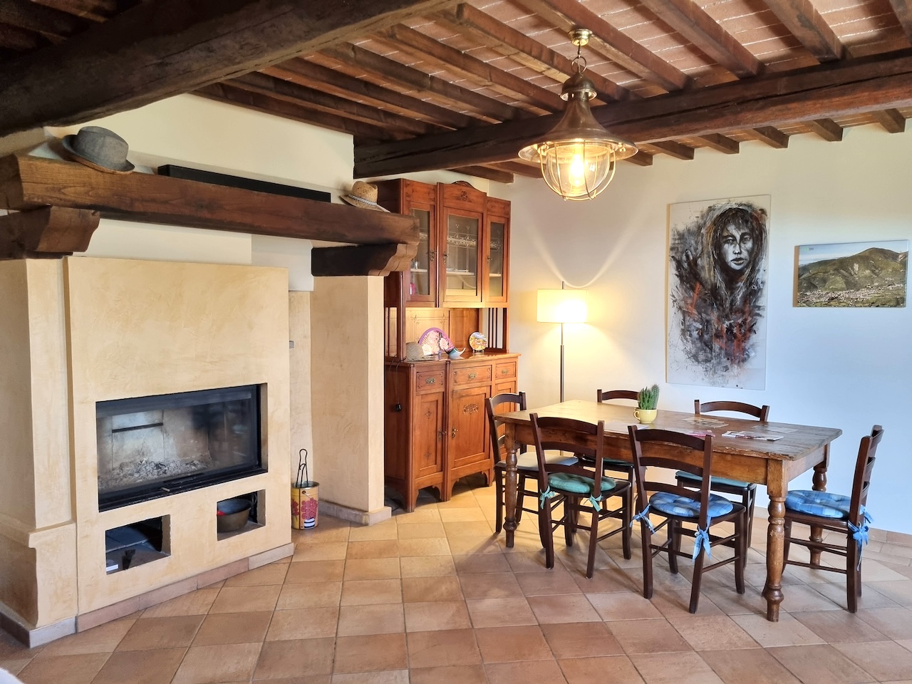 The house has two floors with different entrances and a pleasant and functional layout. On the ground floor, there is a double living room where the current owners have placed a billiard table and a piano. The typical Tuscan exposed beam ceiling creates a very evocative atmosphere. A step leads to the cozy living room with fireplace and then to the kitchen, which, through French windows, gives access to the large covered terrace with panoramic views. There is also a bathroom on the ground floor. A convenient staircase leads to the upper floor with 4 bedrooms. The master bedroom and a second bedroom have private en-suite bathrooms, while the other 2 bedrooms share a bathroom. Every window in the house offers a priceless view.