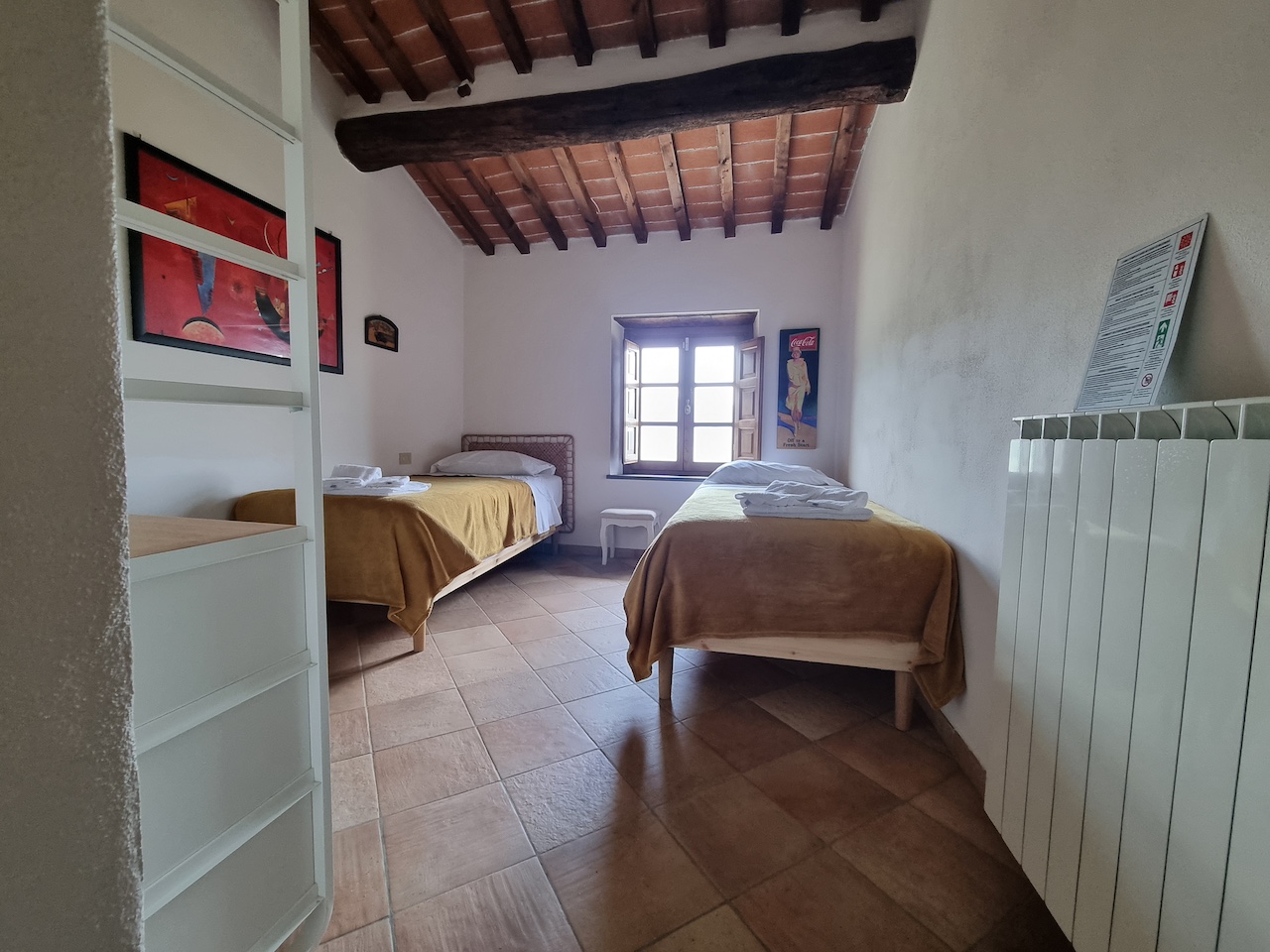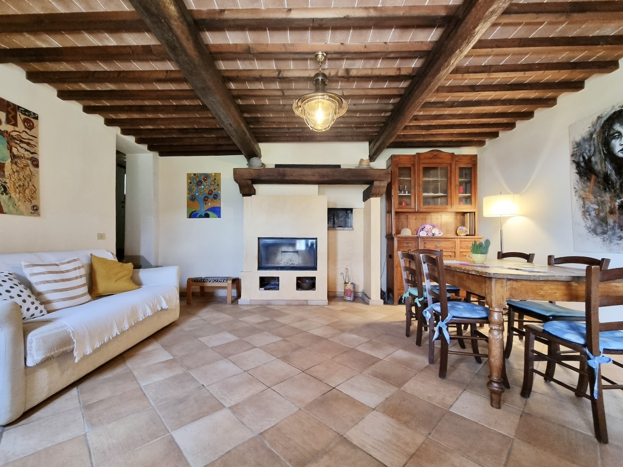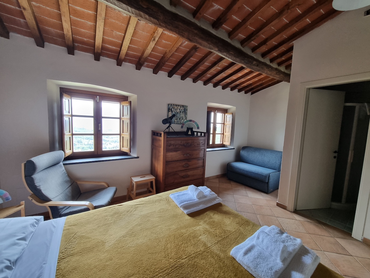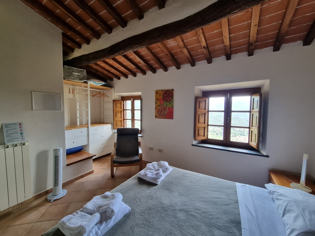 The house has two floors with different entrances and a pleasant and functional layout. On the ground floor, there is a double living room where the current owners have placed a billiard table and a piano. The typical Tuscan exposed beam ceiling creates a very evocative atmosphere. A step leads to the cozy living room with fireplace and then to the kitchen, which, through French windows, gives access to the large covered terrace with panoramic views. There is also a bathroom on the ground floor. A convenient staircase leads to the upper floor with 4 bedrooms. The master bedroom and a second bedroom have private en-suite bathrooms, while the other 2 bedrooms share a bathroom. Every window in the house offers a priceless view.
